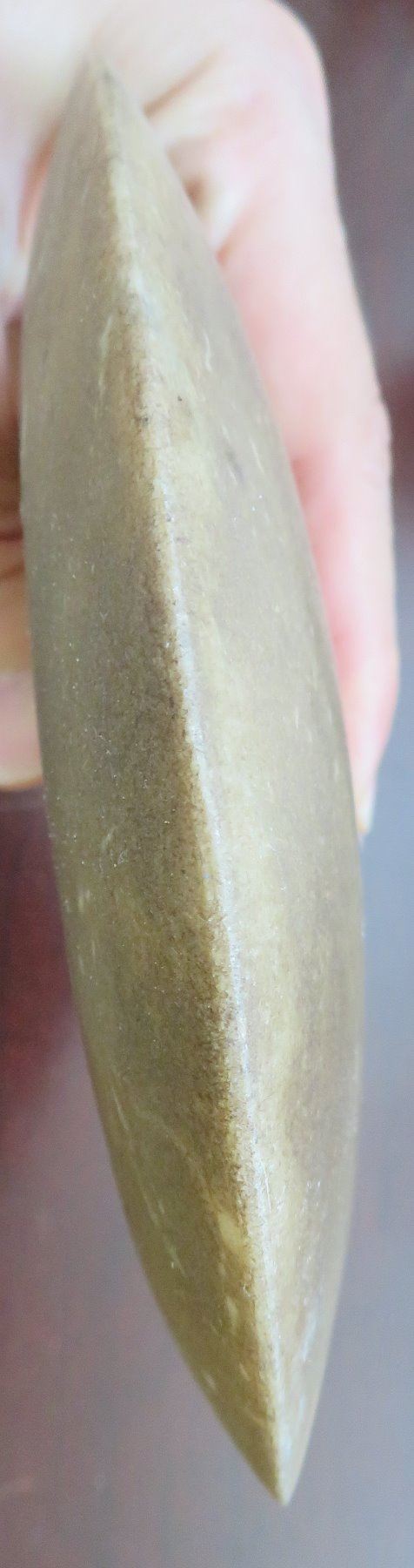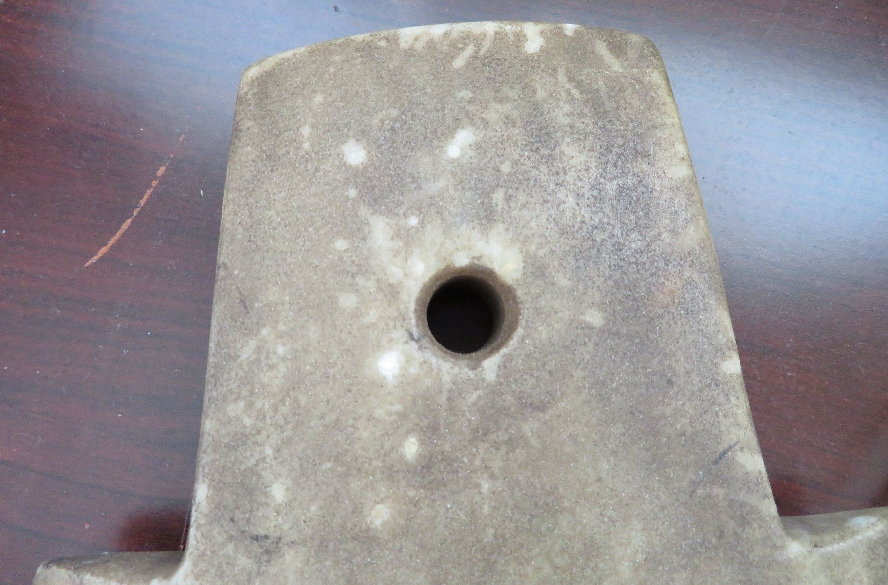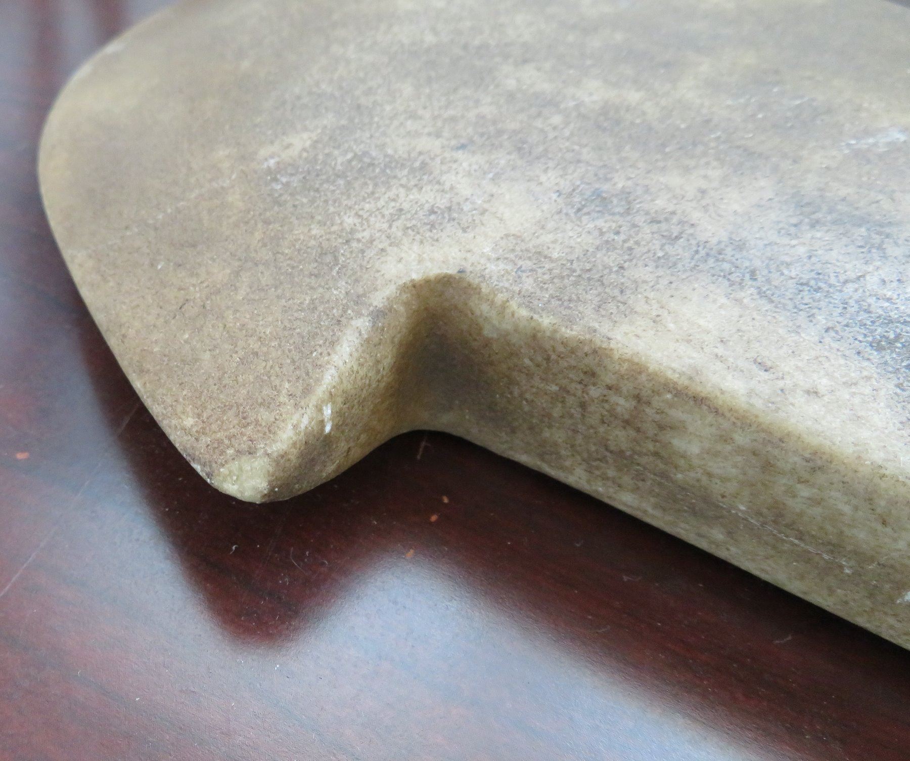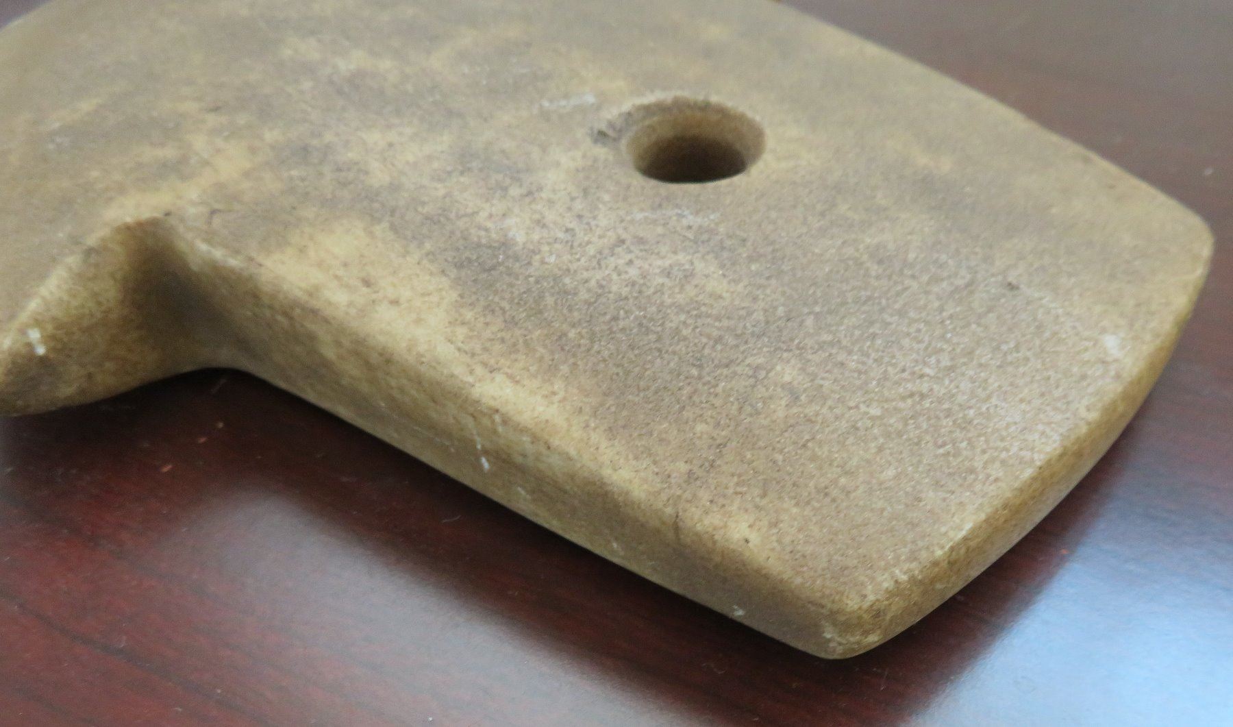 Large Drilled Spud, pre-historic item. Made of quartzite, the item measures 7 1/2" x 6" x 1". Randolph County, Indiana. Condition: Minor nicks and scrapes, see images. Shipping: $35.00 w/insurance and signature, double-boxed, due to value.