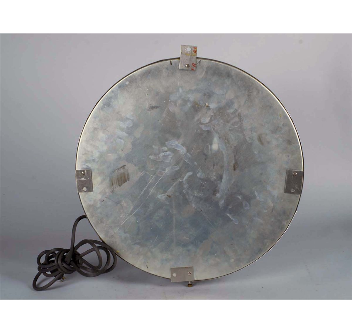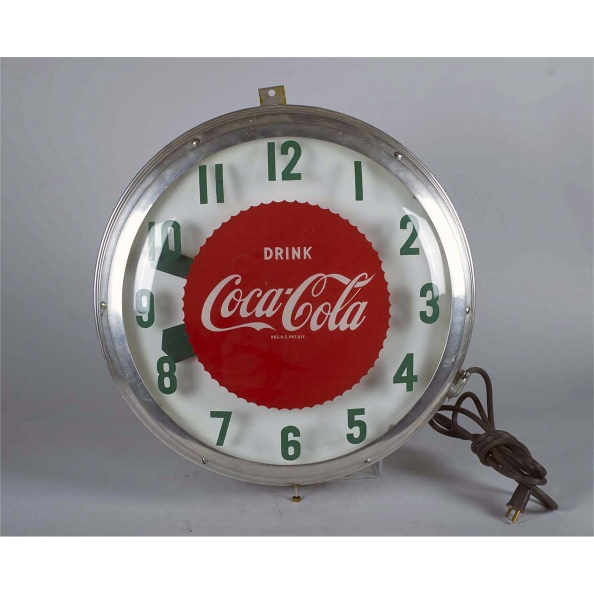 Reverse on glass light up Coke clock in metal housing, Made by Modern Clock Advertising Co of Brooklyn 8, NY. Circa 1950's, lights up and clock works. Condition (Excellent)/ Size 23" x 23" x 5"