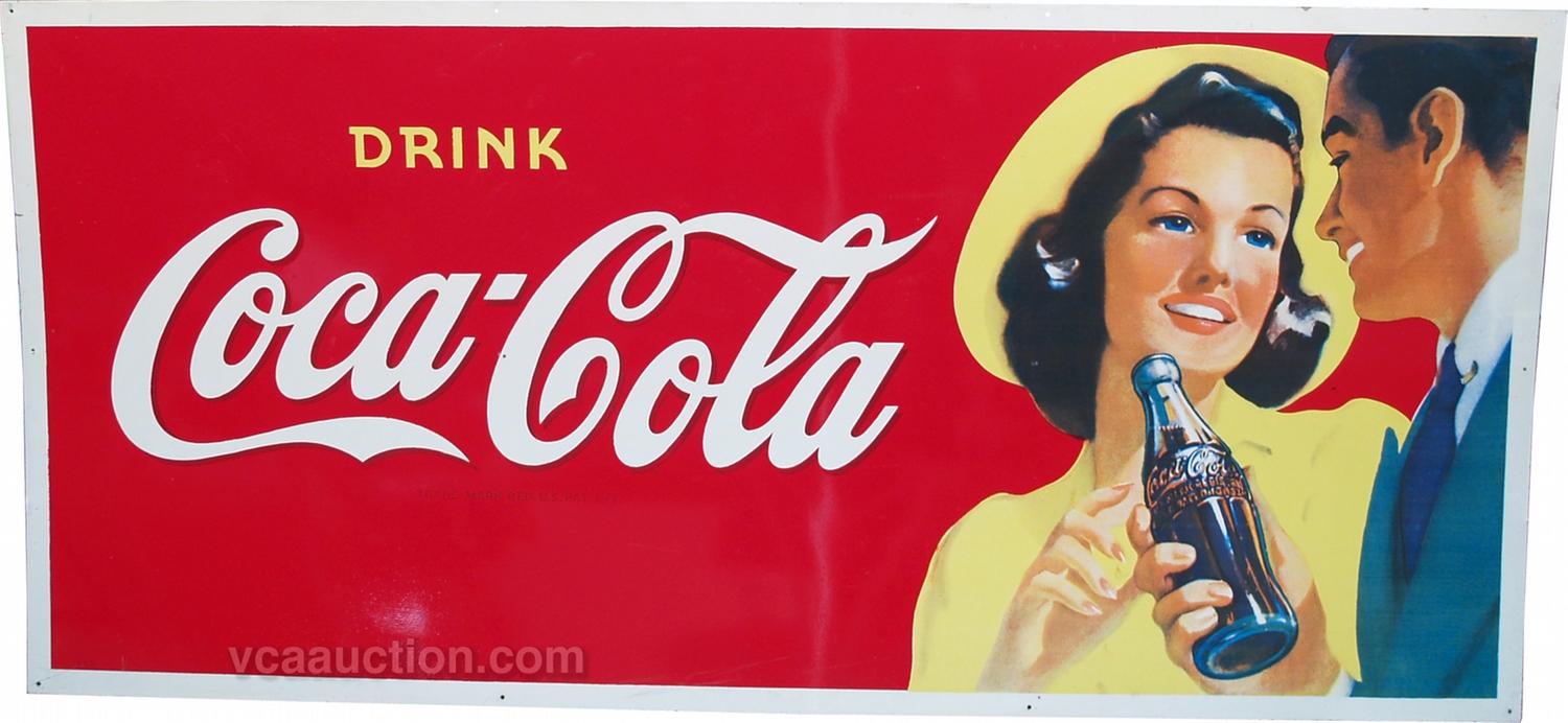 Large Drink Coca Cola Tin Sign w/ man & woman drinking together - 68" x 36"