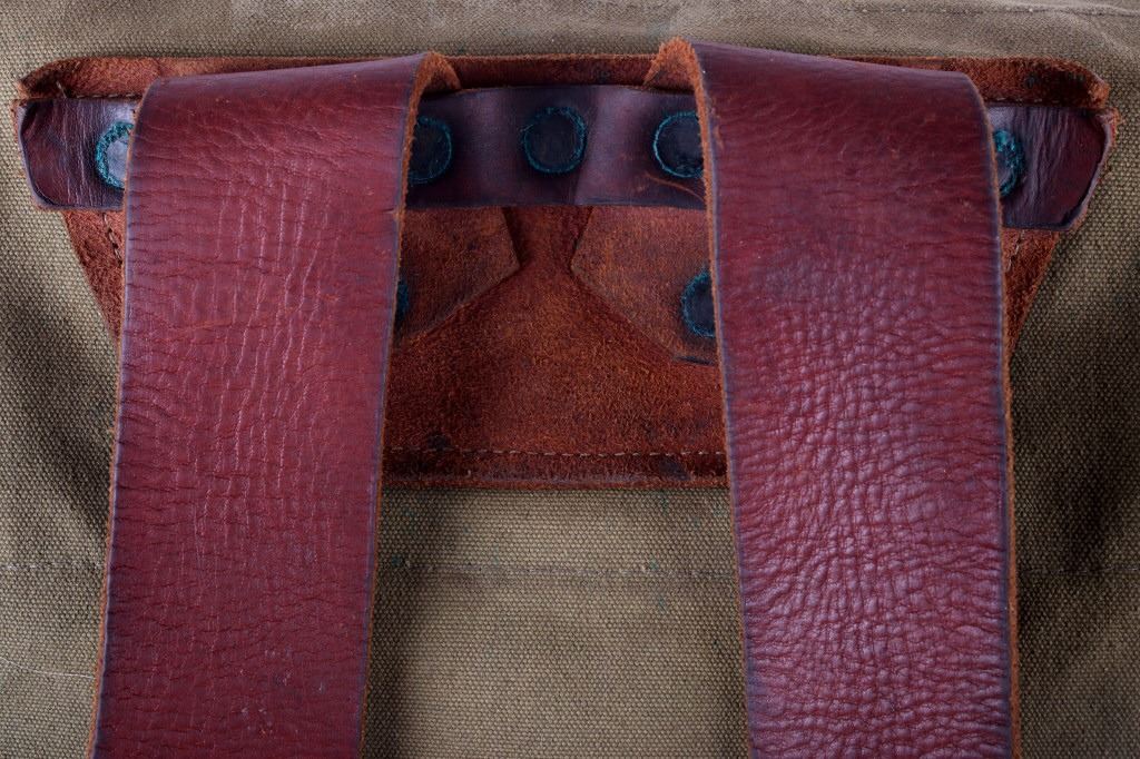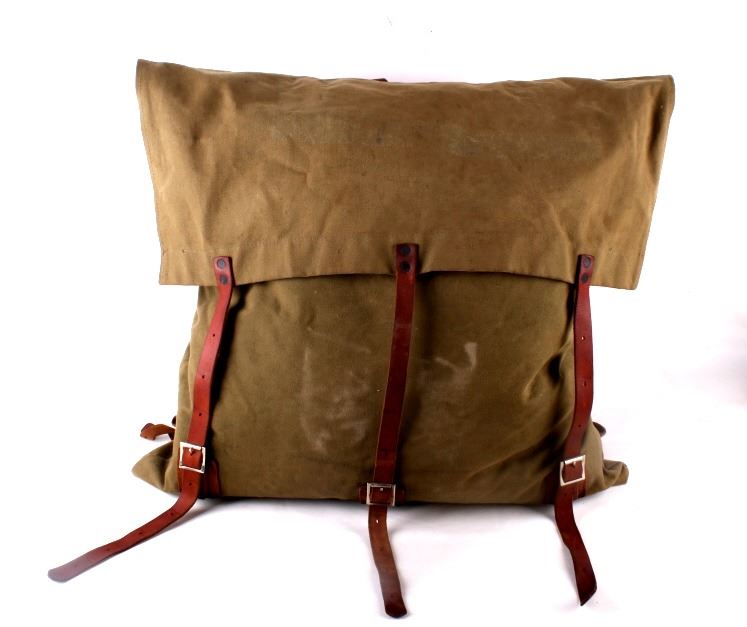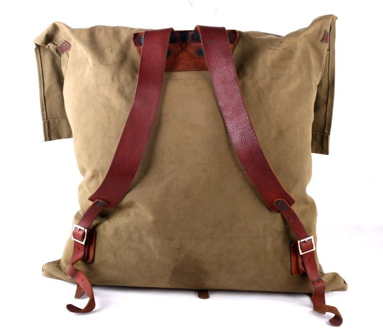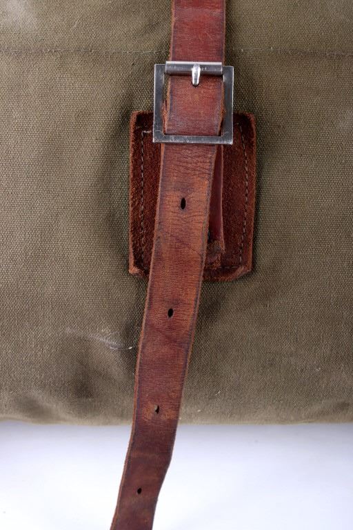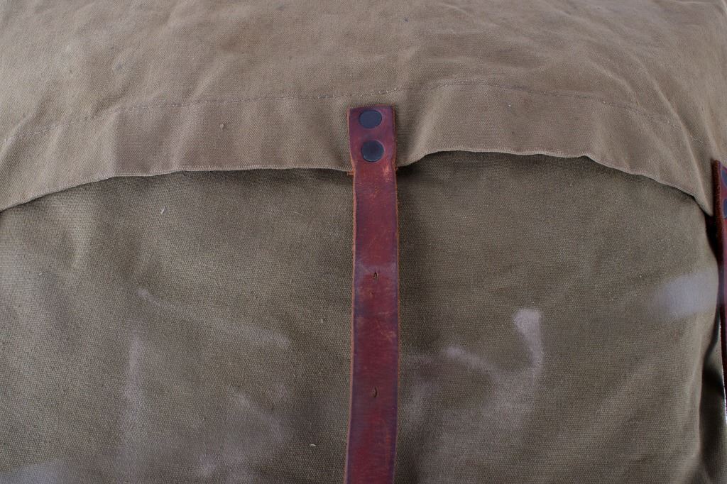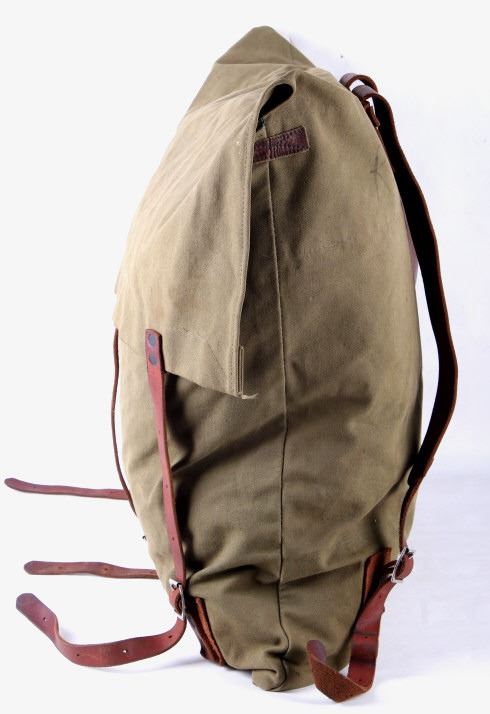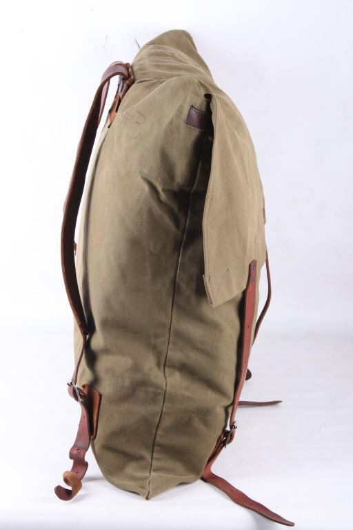 This is a green canvas & brown leather canoe pack, commonly referred to as a Duluth pack in reference to the location of the primary manufacturer of this type of pack. Great for trips or backpacking anywhere on earth, a Duluth pack is a specialized type of backpack made of heavy canvas and leather. The packs are a traditional portage pack which are nearly square in order to fit easily in the bottom of a canoe.The pack contains one main interior compartment, is canvas lined, and has adjustable leather shoulder straps. The pack is in very good condition with only a few marks and scuffs throughout bag and light oxidation on rivets. The pack measures about 26.5" t x 27.25" w and has a 14.5" flap with three 21.5" long fully adjustable leather straps. The pack has no "set out" and so is envelope shaped.