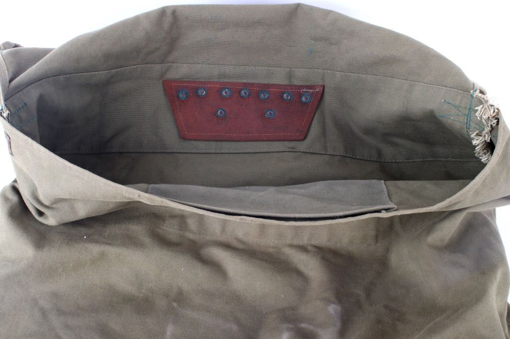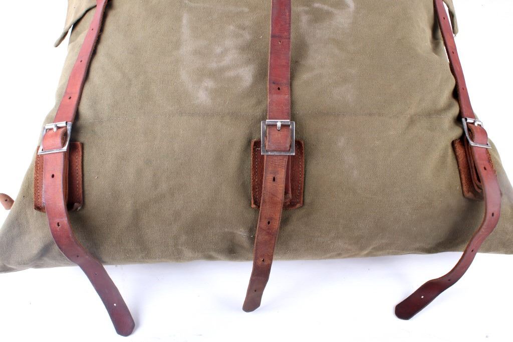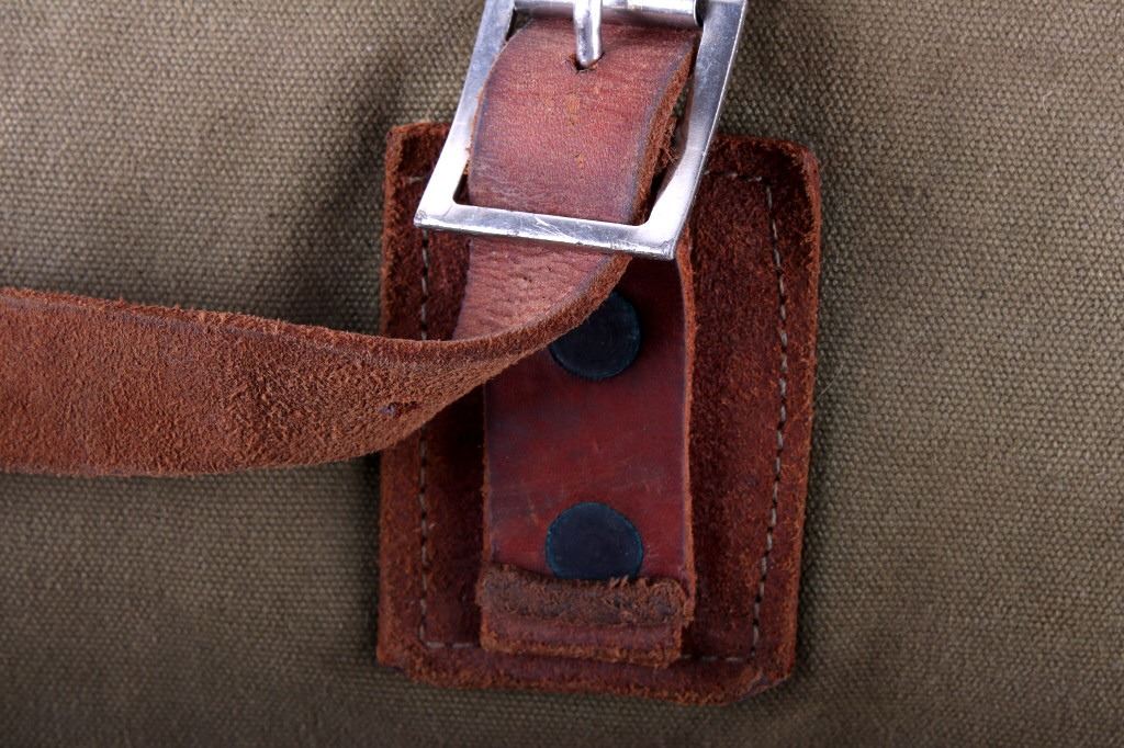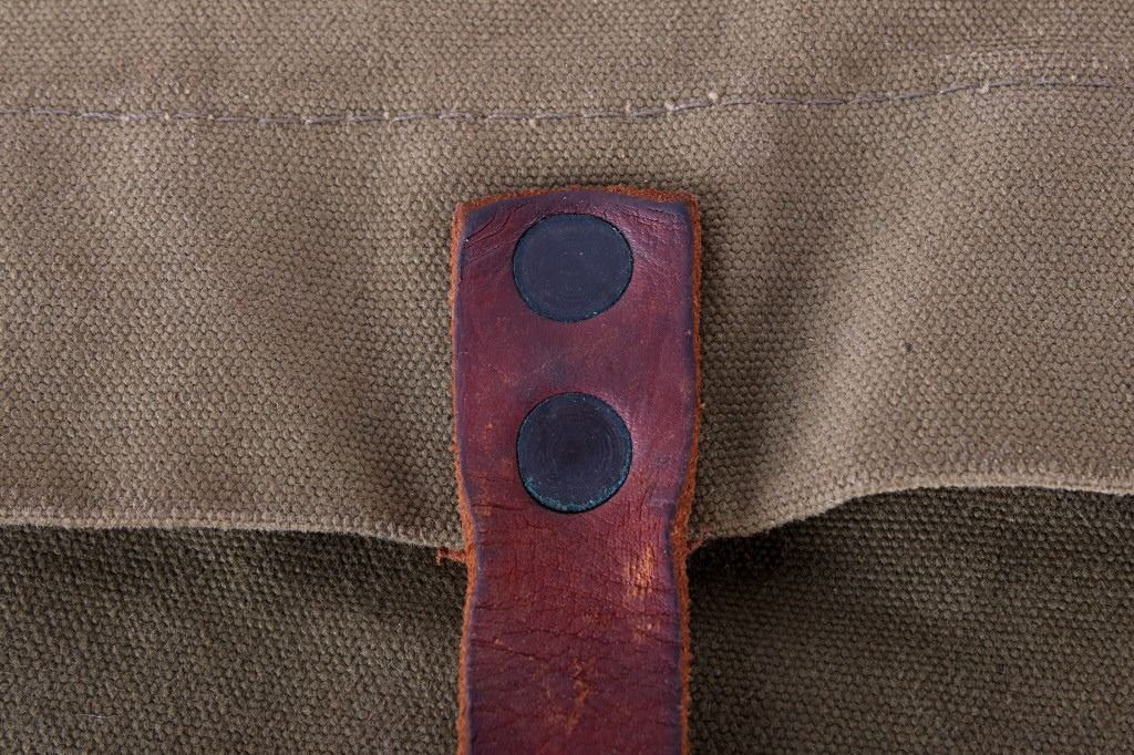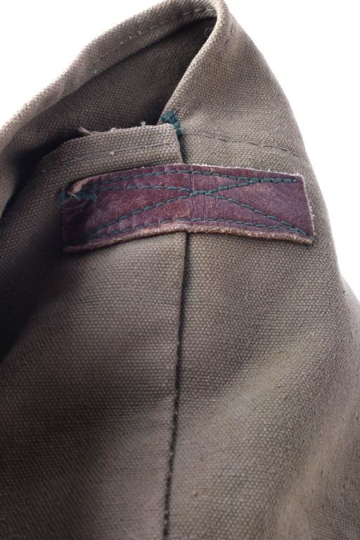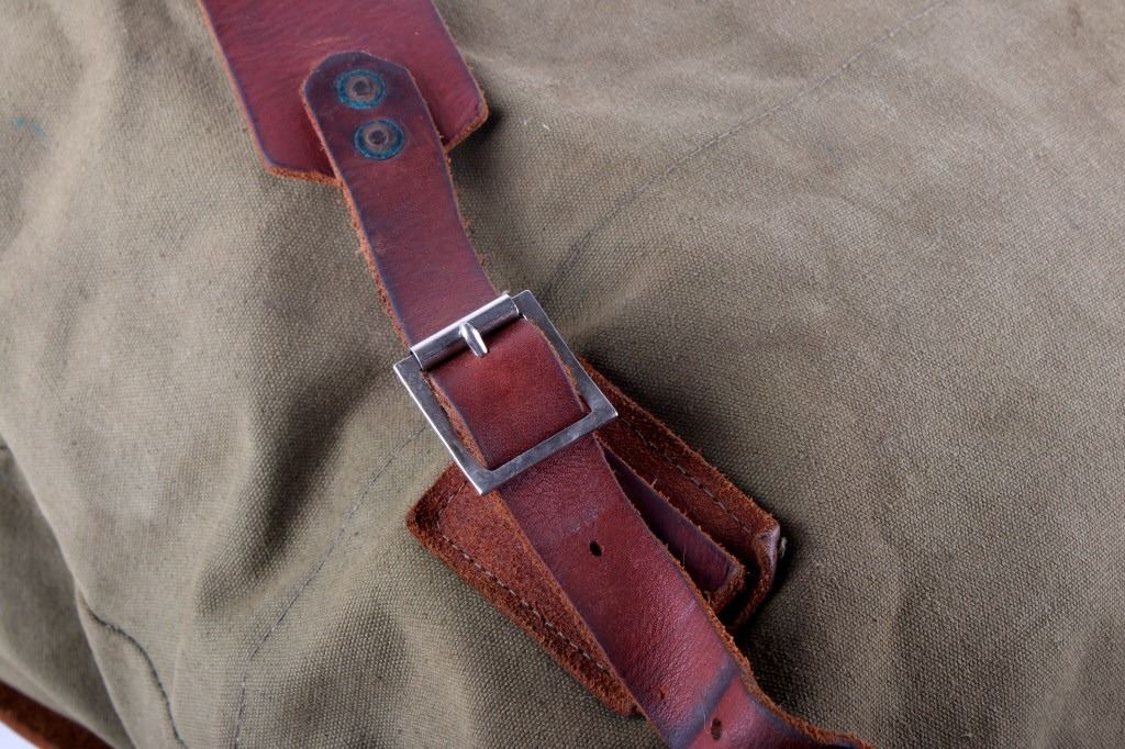 This is a green canvas & brown leather canoe pack, commonly referred to as a Duluth pack in reference to the location of the primary manufacturer of this type of pack. Great for trips or backpacking anywhere on earth, a Duluth pack is a specialized type of backpack made of heavy canvas and leather. The packs are a traditional portage pack which are nearly square in order to fit easily in the bottom of a canoe.The pack contains one main interior compartment, is canvas lined, and has adjustable leather shoulder straps. The pack is in very good condition with only a few marks and scuffs throughout bag and light oxidation on rivets. The pack measures about 26.5" t x 27.25" w and has a 14.5" flap with three 21.5" long fully adjustable leather straps. The pack has no "set out" and so is envelope shaped.