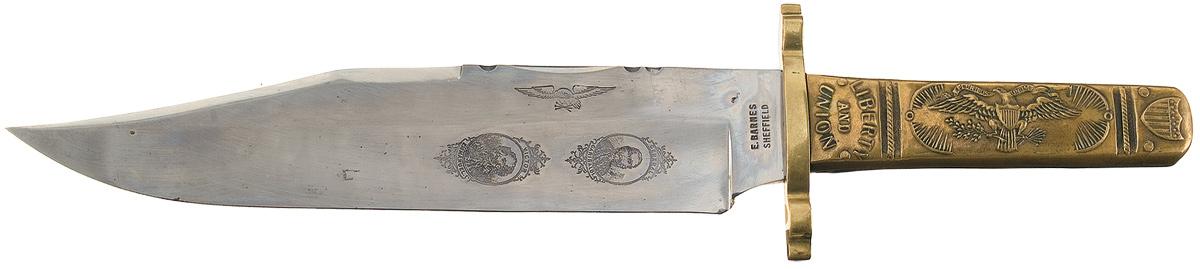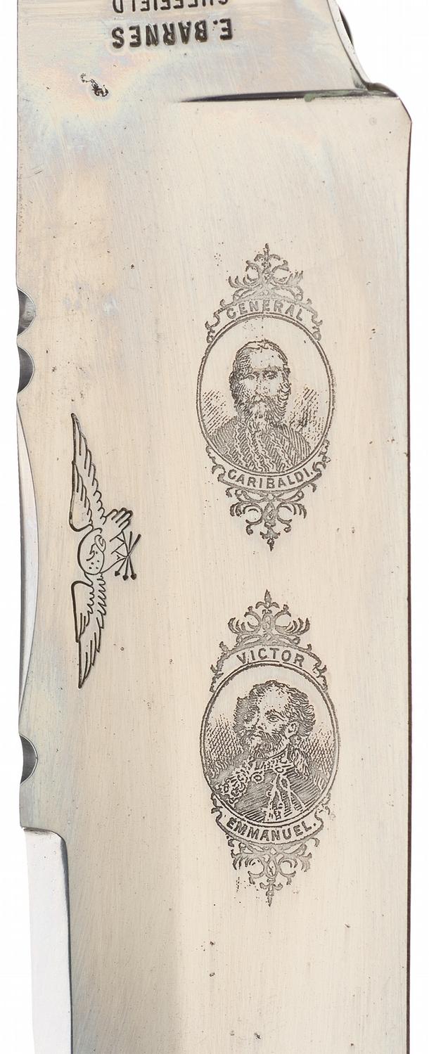 This English bowie knife has a 9 3/4" blade marked "E. BARNES / SHEFFIELD" and a spread winged eagle on the left side. The left side of the blade also has clear etched portraits of Victor Emmanuel and General Giuseppe Garibaldi, two Italian military and political figures. Fitted with brass scales with four rivets. The scales have raised "E Pluribus Unum" spread eagle/shield motifs with the text "LIBERTY / AND / UNION" near the brass guard. OAL: 15".
