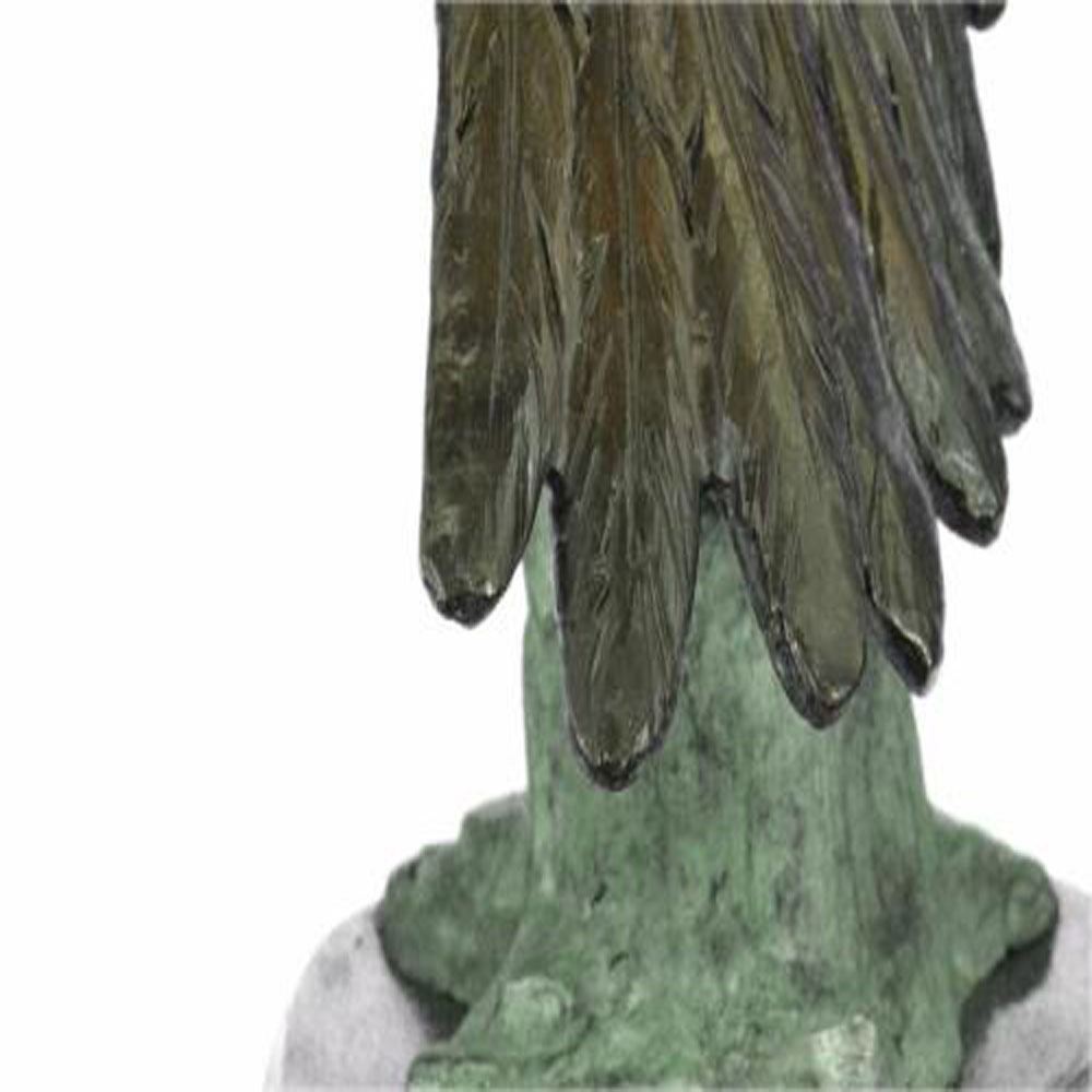 He spreads his wings high and wide as if he is about land. His head is cocked off to the left as well as the rest of his body. This American Bald Eagle is an absolutely gorgeous species with a strikingly beautiful look. His fully spread wing span is an amazing breathtaking sight giving this Sculpture an energetic vibe. The detail of his face, beak and talons are quite intricate and has great life like qualities. This gorgeous birds beauty demands respect and he personifies in himself freedom. This Sculpture was cast using the Lost Wax Method ensuring the detail of quality. This Sculpture has a special hand painted multi color light copper brown, white, and black. This Sculpture is mounted on a gorgeous marble base. Bronze Dimensions with Marble Base: Height 32 X Width 22 inches. Weight: 40 LBS.