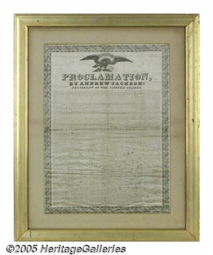 <B>Large Early 1832-dated Andrew Jackson Broadside on Silk</B></I> At 18 1/2" x 25 1/2" it is one of the largest of these silk broadsides we have seen, issued by <I>"John Russell, Printer...Hartford, Conn."</B></I> During the 1820-40s era, it was a common practice to print a certain number of presentation or souvenir copies of important broadsides on silk. Of course, as textiles, these silk broadsides are accorded a premium value in the marketplace over paper versions of a similar nature. This Dec. 10, 1832 broadside is of particular historical significance: it presents the complete text of Jackson's response to South Carolina's attempt to "nullify" an act of the U.S. Congress, setting the stage for a great Constitutional test of states rights versus Federal authority. Jackson declares his unalterable committment to <I>"preserve the Union by all Constitutional means, if possible by moderate but firm measures..."</B></I> but he warns that a <I>"recourse to force"</B></I> will be made if necessary. Jackson goes on to warn the citizenry of the seriousness of the stakes: he asks their support and courage and prays that <I>"(God's) wise Providence (will) bring those who have produced this crisis, to see the folly, before they feel the misery of civil strife."</B></I> South Carolina, led by Jackson's first vice-president, John C. Calhoun, backed down, and the Union stood its first great test. The episode inspired Jackson's declaration, <I>"The Union must and shall be preserved,"</B></I> which became the battle cry of the North a generation later when the nation finally went to War over these sectional and Constitutional differences. While Collins published in <I>Threads of History</B></I> five different Jackson silk broadsides, this one is unlisted. Because of the subject matter it is certainly a highly important artifact. Basically in very nice condition, free of the usual separation and other damage seen on most early silk broadsides. Some overall age speckling in the lower section is a negative (might be professionally cleaned, but the last owner felt it unnecessary). 18 1/2" x 26" and 28"x 34" as framed. Lot:256