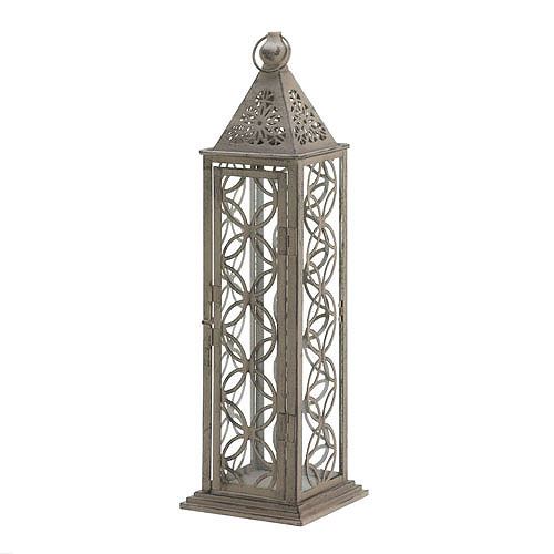 Large Eclipse Candle Lantern **|**|** A monument to great design, this beautiful candle lantern will enhance the pillar candle of your choice. The antiqued pewter-like finish and the circular and intricate cutouts that adorn the top and sides of this lantern create a gorgeous spectacle of light and shadow. Item Weight: 2.4 lbs. 5 x 5-1/8" x 17-1/2" high. Iron and glass. 1 EA"