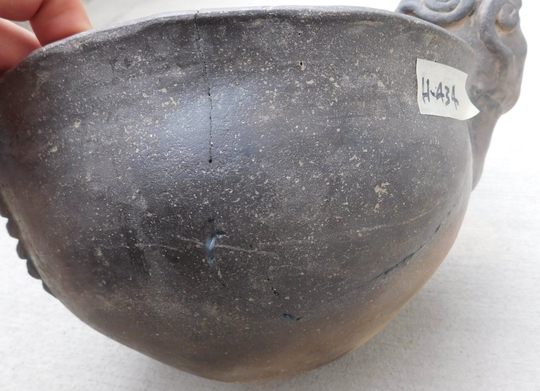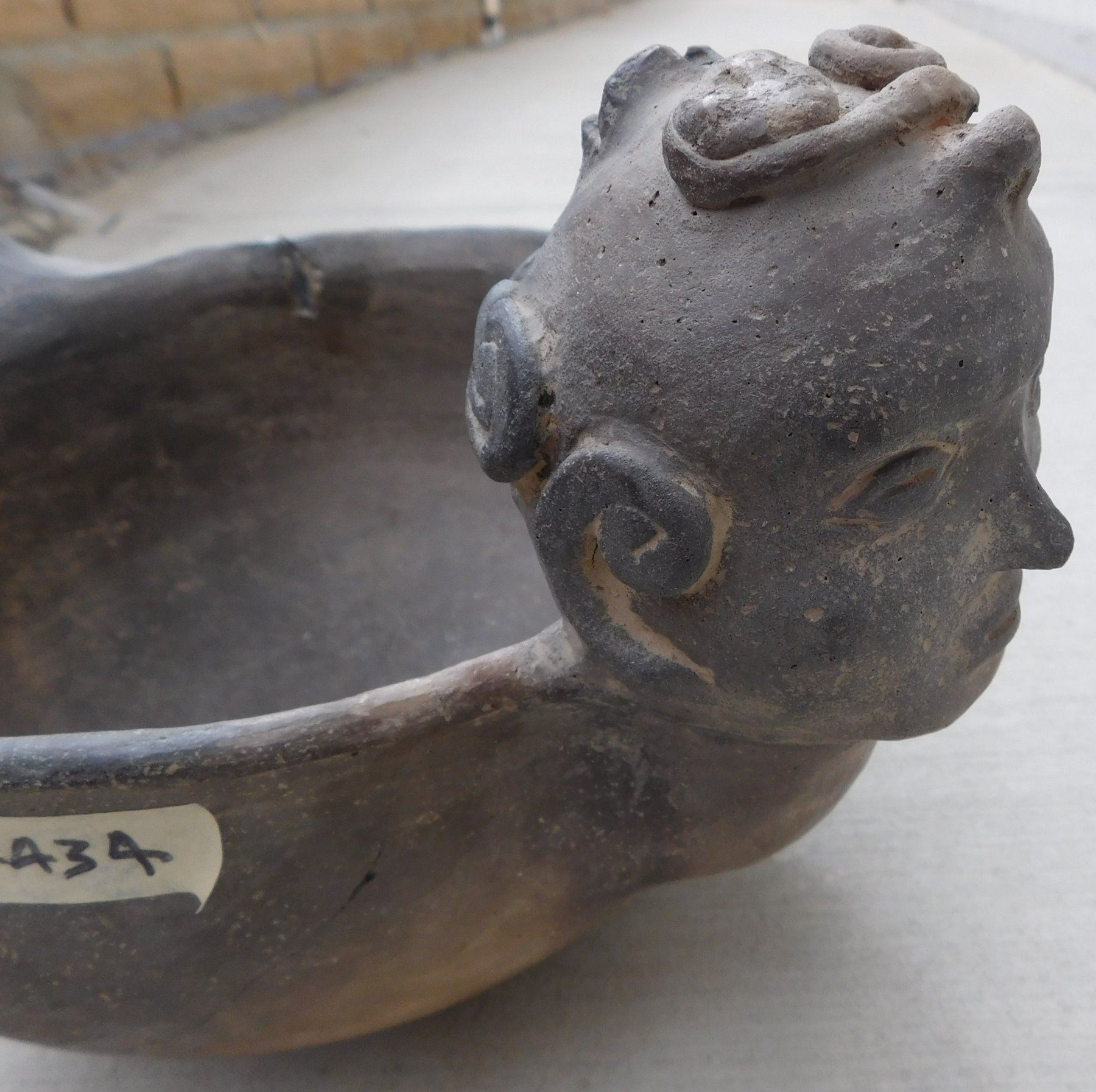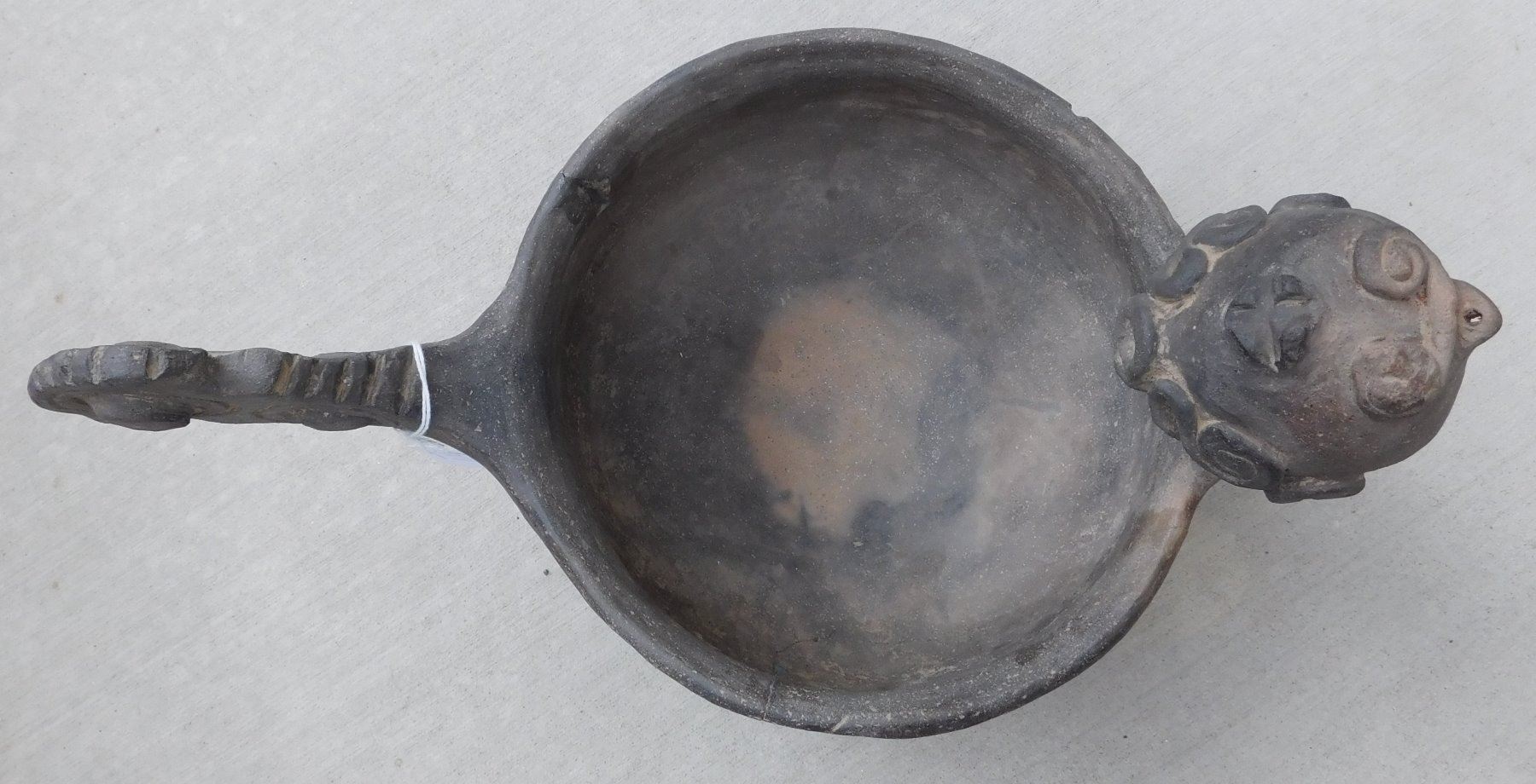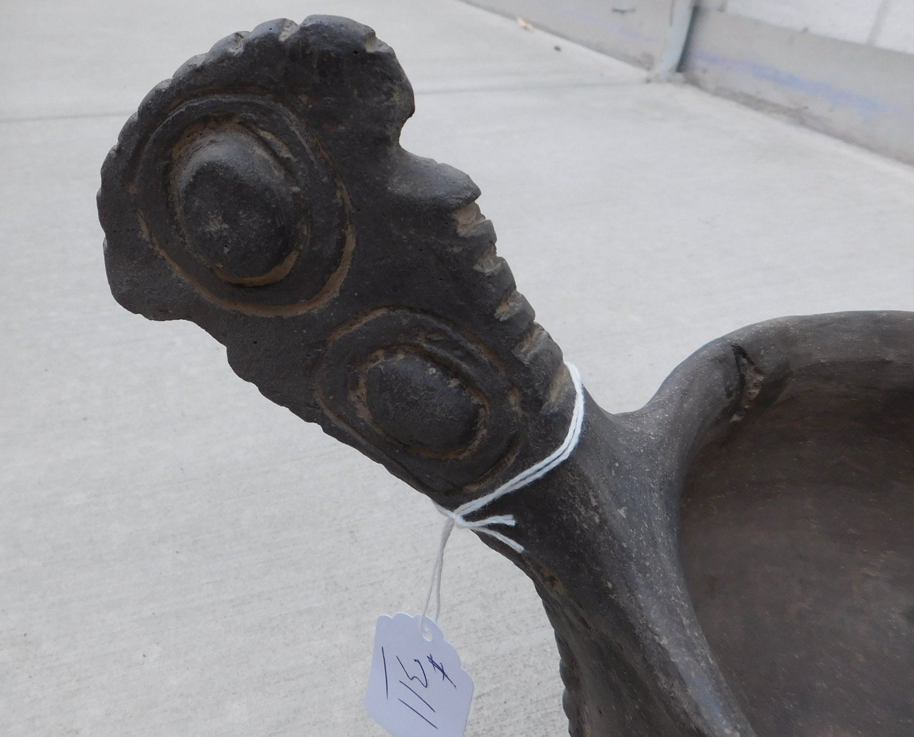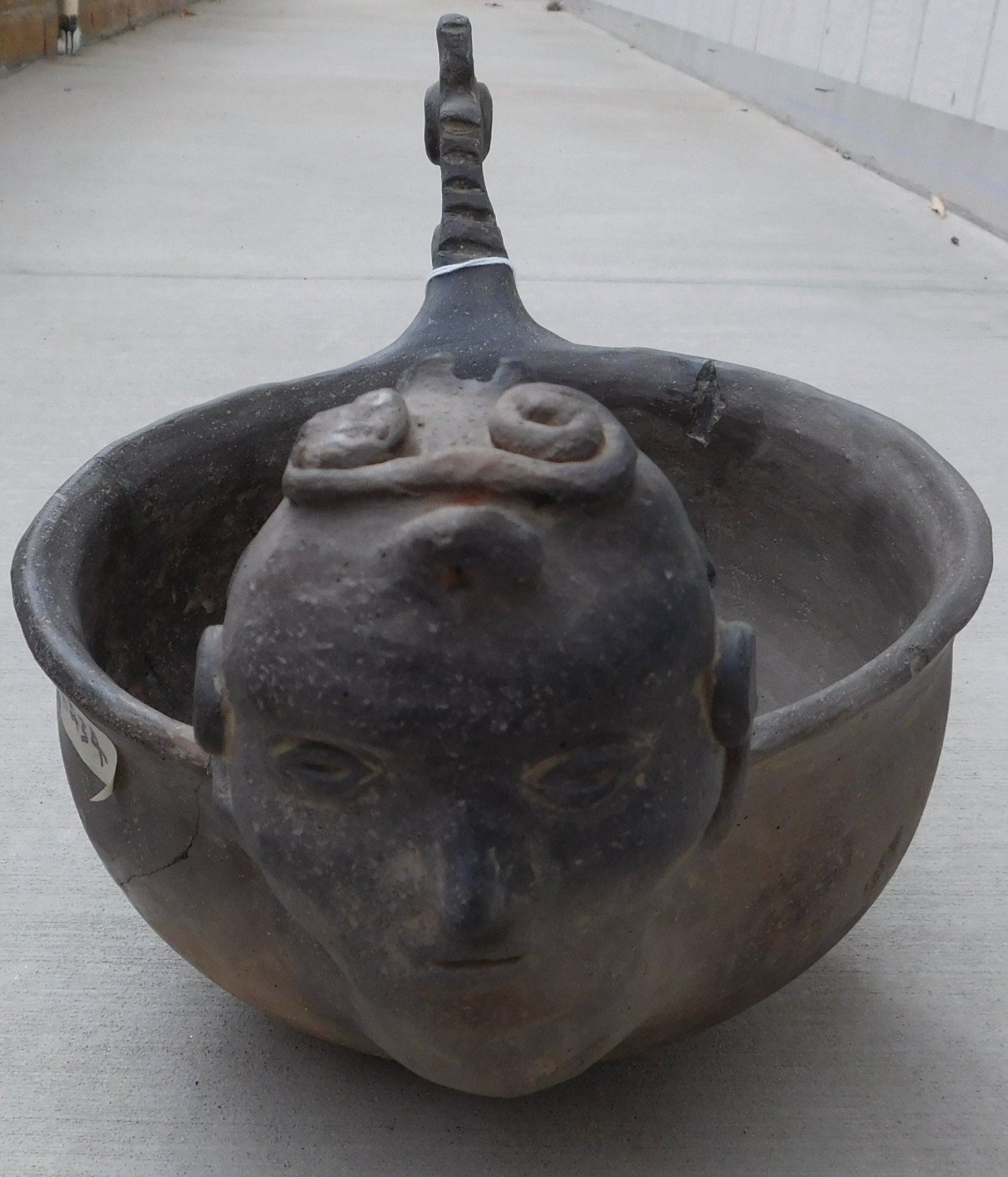 Large Effigy Caddo Pot, pre-historic item. Made of clay, the item measures 15.5" x 9" x 9.5". Arkansas. Condition: Broken and glued, see images. Shipping: $60.00 w/insurance and signature, due to size and value, double-boxed.