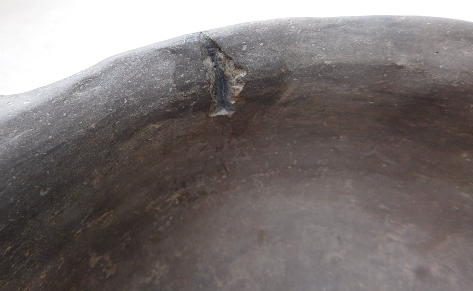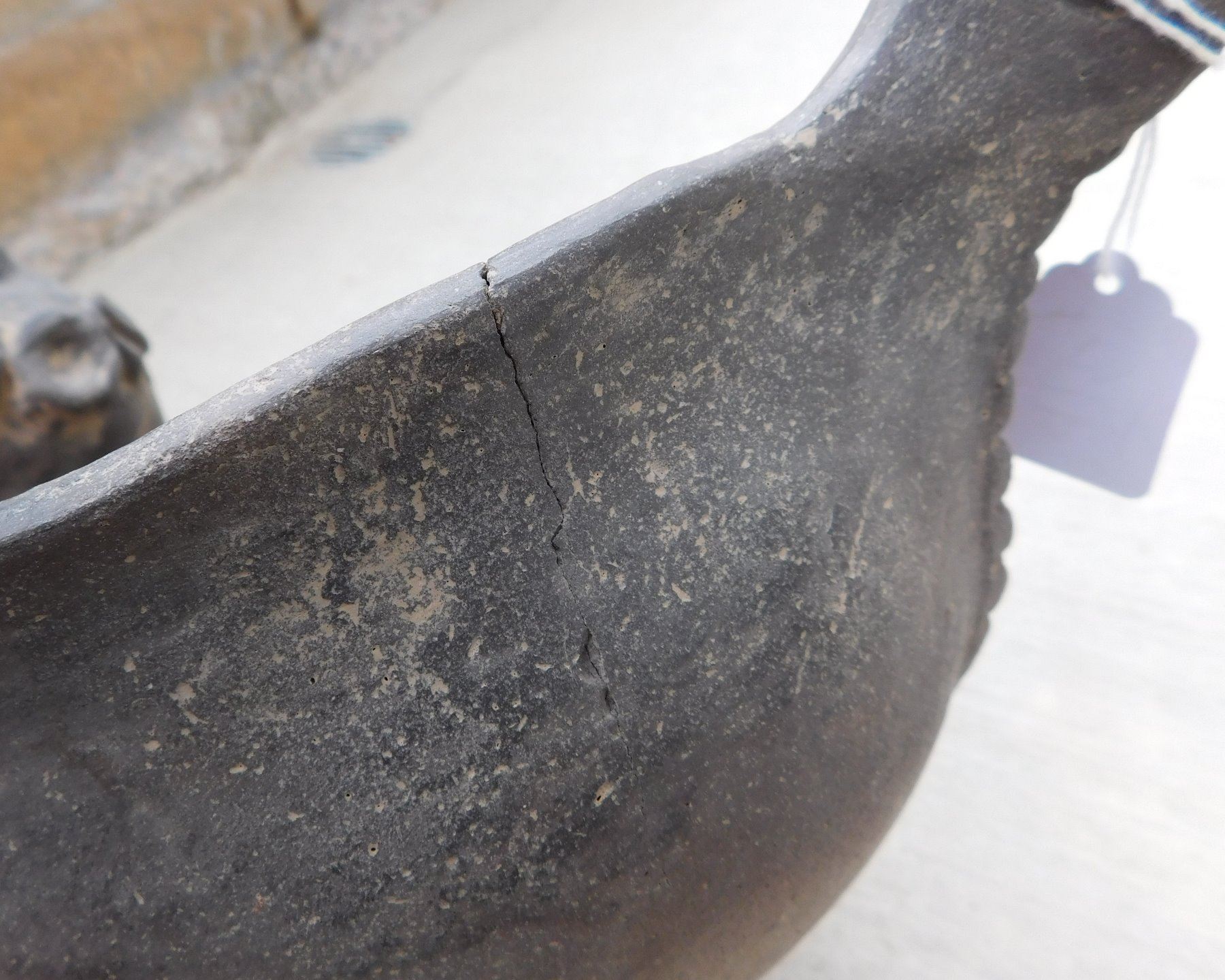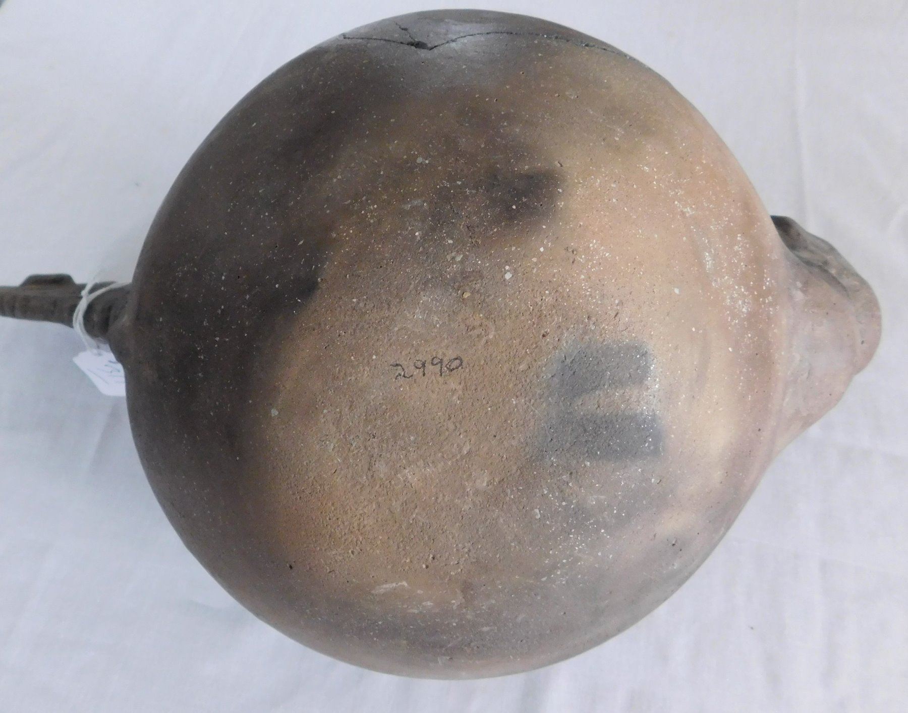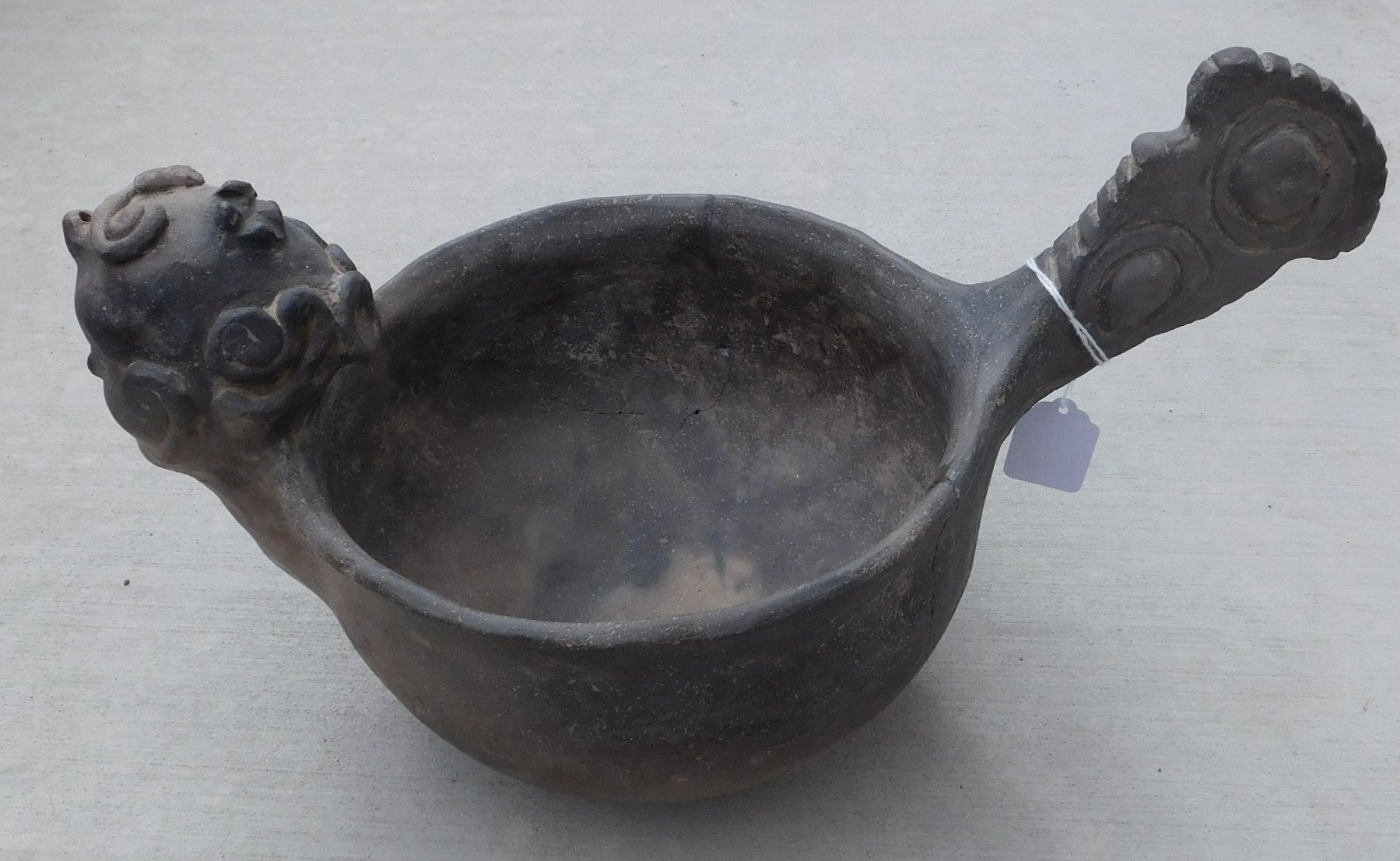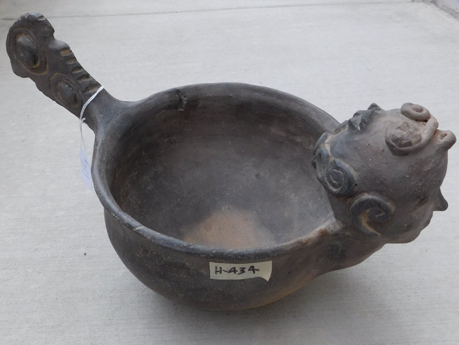 Large Effigy Caddo Pot, pre-historic item. Made of clay, the item measures 15.5" x 9" x 9.5". Arkansas. Condition: Broken and glued, see images. Shipping: $60.00 w/insurance and signature, due to size and value, double-boxed.