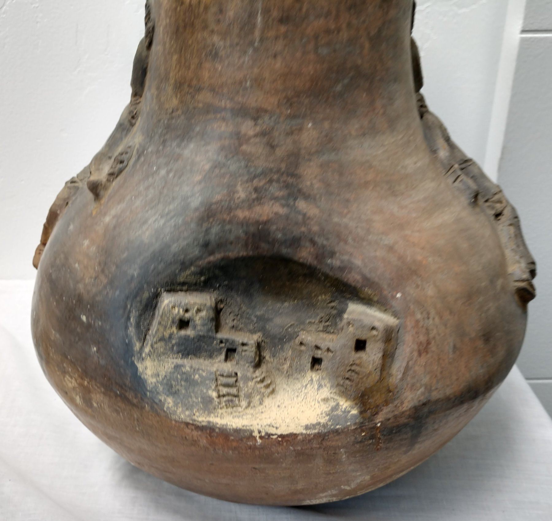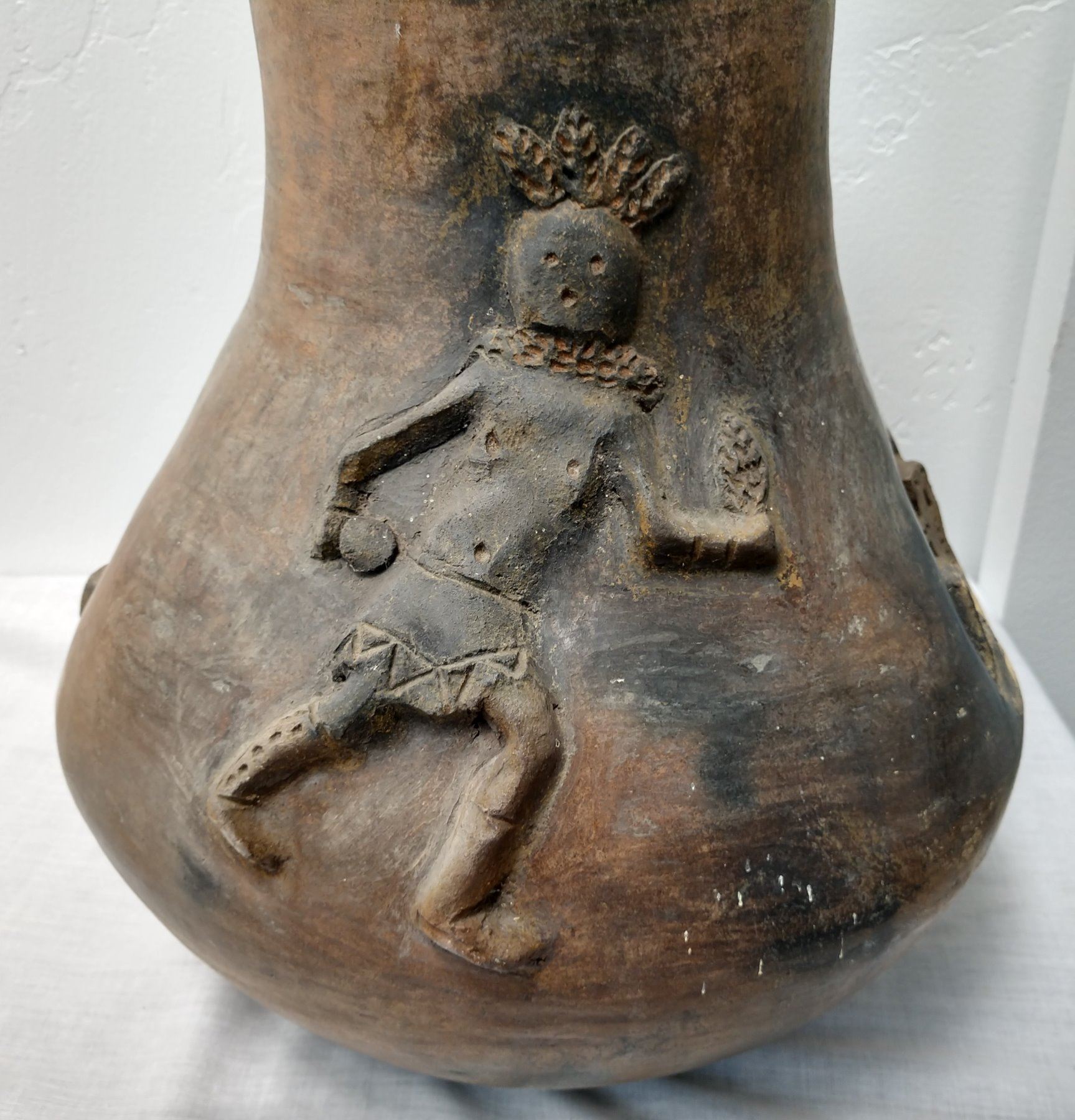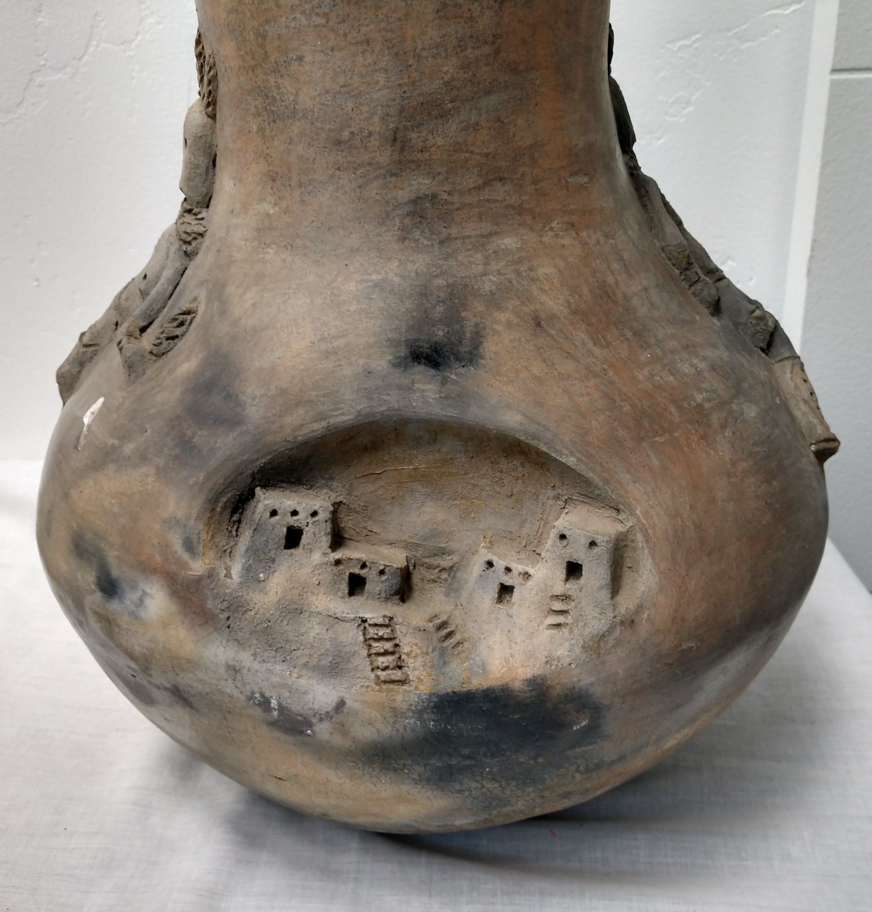 Large Effigy Olla, 20th century item. Made of clay, the item measures 18" x 12" x 12". Navajo, Arizona. Kachinas and pueblo effigies. Condition: Good, see images. Shipping: $65.00 USA estimate only, w/insurance and signature due to size and value.