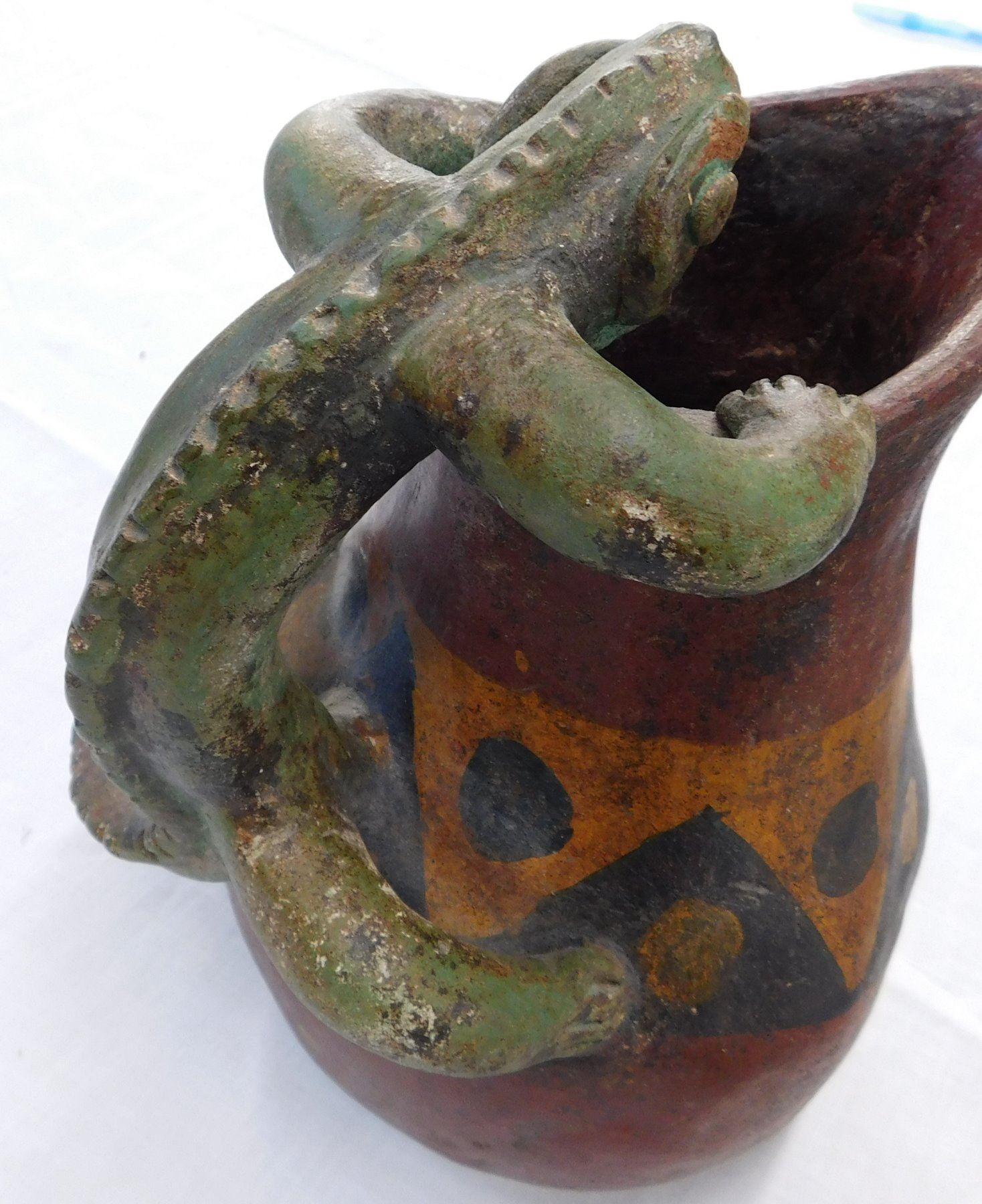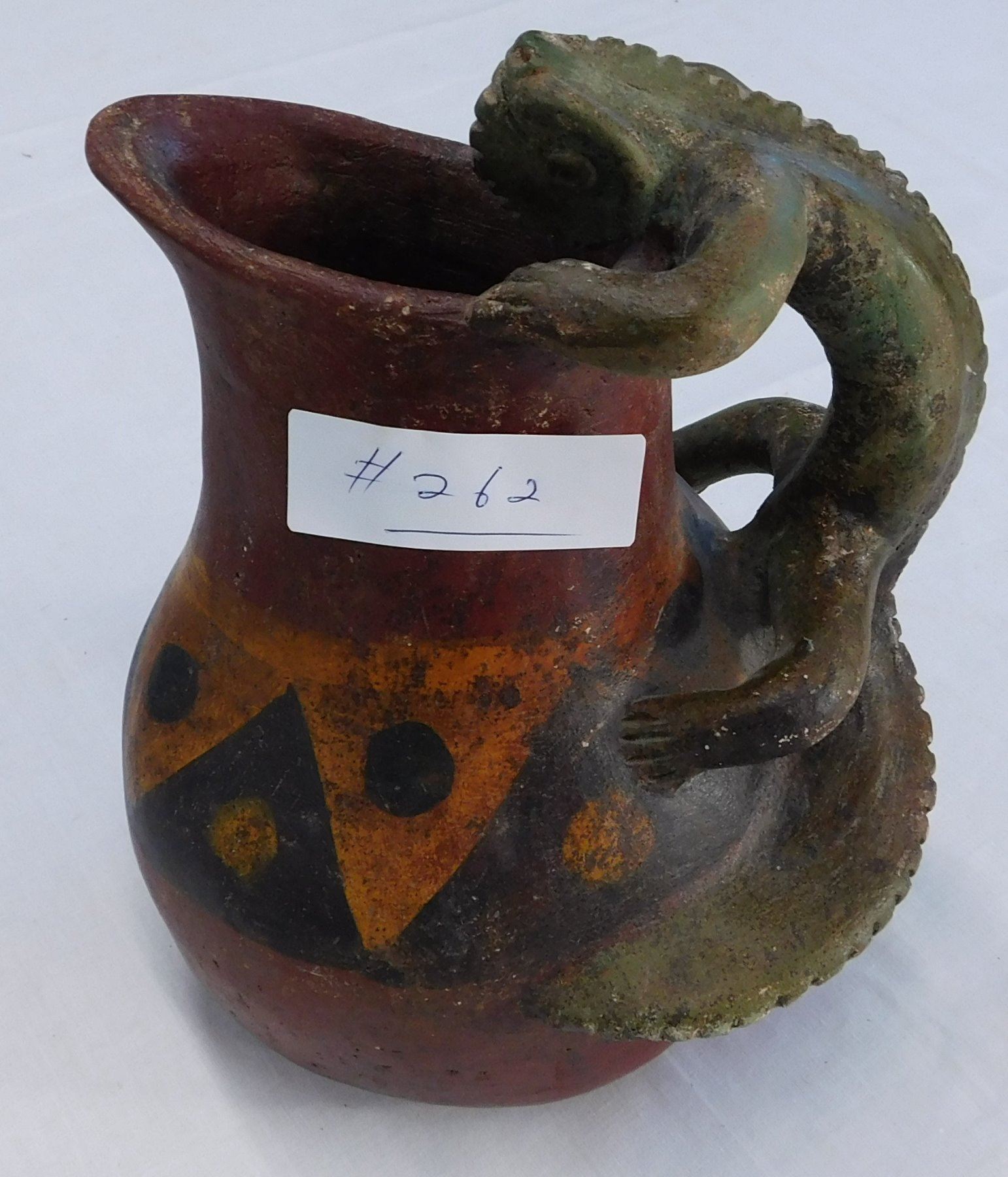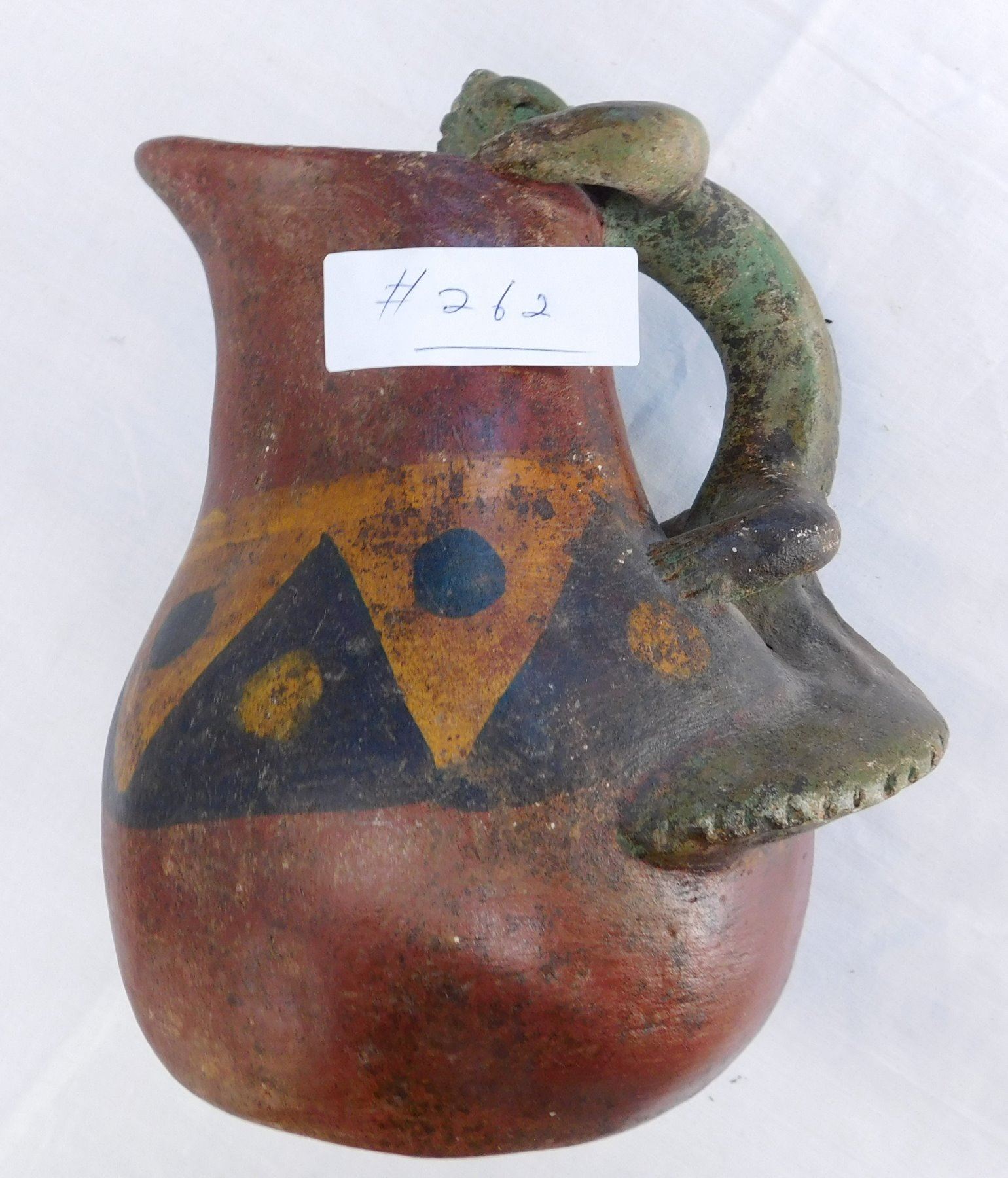 Large Effigy Pitcher, c. 1900s. Made of clay and paint, the item measures 8" x 7" x 8.5". Belize, British Honduras. Condition: Minor wear, see images. Shipping: $30.00 w/insurance and signature, double-boxed.