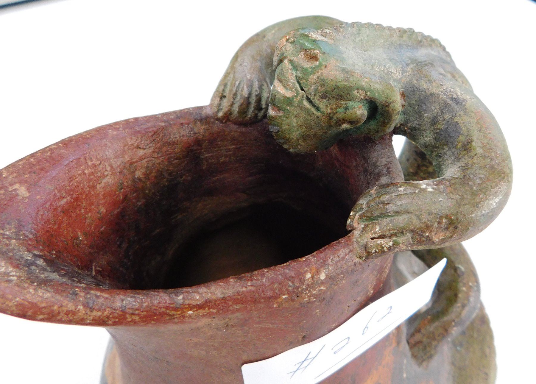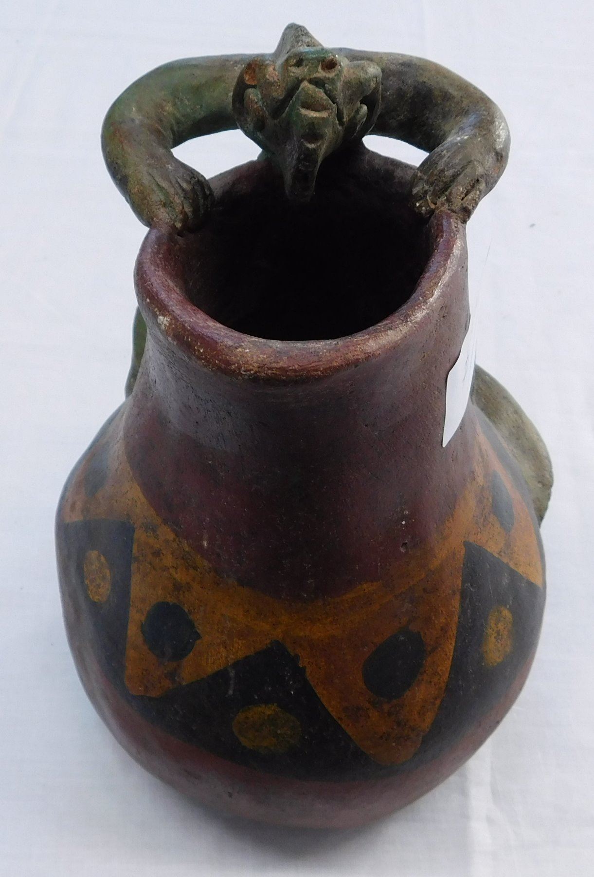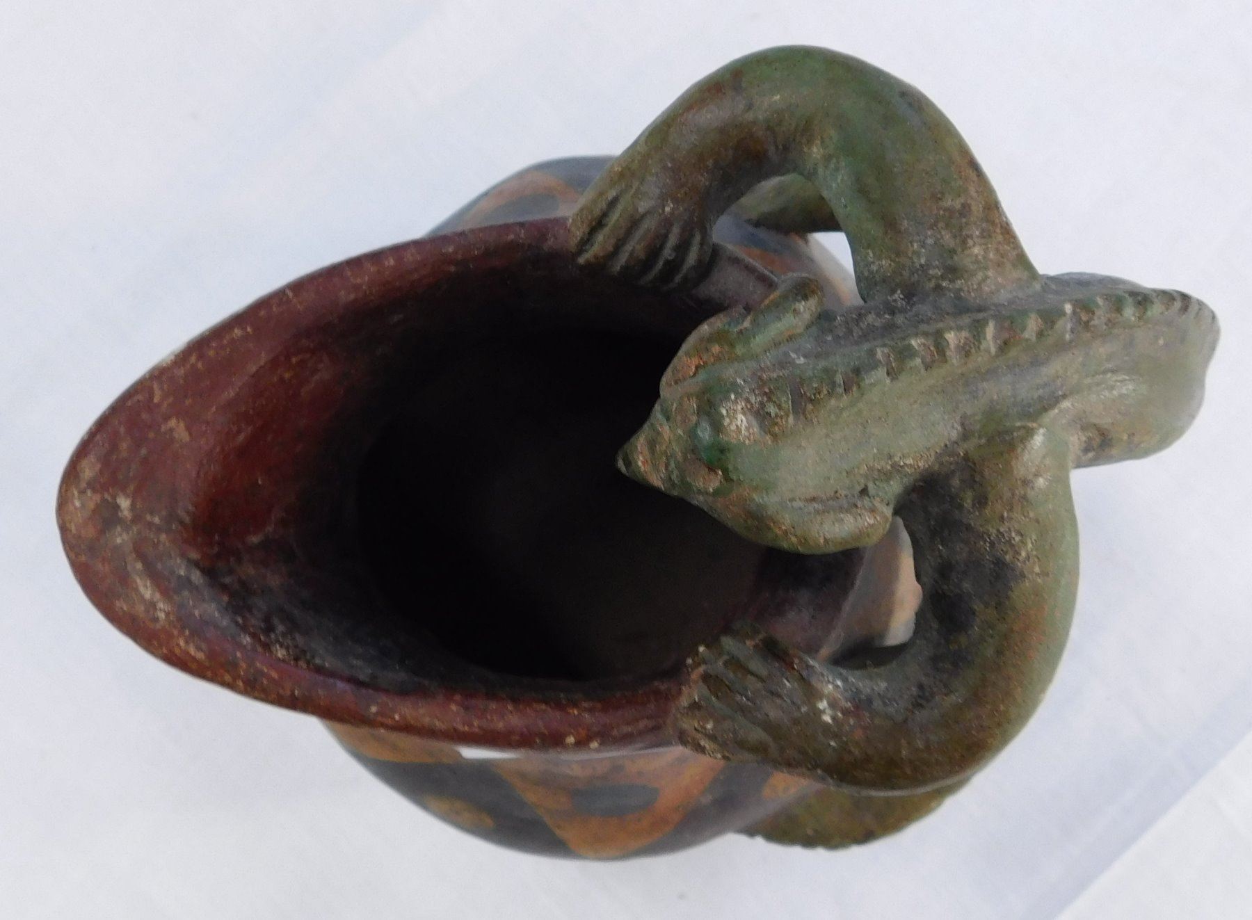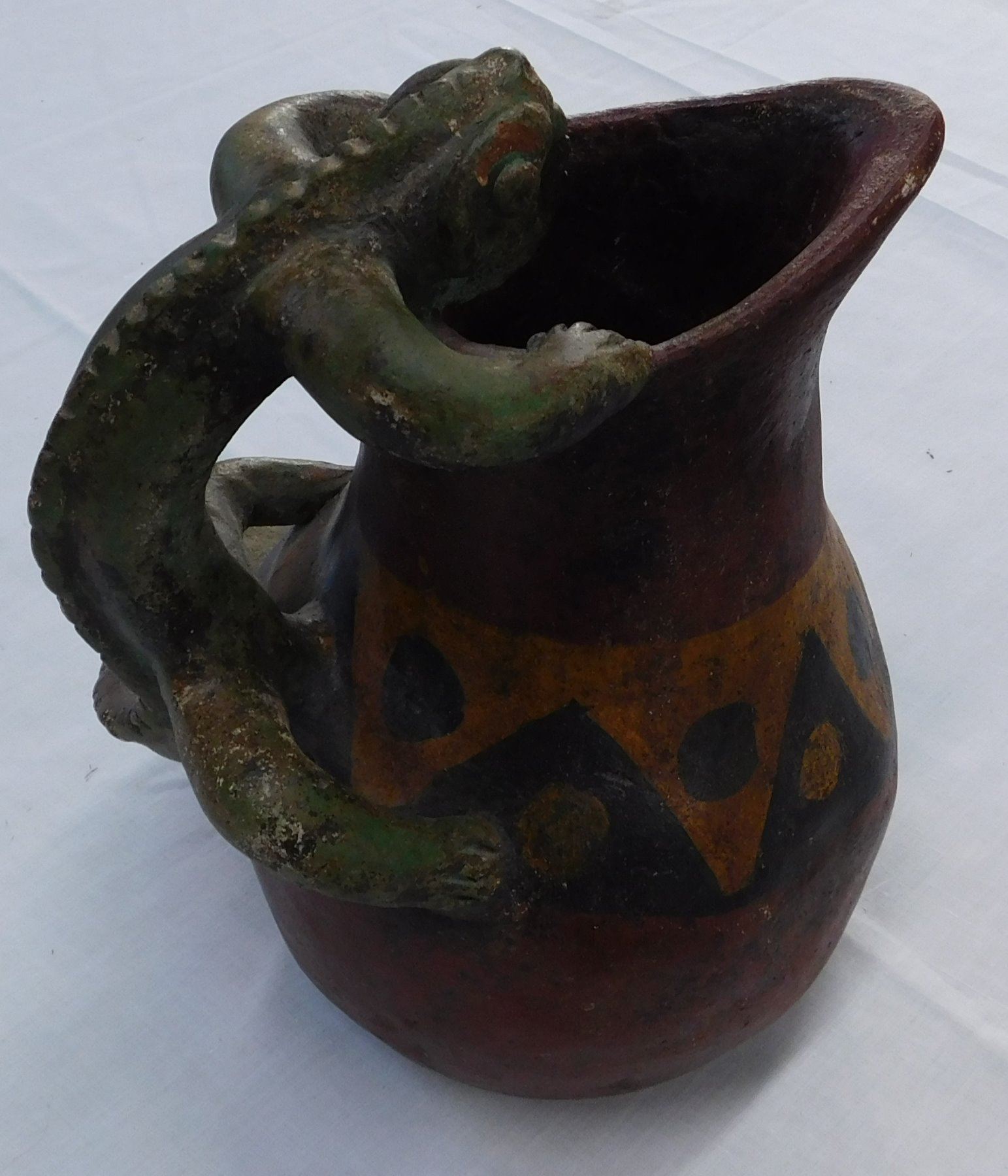 Large Effigy Pitcher, c. 1900s. Made of clay and paint, the item measures 8" x 7" x 8.5". Belize, British Honduras. Condition: Minor wear, see images. Shipping: $30.00 w/insurance and signature, double-boxed.