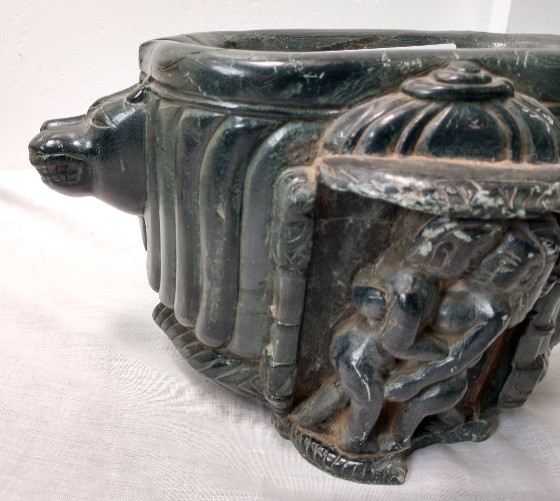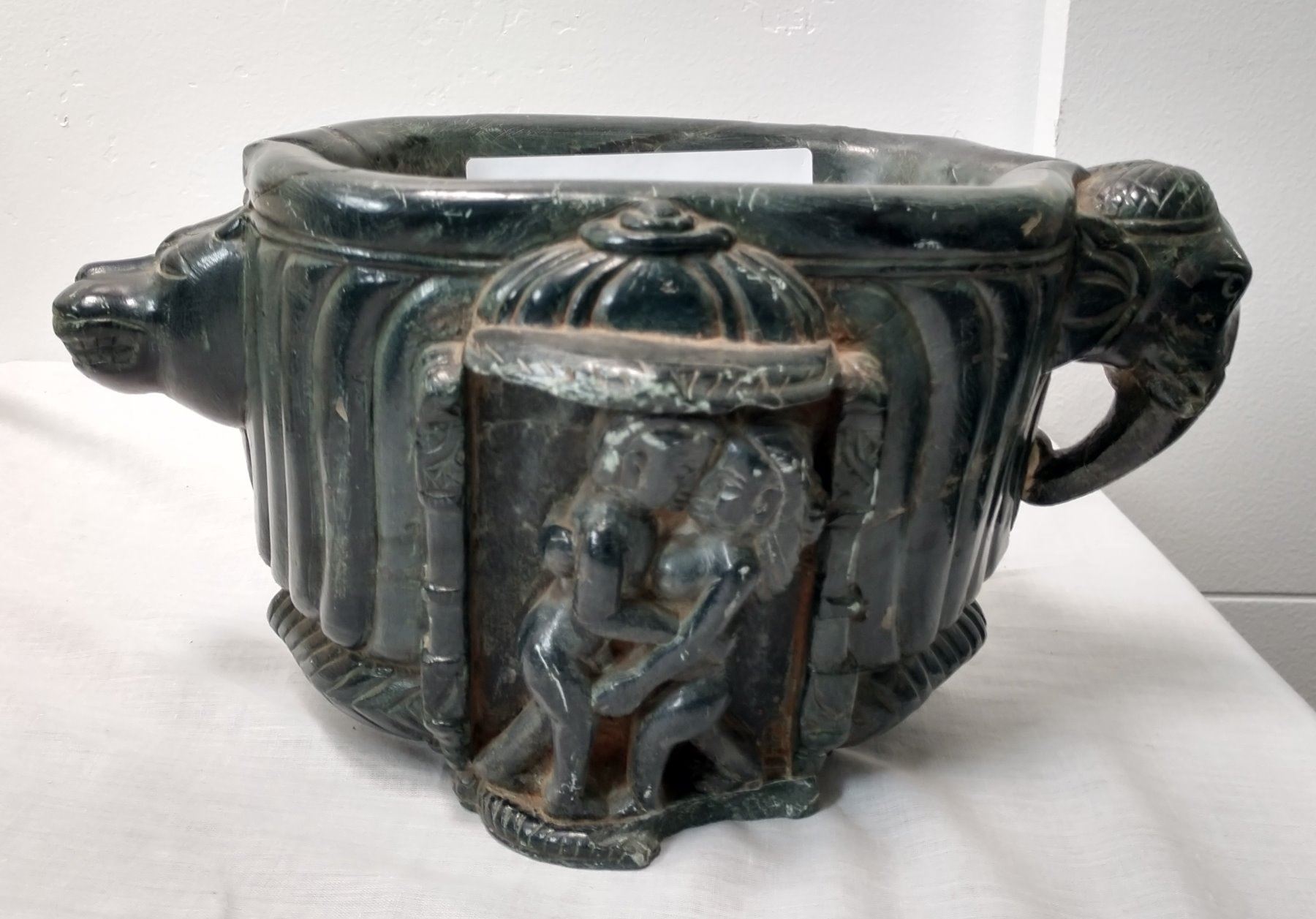 Large Effigy Stone Bowl, c. 100 years old. Made of steatite, the item measures 13" x 9" x 6". India. Erotic scenes. Condition: Chip on base, see images. Shipping: $45.00 USA estimate only, w/insurance and signature, due to heavy weight.