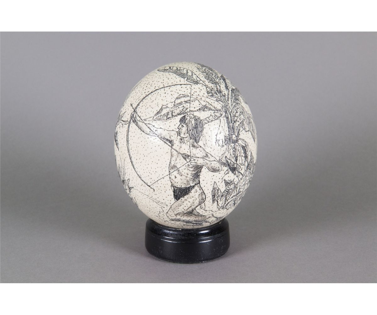 Large eggshell display piece; featuring painting of primitive figures and animals; wood stand included; H: 14 cm, D: 12 cm, 298 grams w/ stand