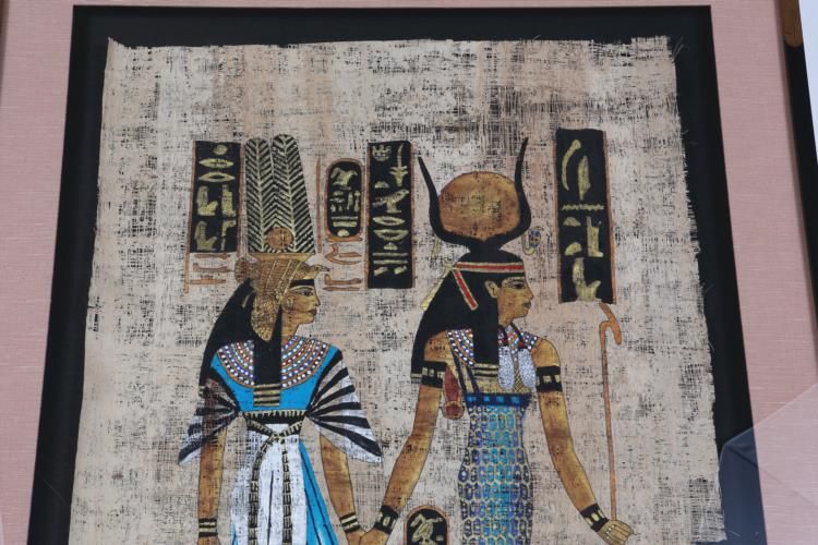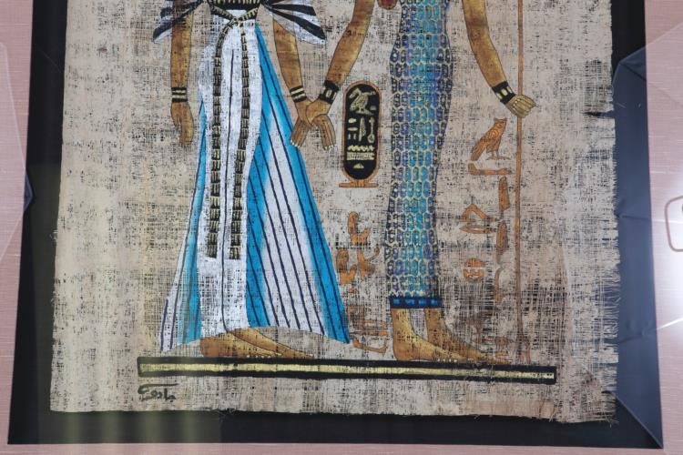 Offered for sale we have a Large Egyptian Papyrus Pharaoh & Queen Signed Painting that is signed by an unknown artist. This painting was purchased from at estate and was framed 15 years ago for $500, which would cost $1200 today! The Frame Size is 34" x 45" and the Image Size: 24" x 34". This original painting is hand made and signed by the artist, but we were unable to determine who the creator is. This striking Egyptian masterpiece comes mounted and beautifully framed, ready to hand on your wall