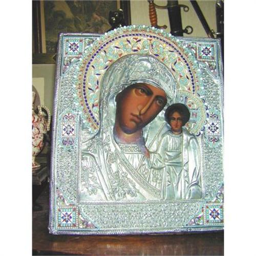 We offer a splendid enameled riza icon of the the Holy Virgin Mother and Child.