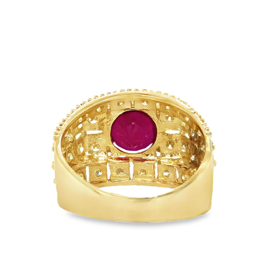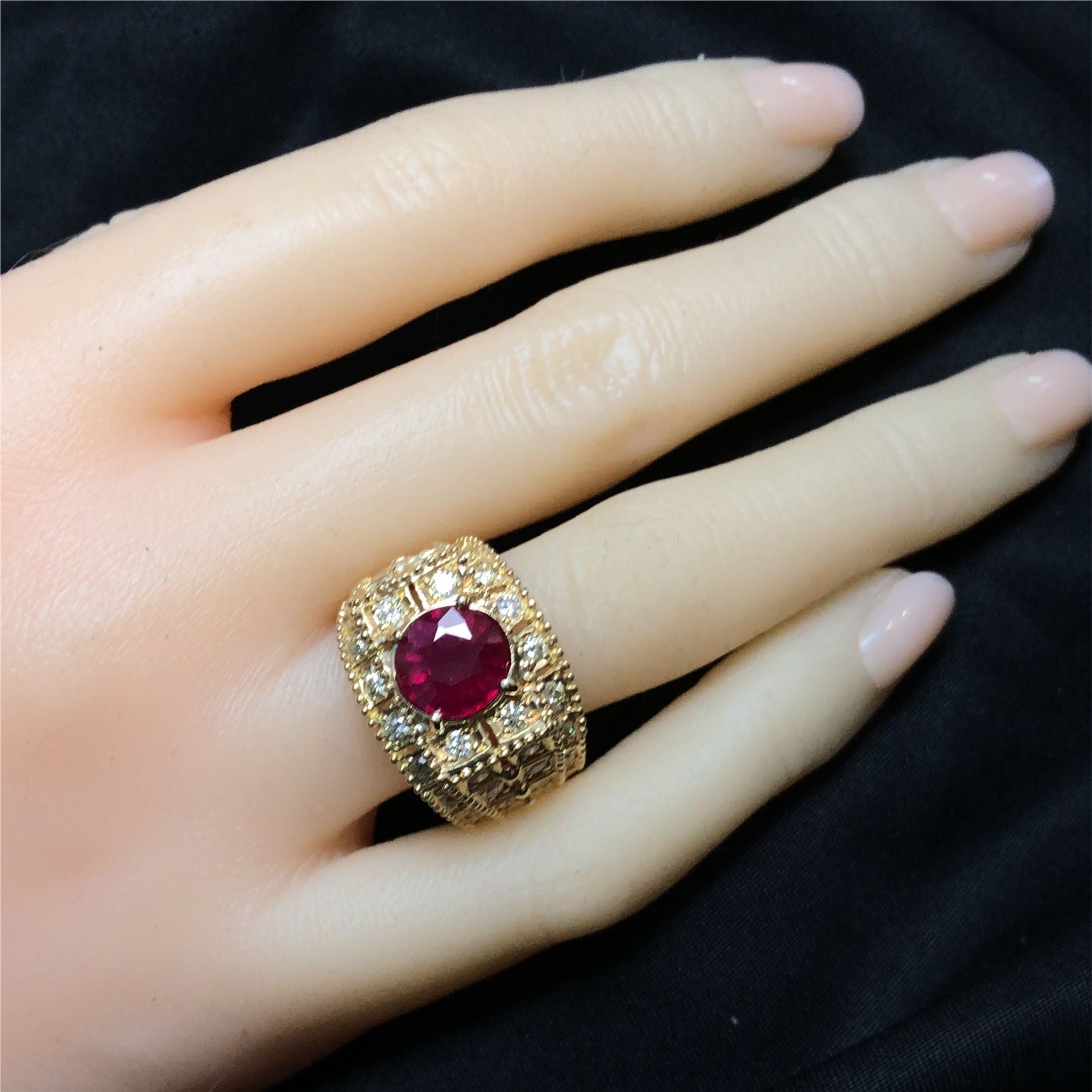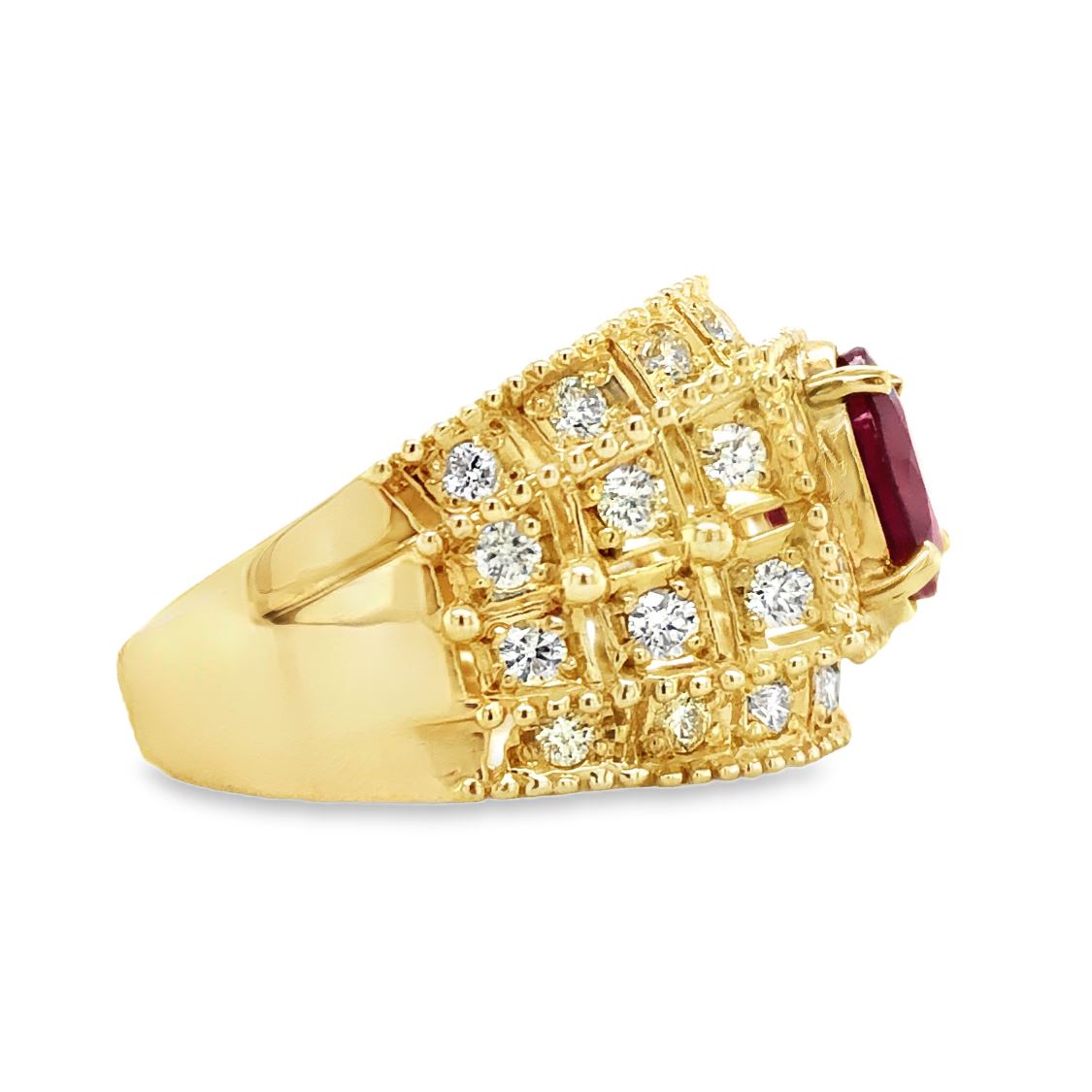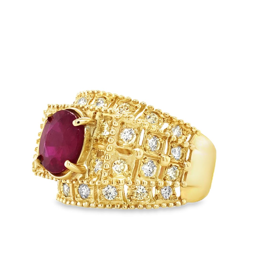 DESCRIPTION DETAIL: This beautiful ruby ring is set in a yellow gold setting with diamonds throughout.