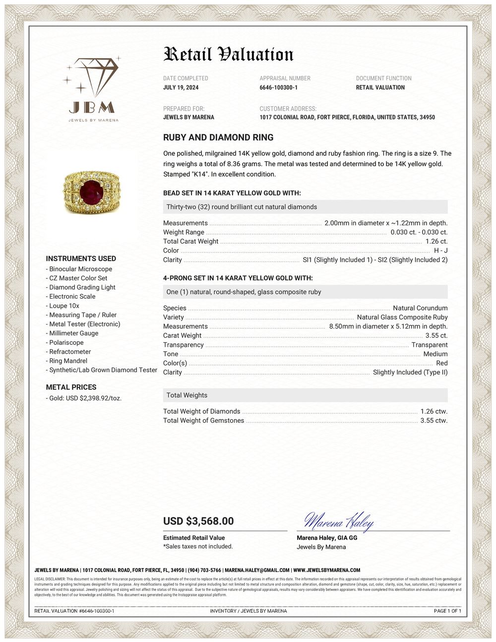 APPRAISAL REPORT: This piece is certified and appraised for $3,568.00 estimated retail replacement value by JBM