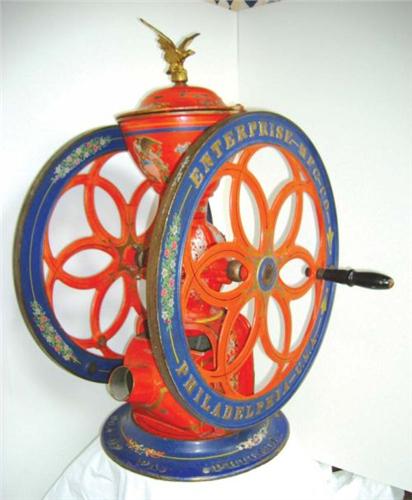 Large Enterprise Coffee Grinder, No. 12. Patented July 12, 1899. In Excellent condition with most of its original paint and decals. Complete with the original painted tin coffee catcher. One of the nicest ones we have ever seen. 36 inches tall and 16 1/2 inches wide with 25 inch wheels.