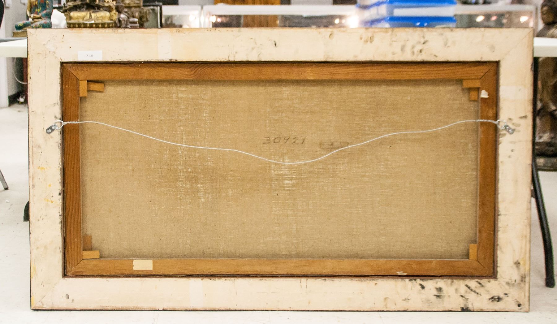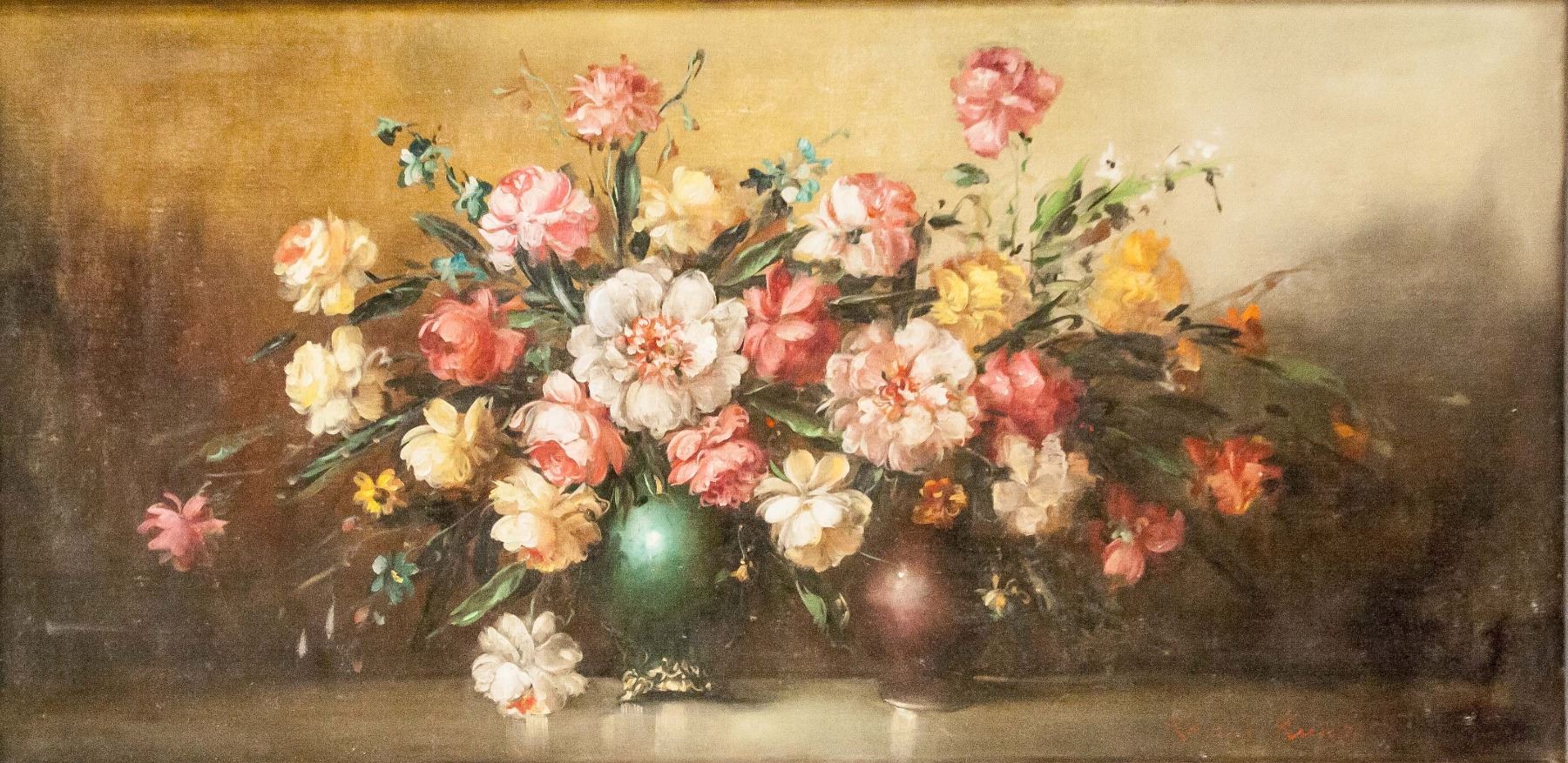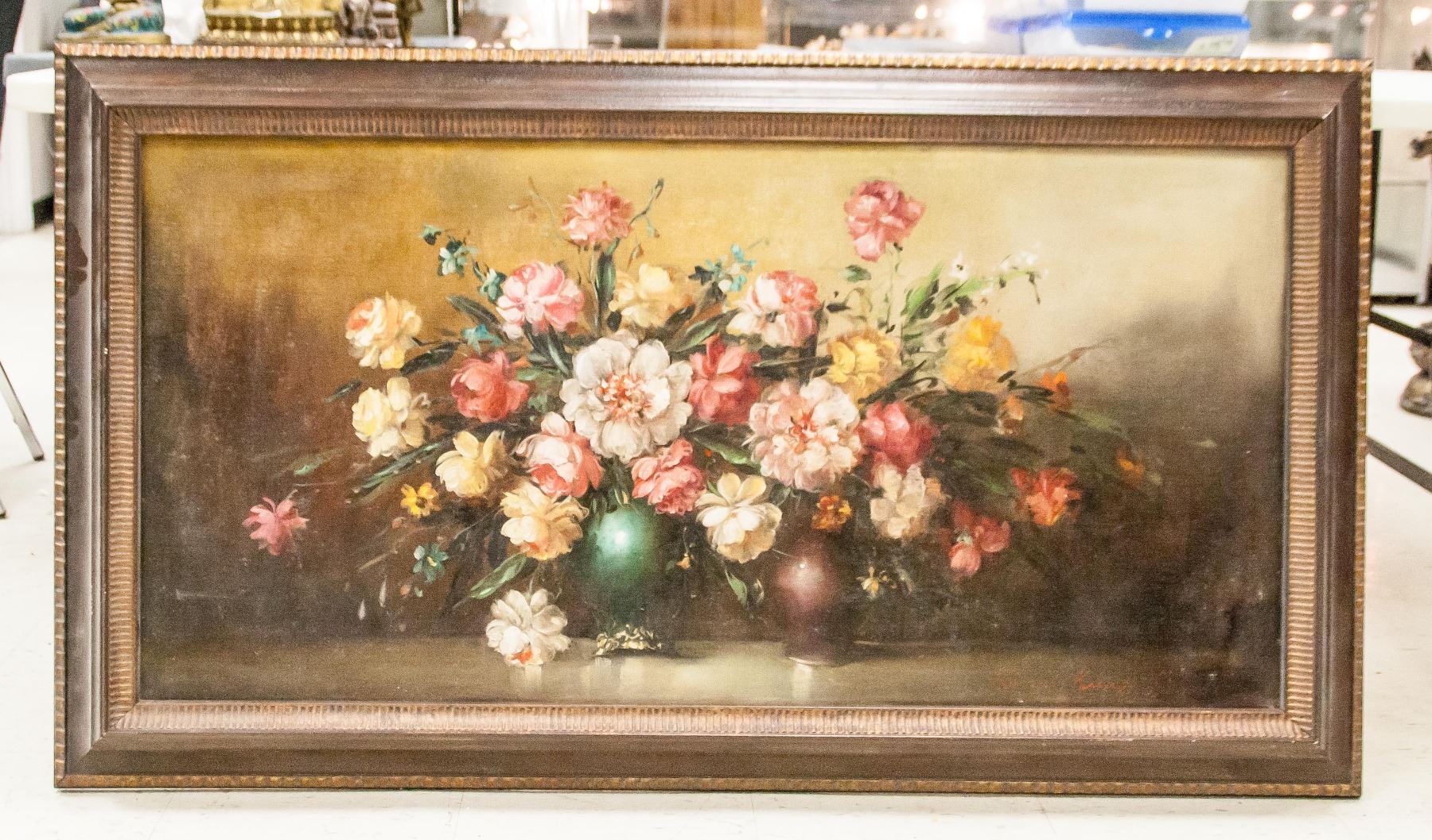 Oil on canvas flower still life. Signed by artist on lower right corner. 23 x 45 inch (58.4 x 114.3 cm).