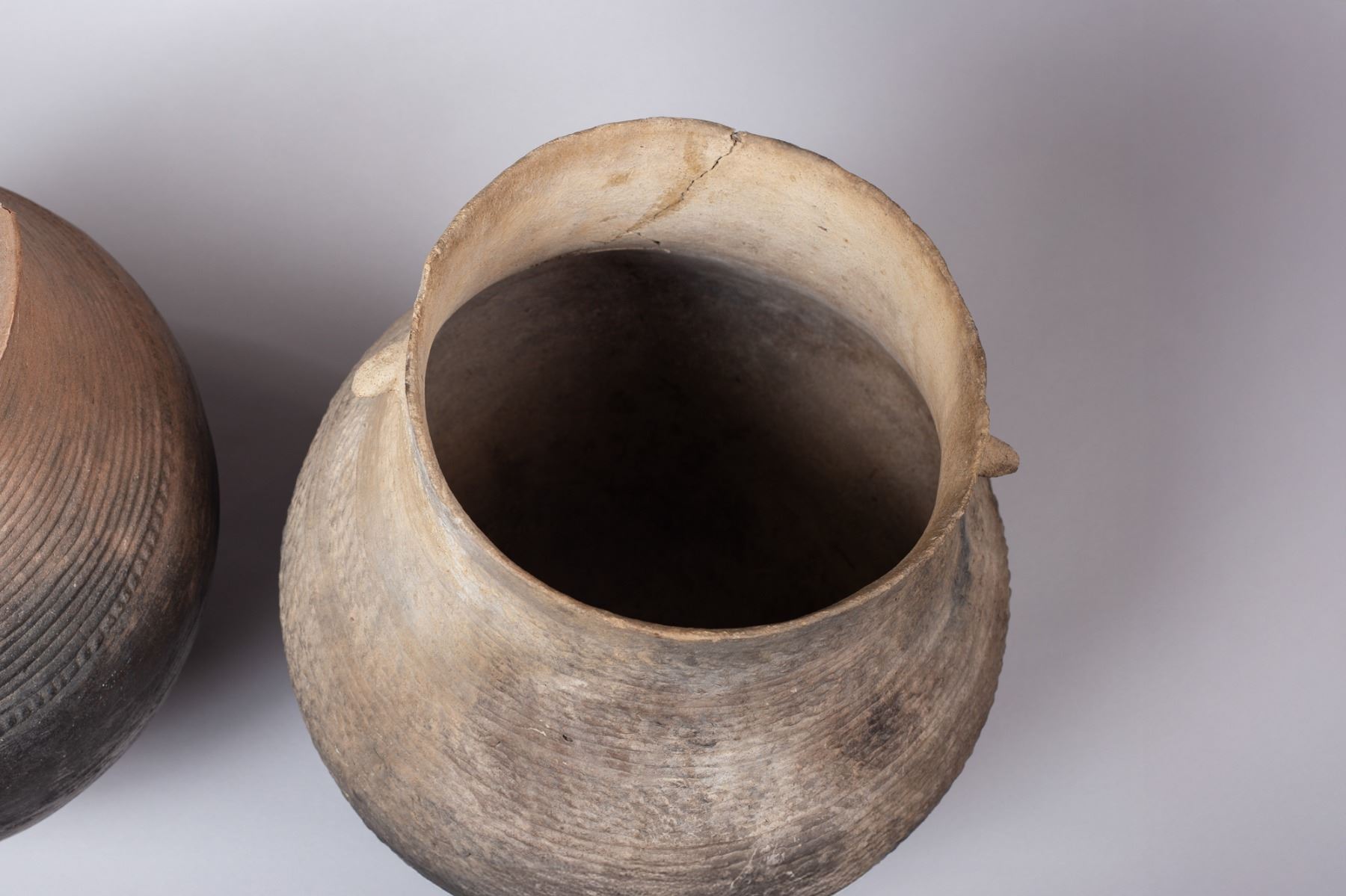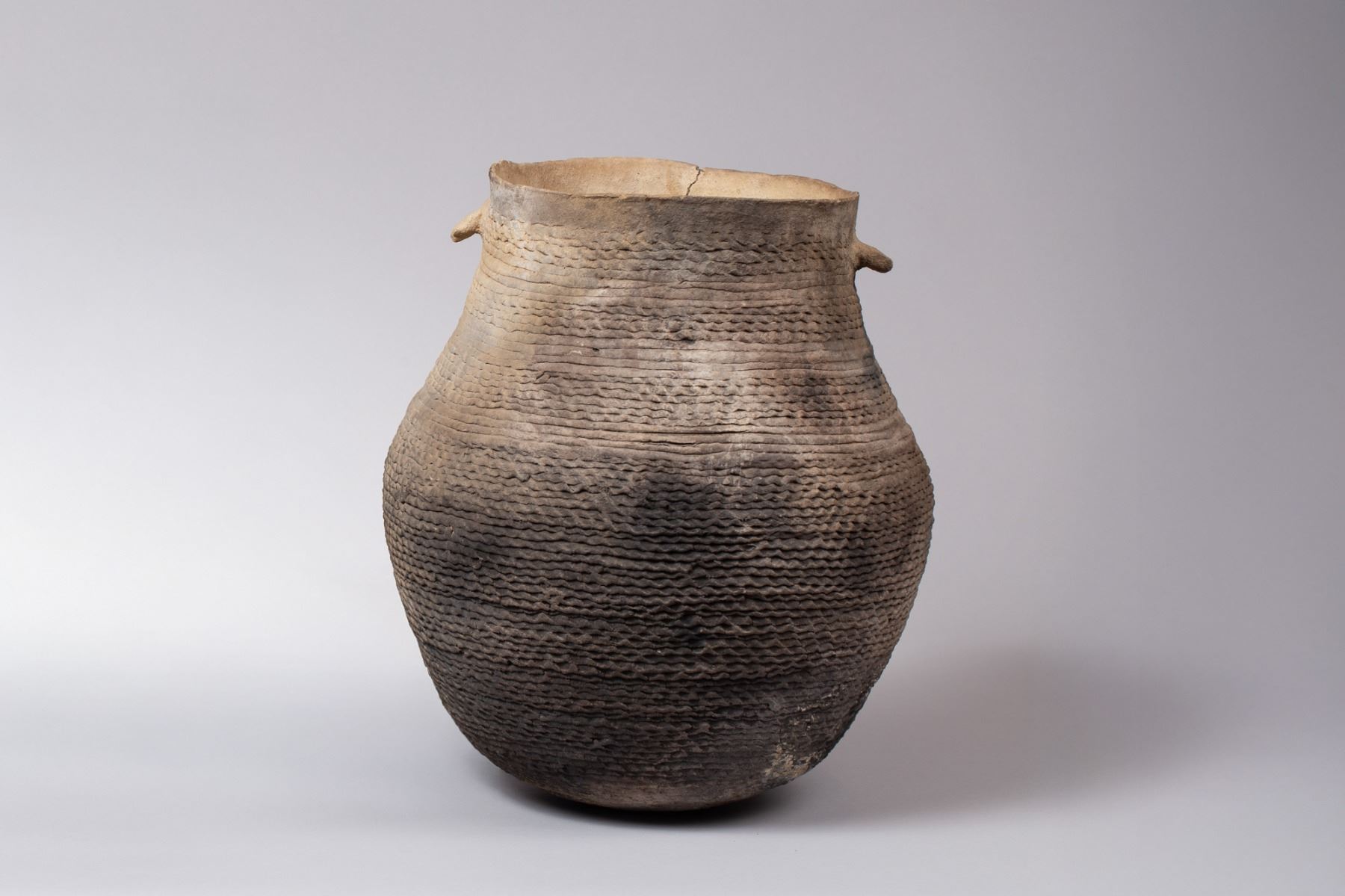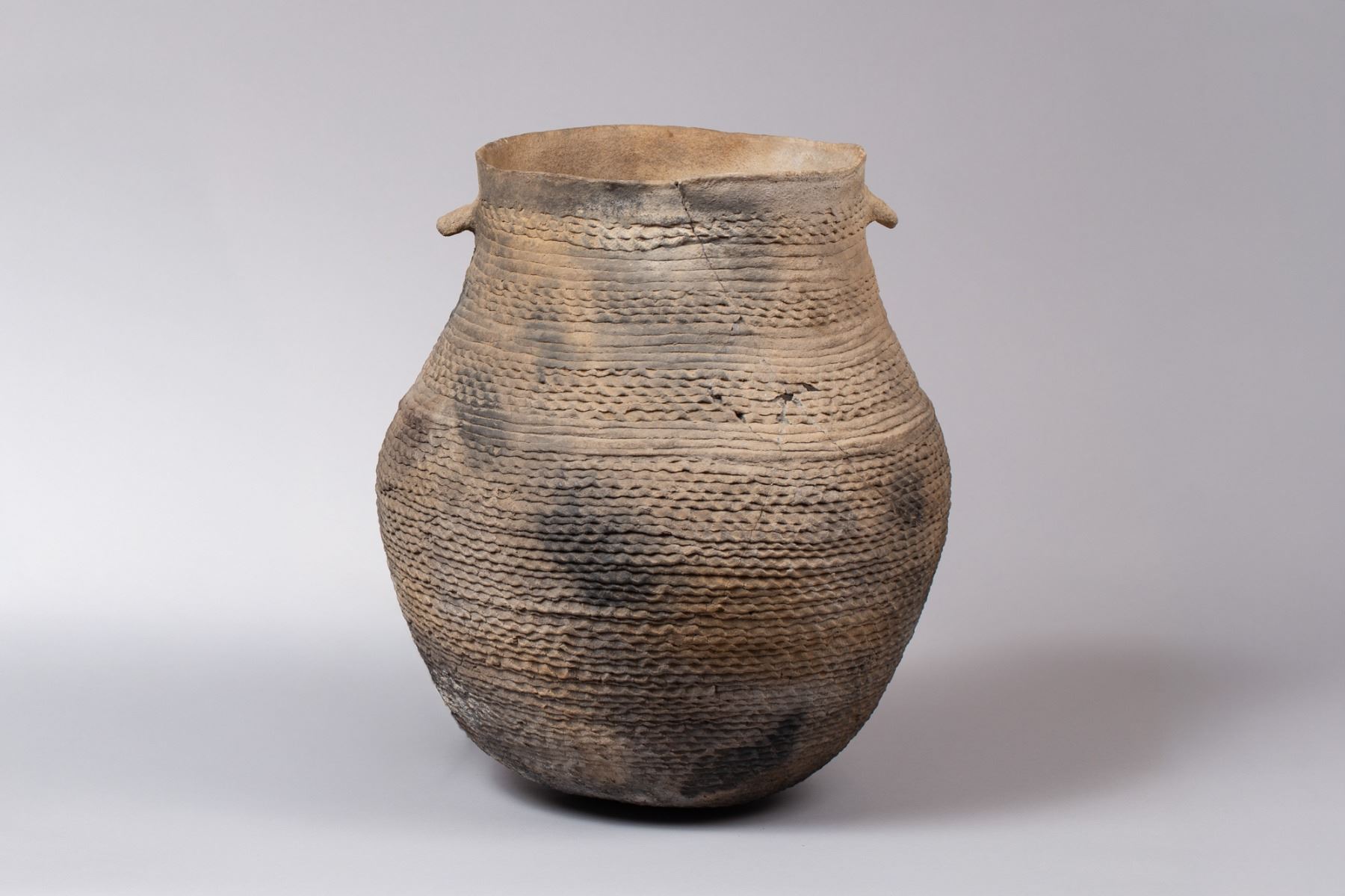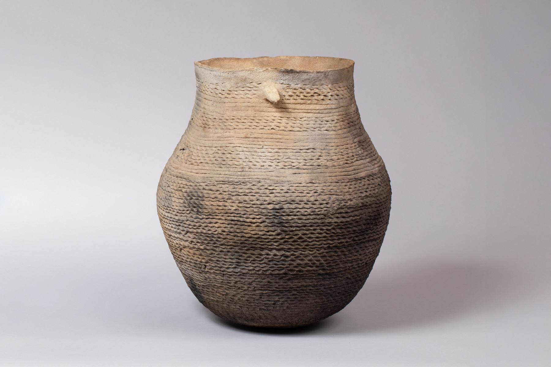 Large Exceptional Corrugated Olla Mesa Verde Cooking Pot, Ca 575 - 1300 AD Details: - Corrugated Olla -With Lug Handles - Alternating Neck Bands - 13 1/4"D, 16 1/4"H Details: - Ancestral Puebloan (Anasazi) corrugated pottery jar, a type of utility ware created between approximately AD 550 and 1450