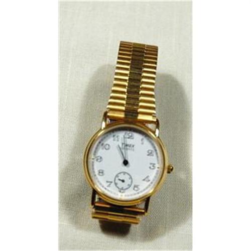 Attractive Timex Watch with a Big easy to read face and sub-dial for the seconds. It comes a a nice goldtone wide twist-o-flex style band. <p> The goldtone bezel measure 1 1/4". The watch will fit a 6" to 7 1/2" and maybe an 8" wrist. Since it stretches the measurement will be approximate.<p> The condition is excellent. It looks to be faily new with zero signs of wear. <p> It comes with a brand new working quartz battery.