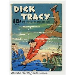 Large Feature Comic #13 - Dick Tracy (Dell, c.1939) Condition: GD/VG. The oversized comic features "Dick Tracy and Scottie of Scotland Yard." The centerfold is detached. Overstreet 2003 GD 2.0 value = $78; VG 4.0 value = $156. Important notice: Heritage usually auctions material at the rate of 200-250 lots per hour. On some occasions eBay Live bid software or the Internet may not be able to keep up with the pace of the auction. We recommend placing a realistic absentee bid now as insurance to avoid disappointment. Occasionally the auctioneer may eliminate or reject an eBay Live bid, and the auctioneer may also reopen a lot after the close of the eBay live bidding (usually because we missed an audience bid), and may reject your bid even if it shows you as the winning bidder. By bidding via eBay Live, you agree that Heritage may award the lot to another bidder at its sole discretion under the circumstances described above or any other reasonable circumstances. Since eBay bids are not shown to us until we open the lot on the floor, we treat those bids just like floor bids. In most cases the floor responds before the eBay bid is presented to us, due to Internet lag time, so for consistency we have made it a policy that floor bids are always considered first over tie eBay live bids. Also please note that all Heritage lots purchased through eBay Live carry a 20% Buyer's Premium. Please make sure you read the Terms and Conditions before you bid.