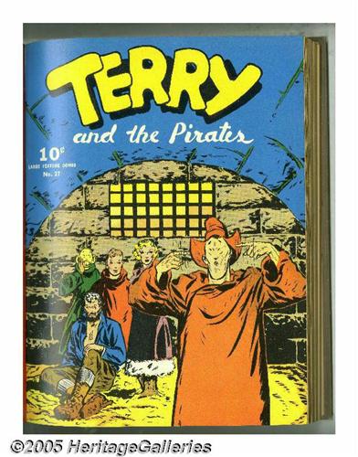 <B>Large Feature Comic Bound Volumes (Dell, 1941-43).</B></I> These large-format comics are "seldom found in fine to mint condition" according to Overstreet. While these file copies have of course been trimmed for insertion into these bound volumes, they're still among the nicest-looking copies of the issues you're likely to find. Included in these two hardcover volumes are #21-30 from Series I and #11-13 from Series II. Notable issues include <B>Popeye</B></I> (#24), <B>Terry and the Pirates</B></I> (#27) and <B>1001 Hours of Fun</B></I> (#13, a Gerber "7") Approximate Overstreet VG 4.0 value for group = $700. <I>From the Random House Archives.</B></I>