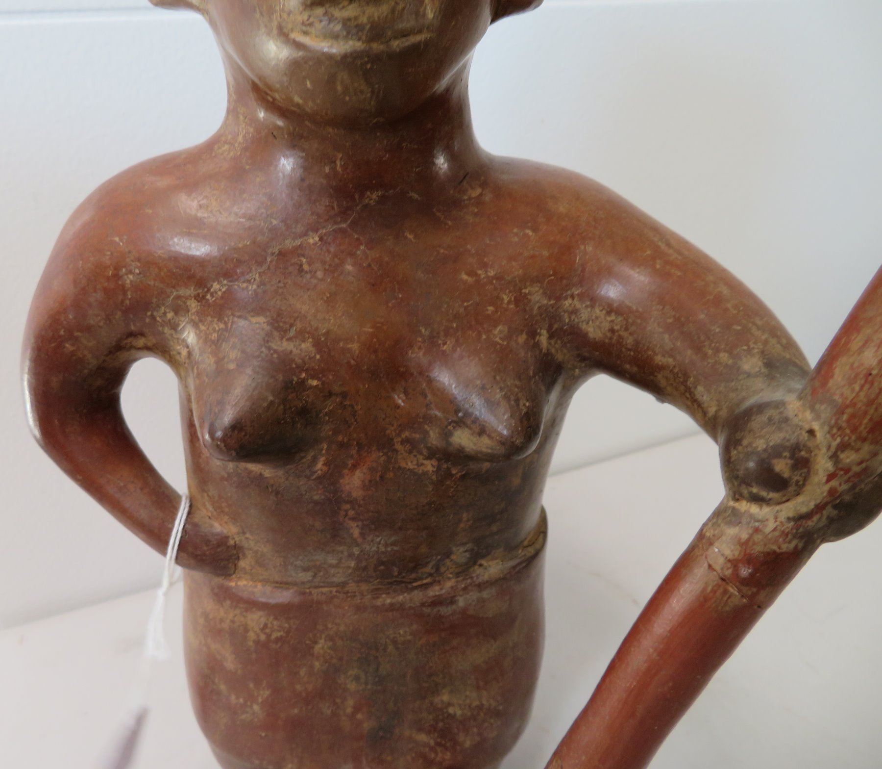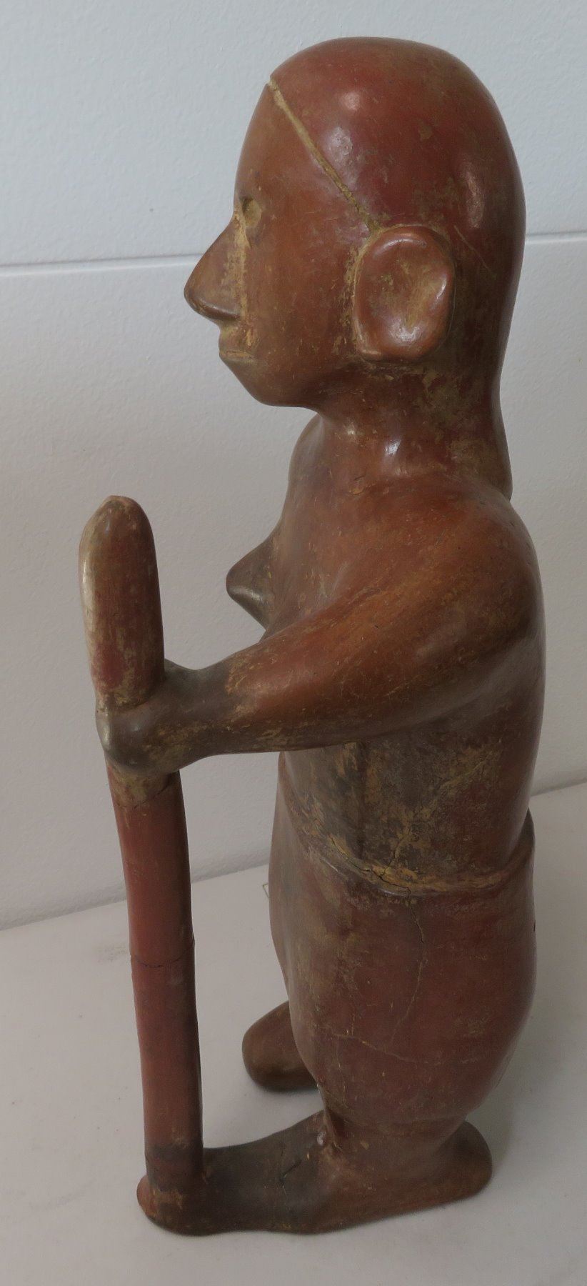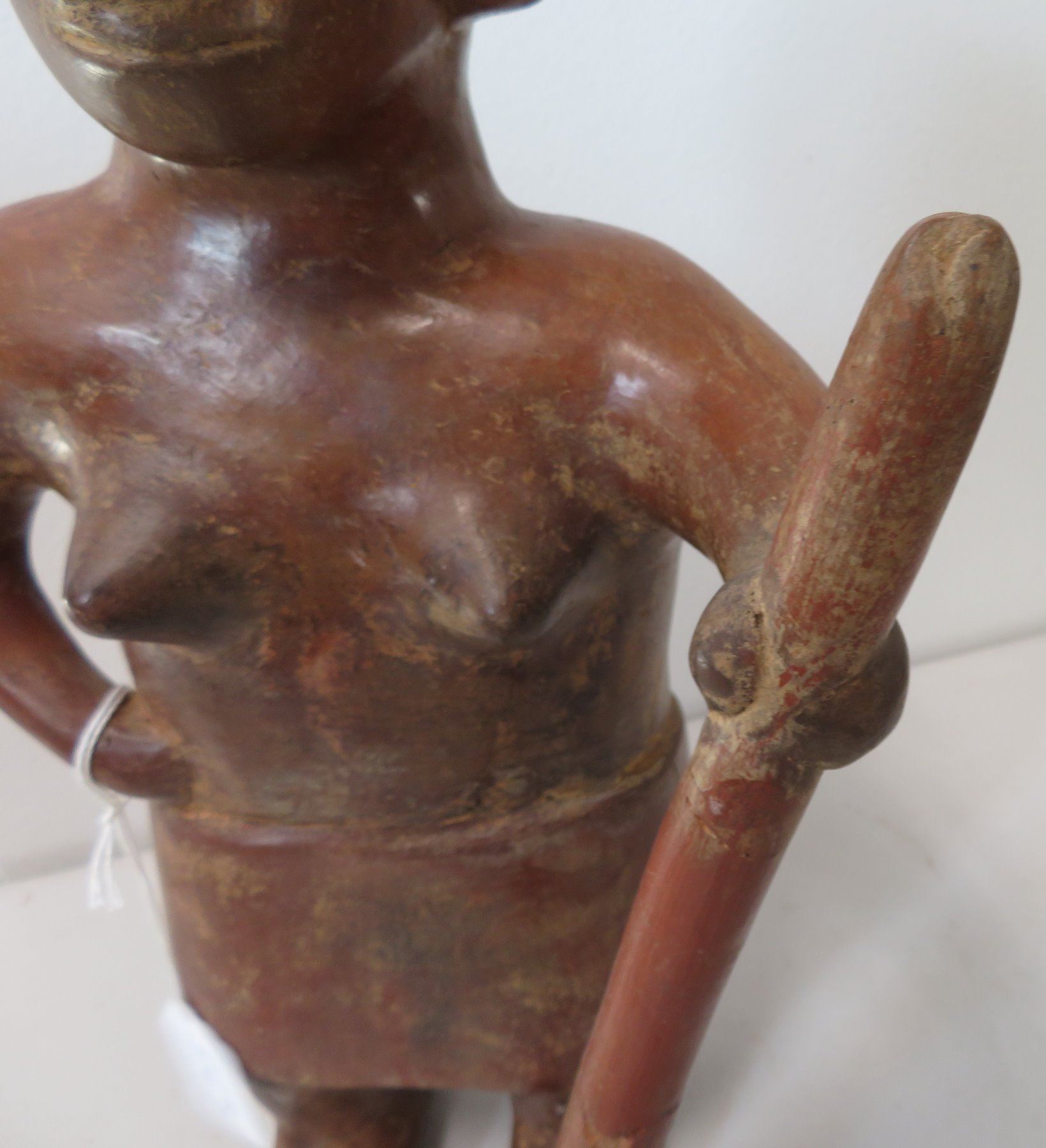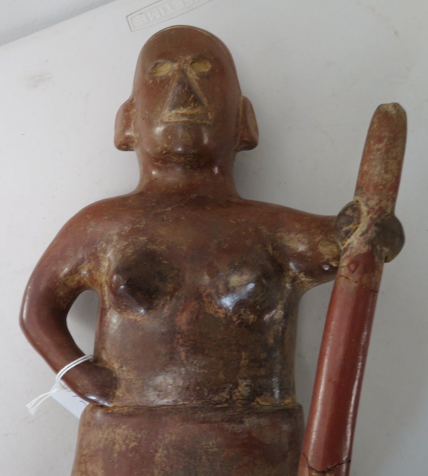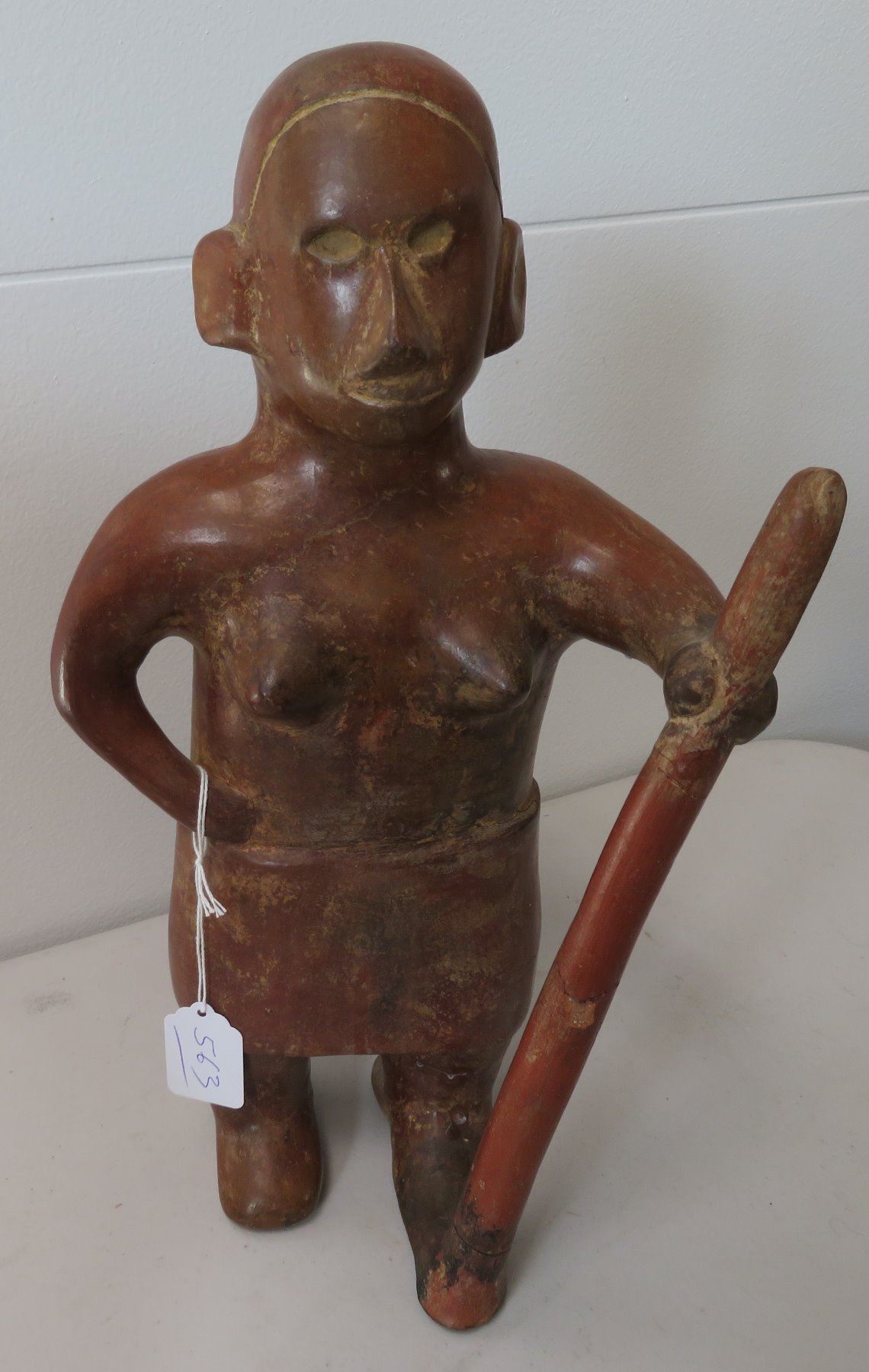 Large Female Figure w/Staff, pre-Columbian item. Made of clay and paint, the item measures 14 3/4" x 7" x 6". Colima, Mexico. From an old and large, Rancho Sante Fe, Calif. estate, originally collected by a dentist. Condition: Cracked and glued, see images. Shipping: $65.00 USA estimate only, due to size, weight and value, double-boxed.