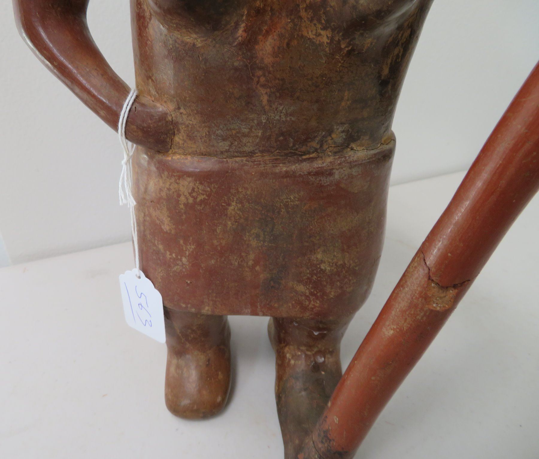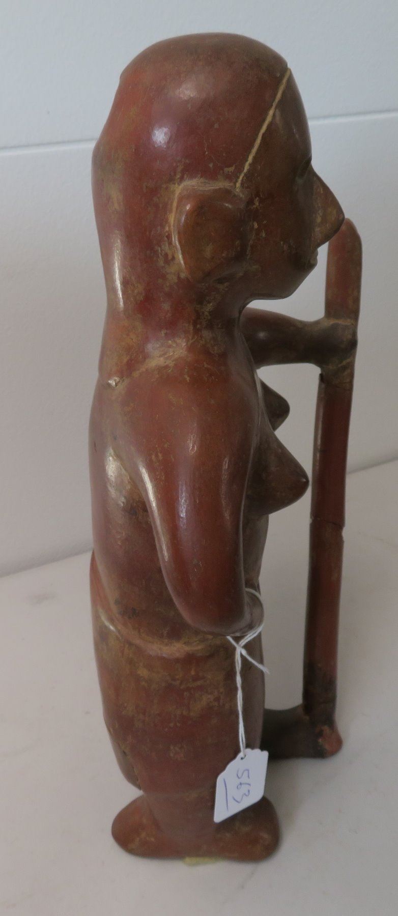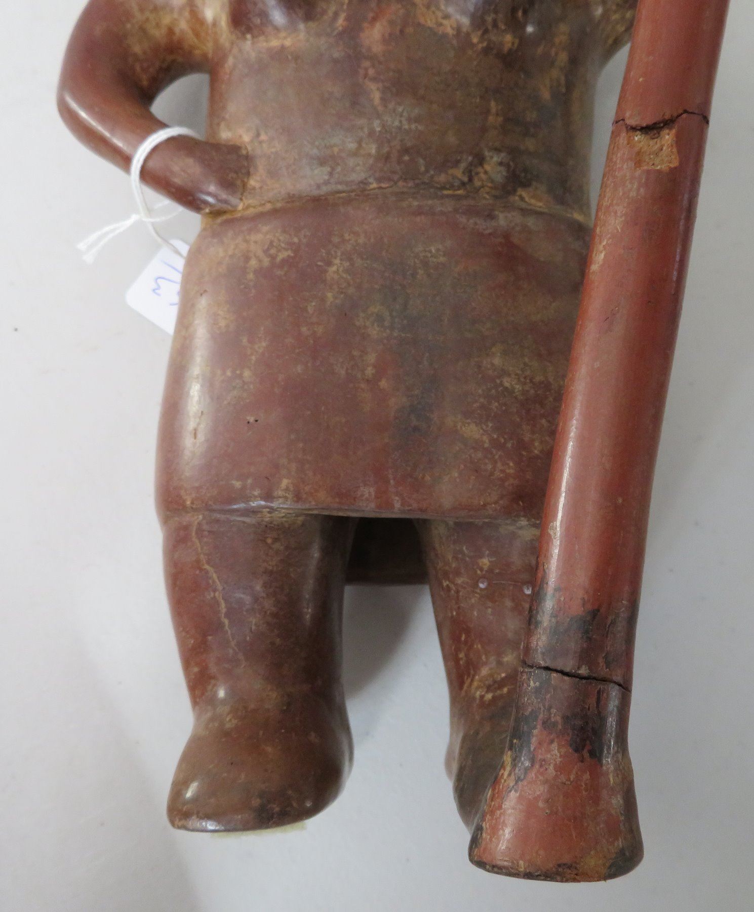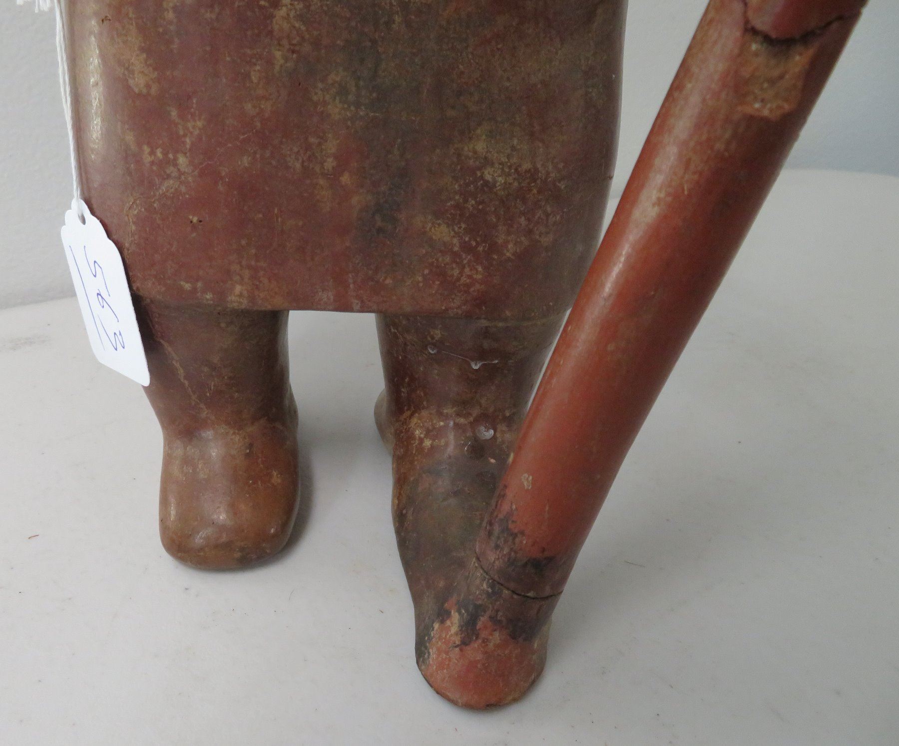 Large Female Figure w/Staff, pre-Columbian item. Made of clay and paint, the item measures 14 3/4" x 7" x 6". Colima, Mexico. From an old and large, Rancho Sante Fe, Calif. estate, originally collected by a dentist. Condition: Cracked and glued, see images. Shipping: $65.00 USA estimate only, due to size, weight and value, double-boxed.