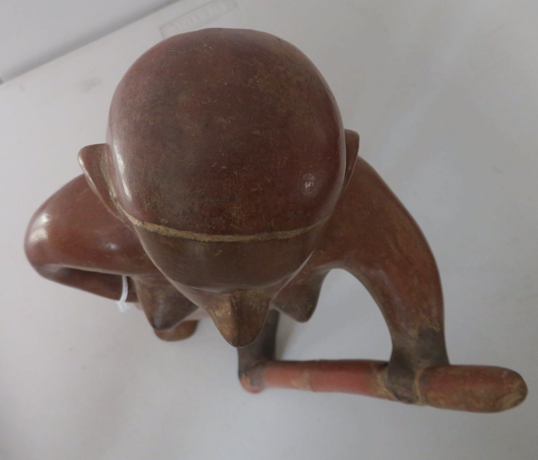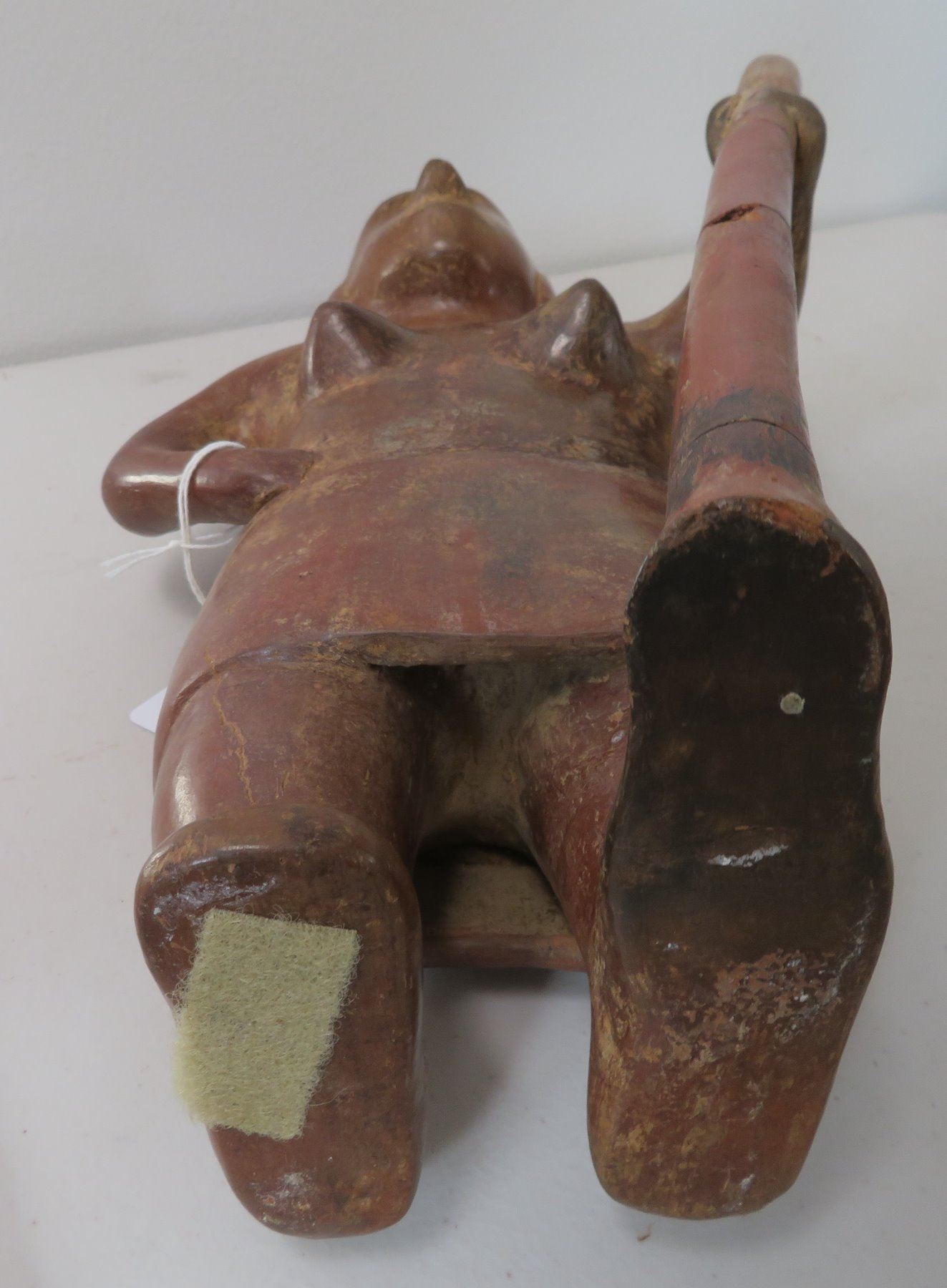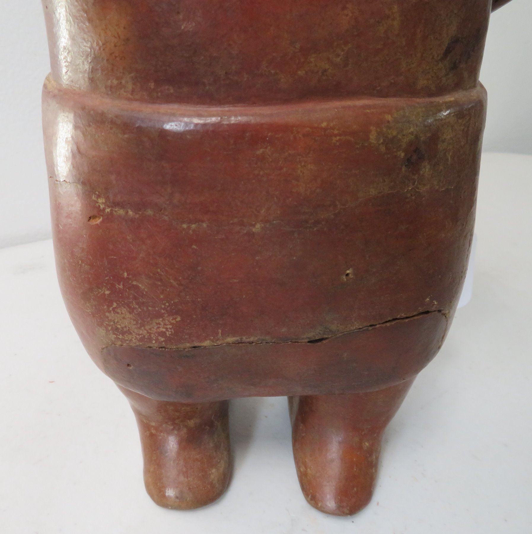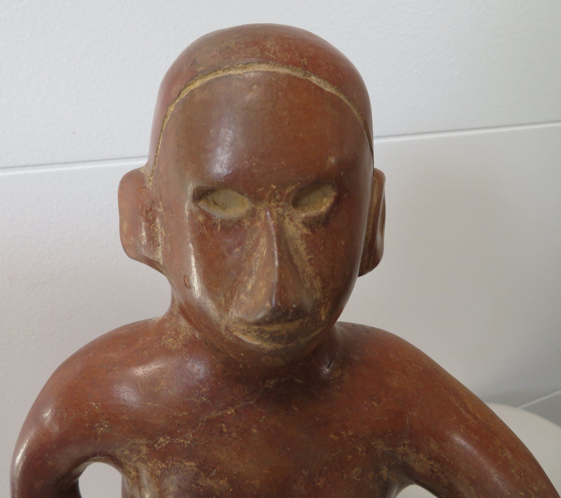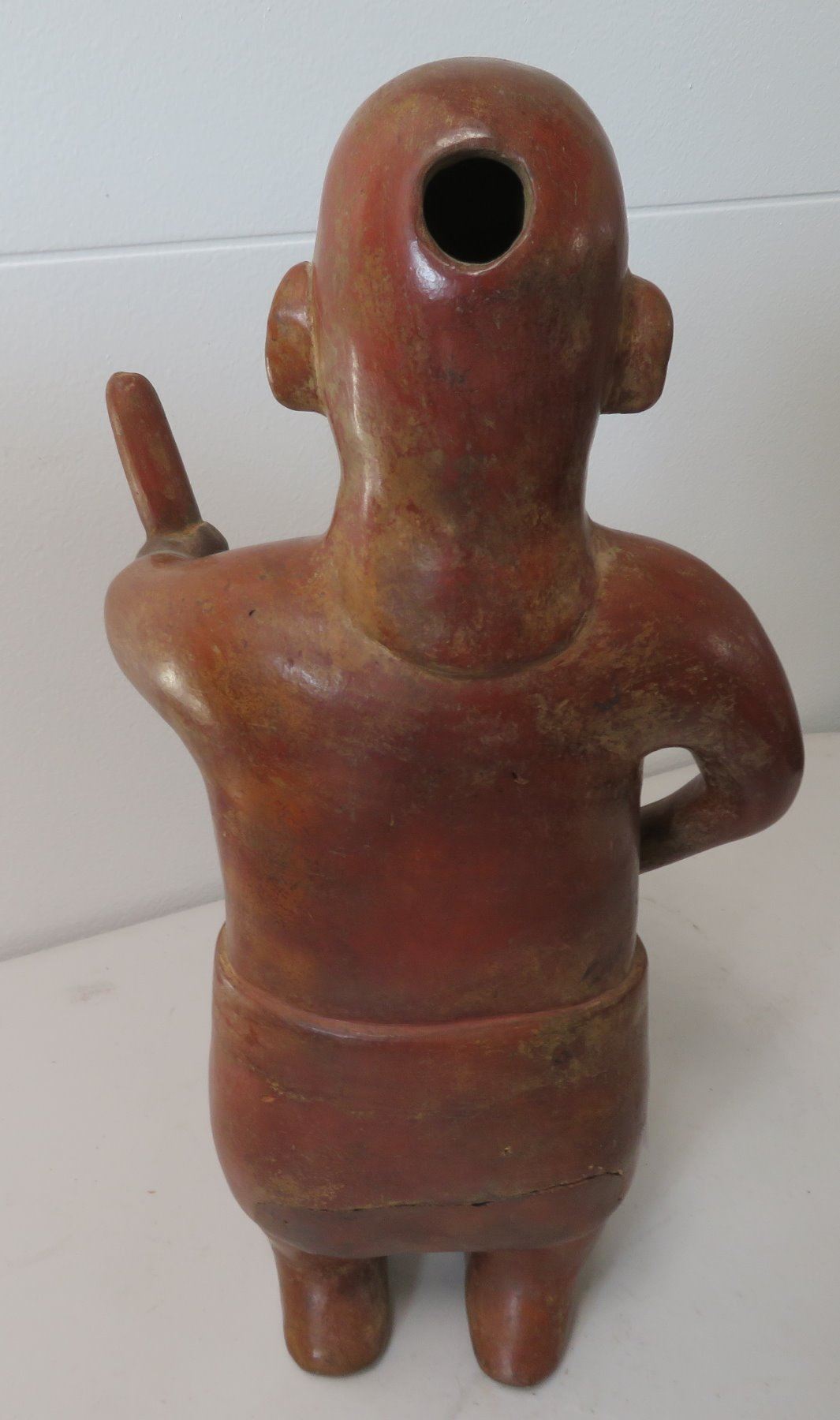 Large Female Figure w/Staff, pre-Columbian item. Made of clay and paint, the item measures 14 3/4" x 7" x 6". Colima, Mexico. From an old and large, Rancho Sante Fe, Calif. estate, originally collected by a dentist. Condition: Cracked and glued, see images. Shipping: $65.00 USA estimate only, due to size, weight and value, double-boxed.