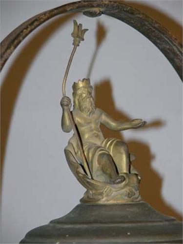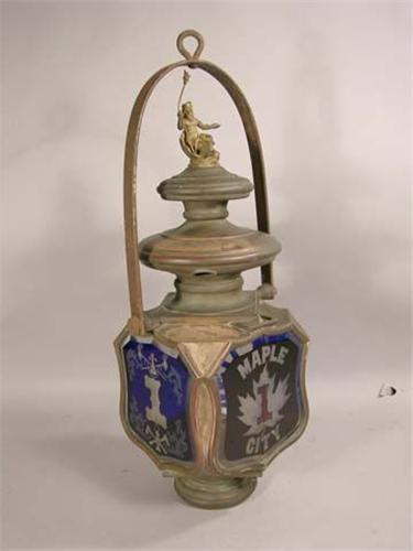 Large fire engine lamp for Maple City. Copper/brass with Neptune Finial - 1 lens cracked. 23" tall, good original cond.