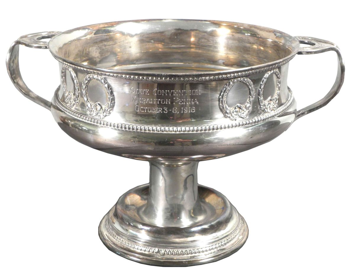 Large Fireman's Presentation Loving Cup. Silver plated. Presented by The Bureau of Fire, Scranton, Penna. For second largest company in line uniformed. State Convention, Scranton, Penna. Oct 3-6, 1916. Good original condition. 10 inches tall X 9 inches wide.
