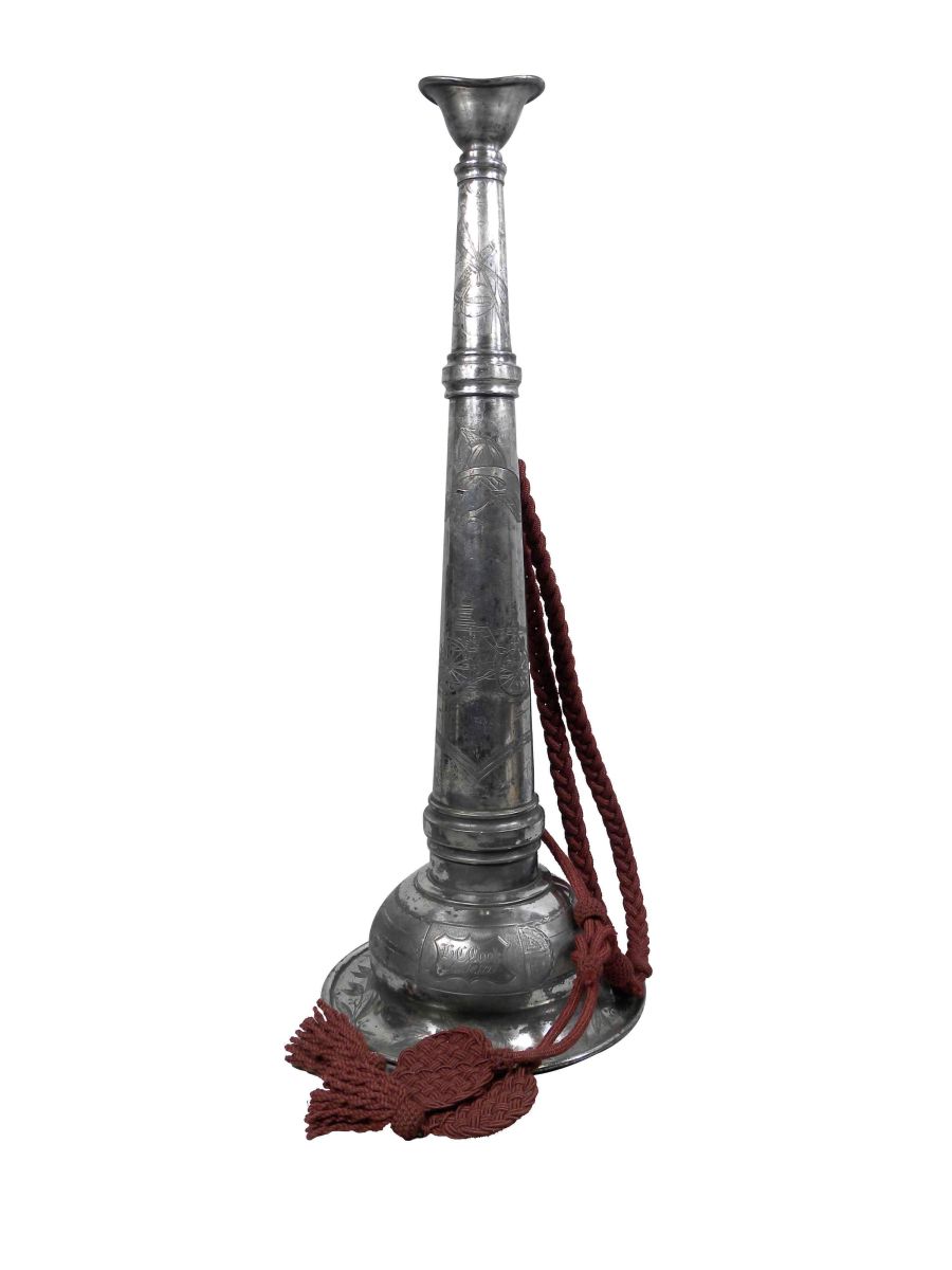 Large Fireman's Presentation Trumpet. Rare Derby Style Horn. Heavy and well made with engraved designs throughout. Trumpet has a hand engraved steam fire engine and a presentation which reads: Presented to "H.C. Cook, Jan 1st, 1893" Very Good Condition.Nickel plated brass. Some Nickel wear otherwise very good condition. 23 inches tall.