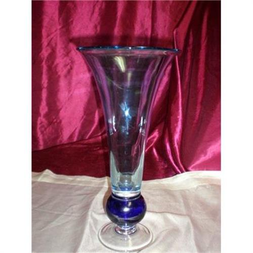 Large Flared Top Colored Vase. This is a very nice and colorful one, and a great size, as it could hold large stem roses with ease, and it is very nicely detailed and designed well. A great piece to show off on any table. The base is clear and then goes into a deep dark blue middle, and then flare up in a lighter blue that just show it off really great. It is one that I do not see any markings, and wonder why, it is that nice. Just the way it was done, is very unique in style and design and color. Will set off any table it sits on. It is 14.25" H X 7" Top and base is 4.5" Diam. I love the size as you can see that it can hold large beautiful flowers and still show it's class and beauty. Hope you like it to.