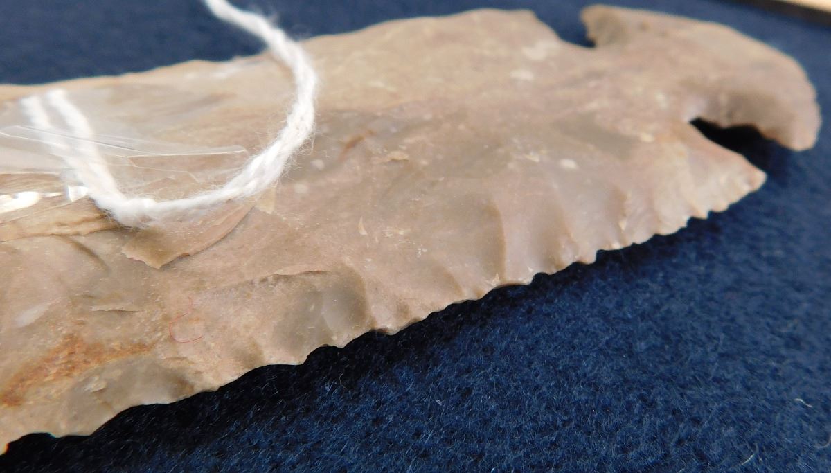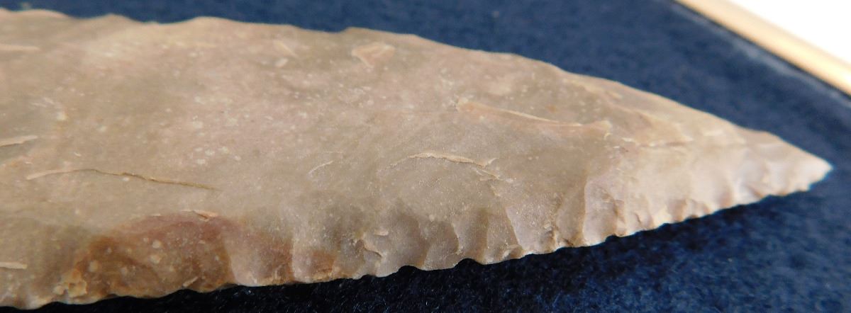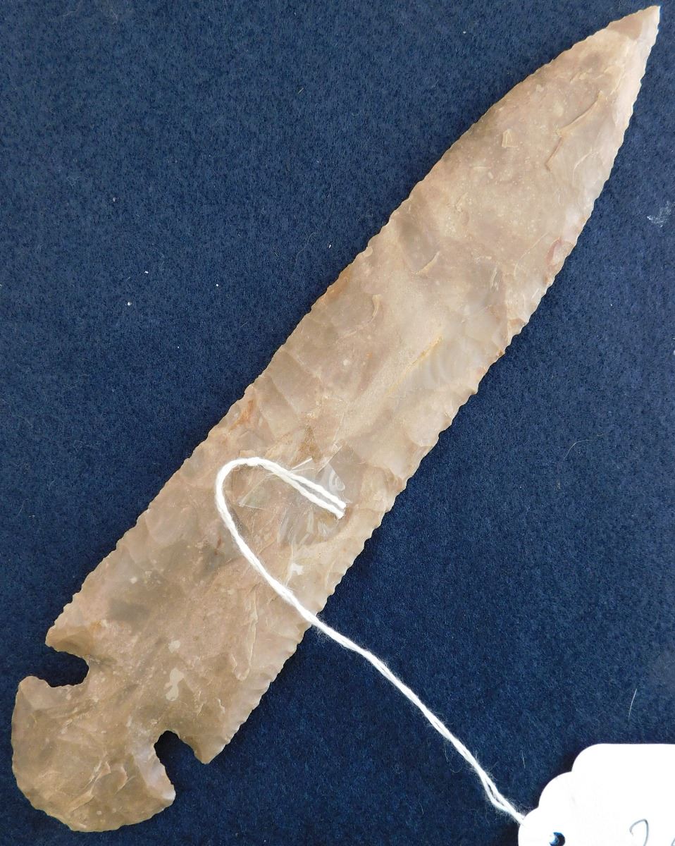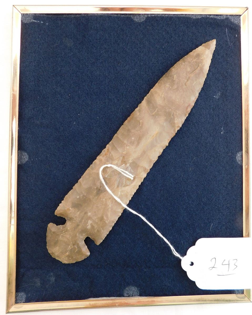 Large Flint Spear, early historic period. Item measures 9" x 1.75". Made of chert, item found in Oklahoma. Large dovetail based flint spear. Frame not included. Condition: Good, see images. Shipping: $19.50.