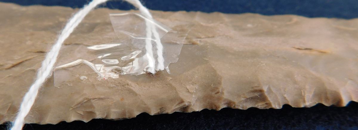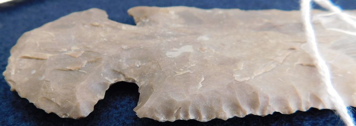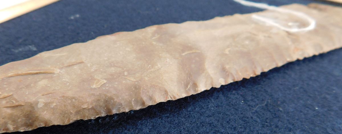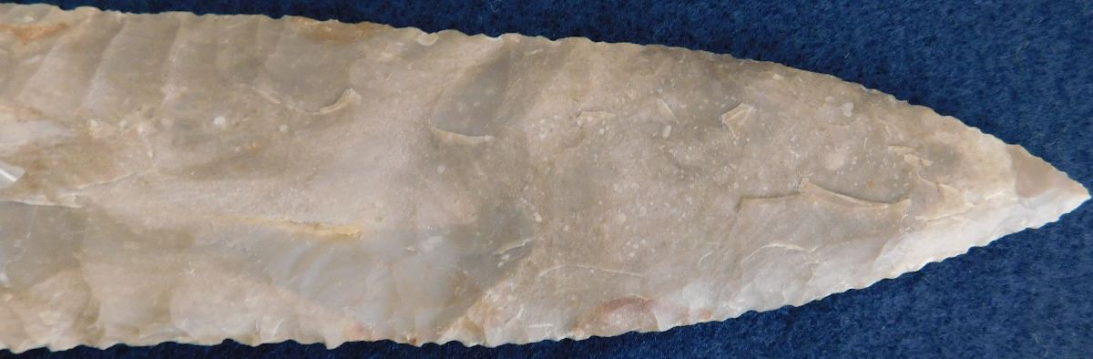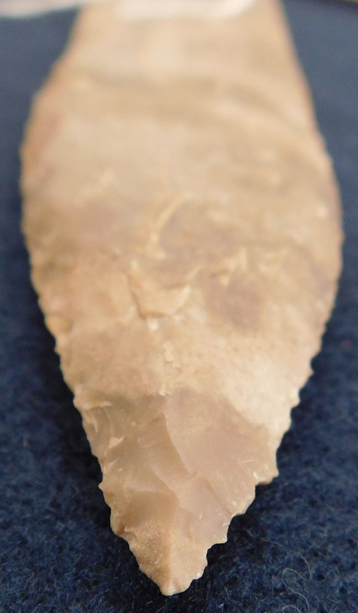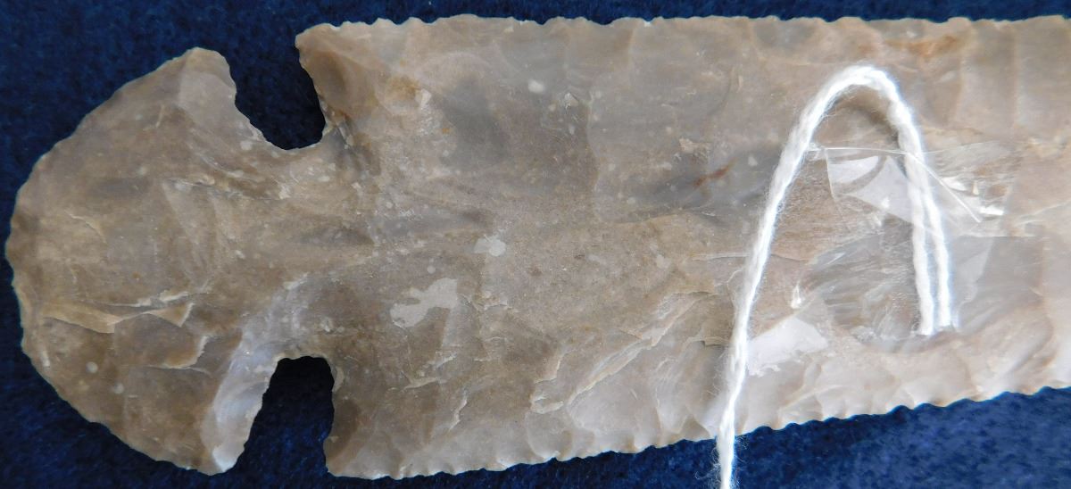 Large Flint Spear, early historic period. Item measures 9" x 1.75". Made of chert, item found in Oklahoma. Large dovetail based flint spear. Frame not included. Condition: Good, see images. Shipping: $19.50.