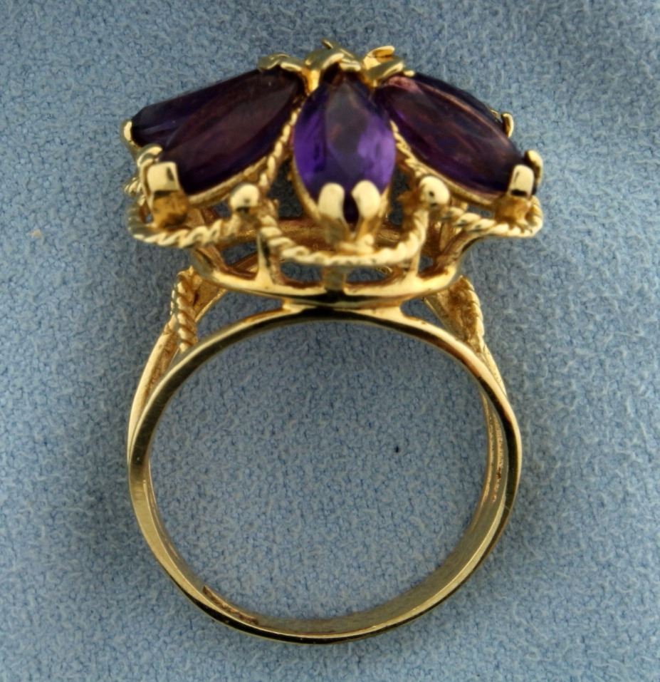 In 14k yellow gold, containing six 10x5mm Marquis Amethyst gemstones with excellent deep purple color. Size 9 1/2. 8.4g.