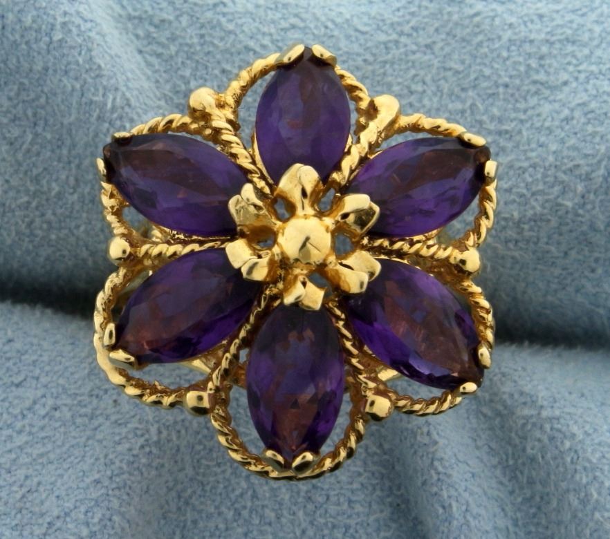 In 14k yellow gold, containing six 10x5mm Marquis Amethyst gemstones with excellent deep purple color. Size 9 1/2. 8.4g.