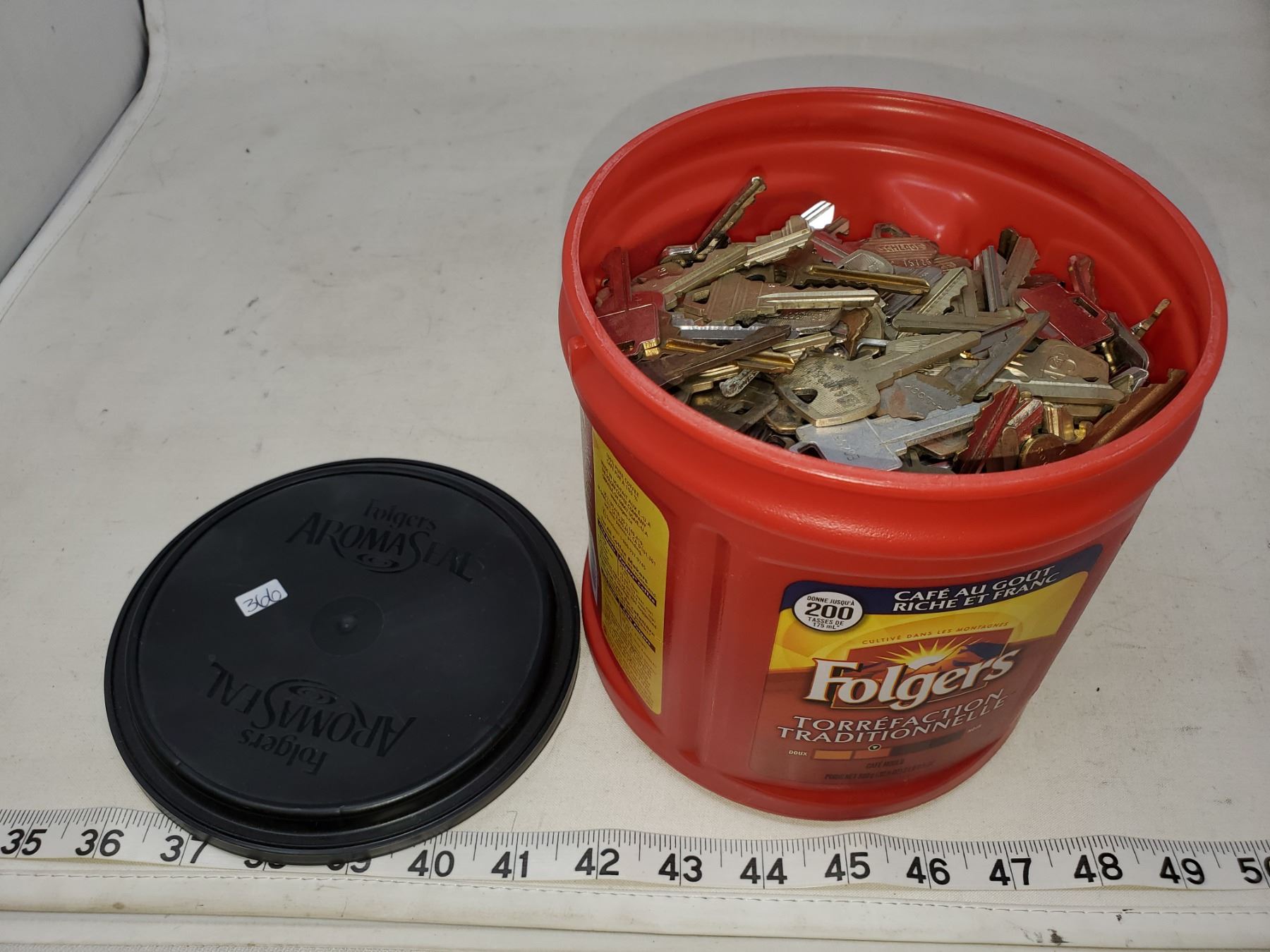 Large Folgers coffee tub filled with keys,Assorted keys