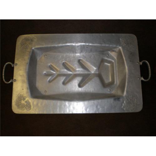 This is a real beautiful Large Footed Hand Hammered Aluminum Serving Tray. It is in great condition just needing a cleaning. It measures 14" deep X 3 1/4" tall X 25 1/4" handle to handle. On each corner it has a lovely leave fine design and in center of tray it has a leaf's stem design. The feet are also hammered wonderfully. Everything about this tray is great. A definite need for any aluminum collector!