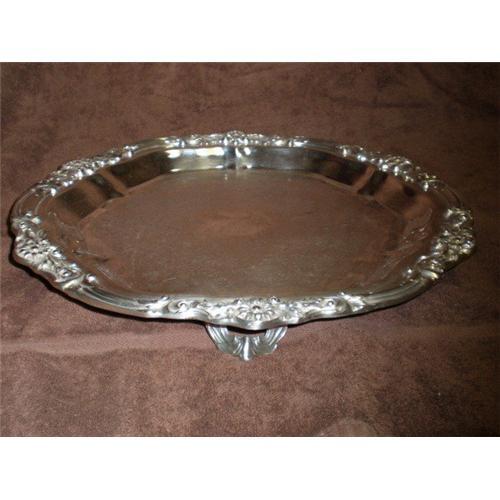 Large Footed Silver plated Tray by F. B. Rogers. This has a real nice raised rose pattern on it. Was wedding gift in 1984 and used a few times. </em></td>