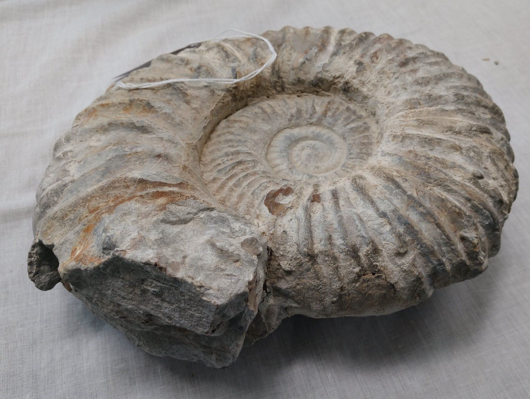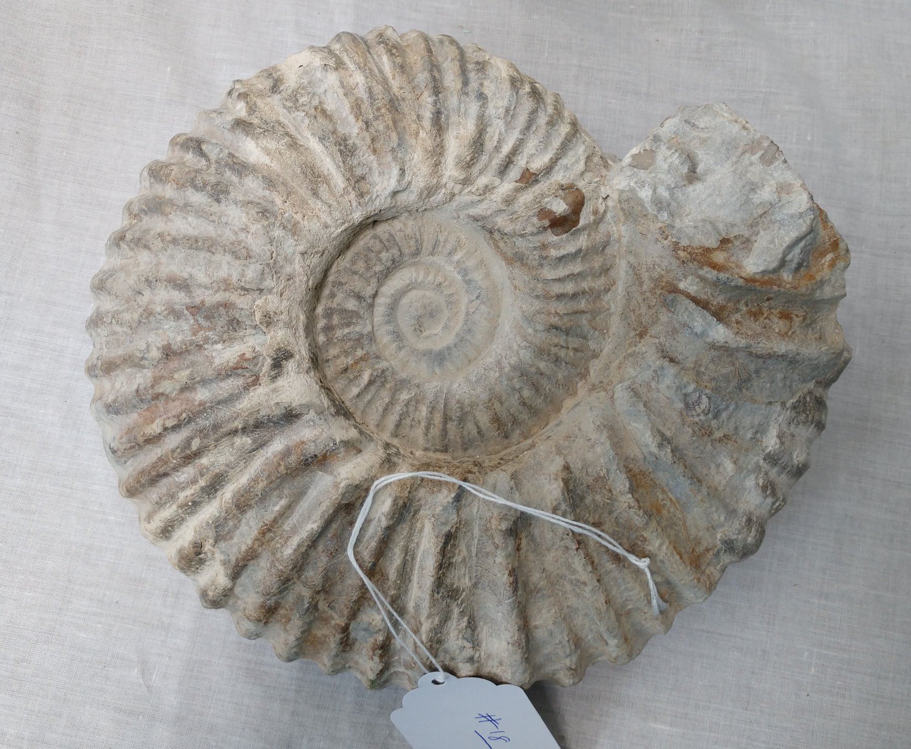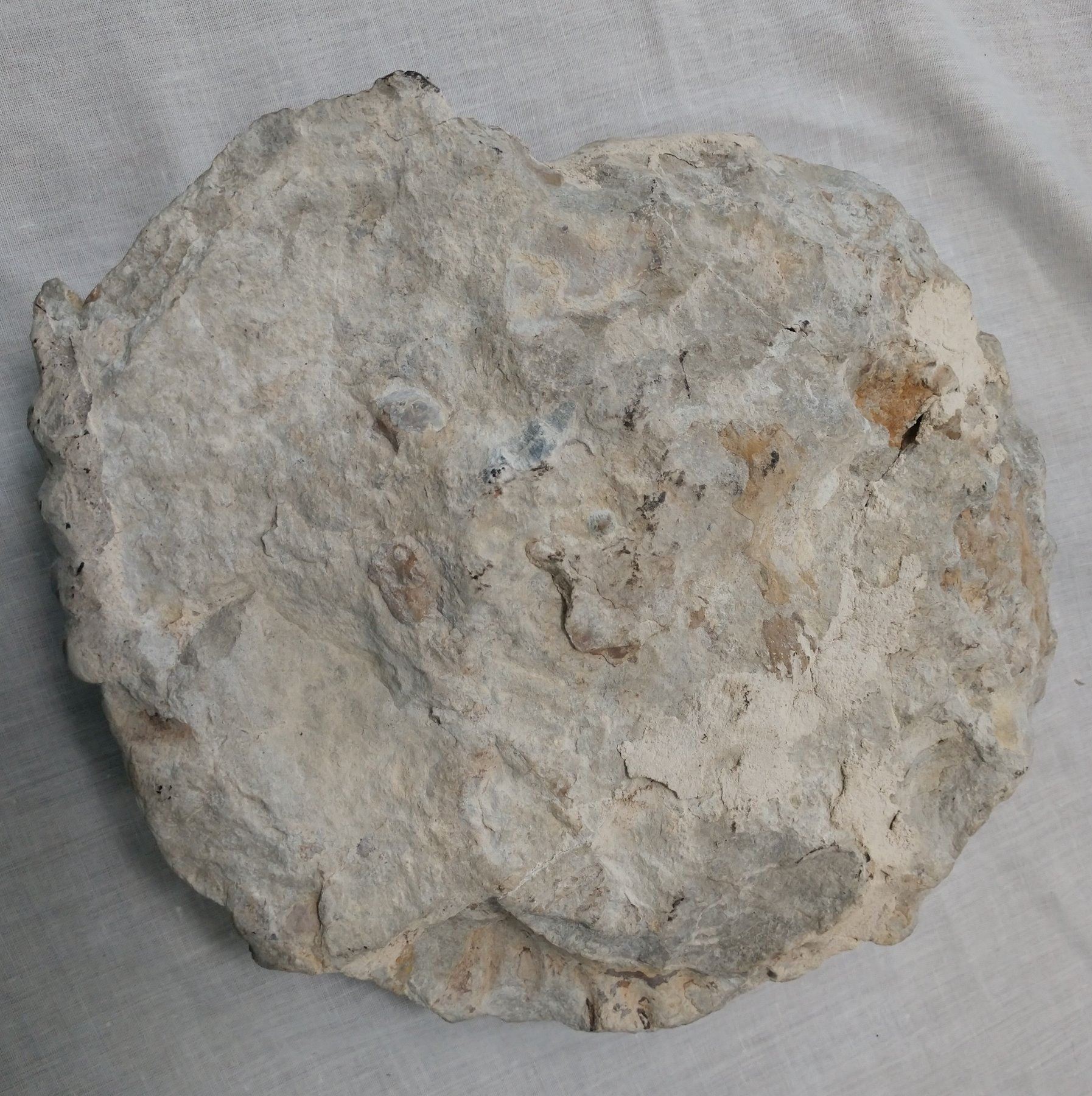 Large Fossil Ammonite, millions of years old. Made of sandstone, the item measures 10" in diameter. Weighs 10 pounds. Baja California, Mexico. Condition: As found, see images. Shipping: $26.00 w/insurance and signature, due to weight.