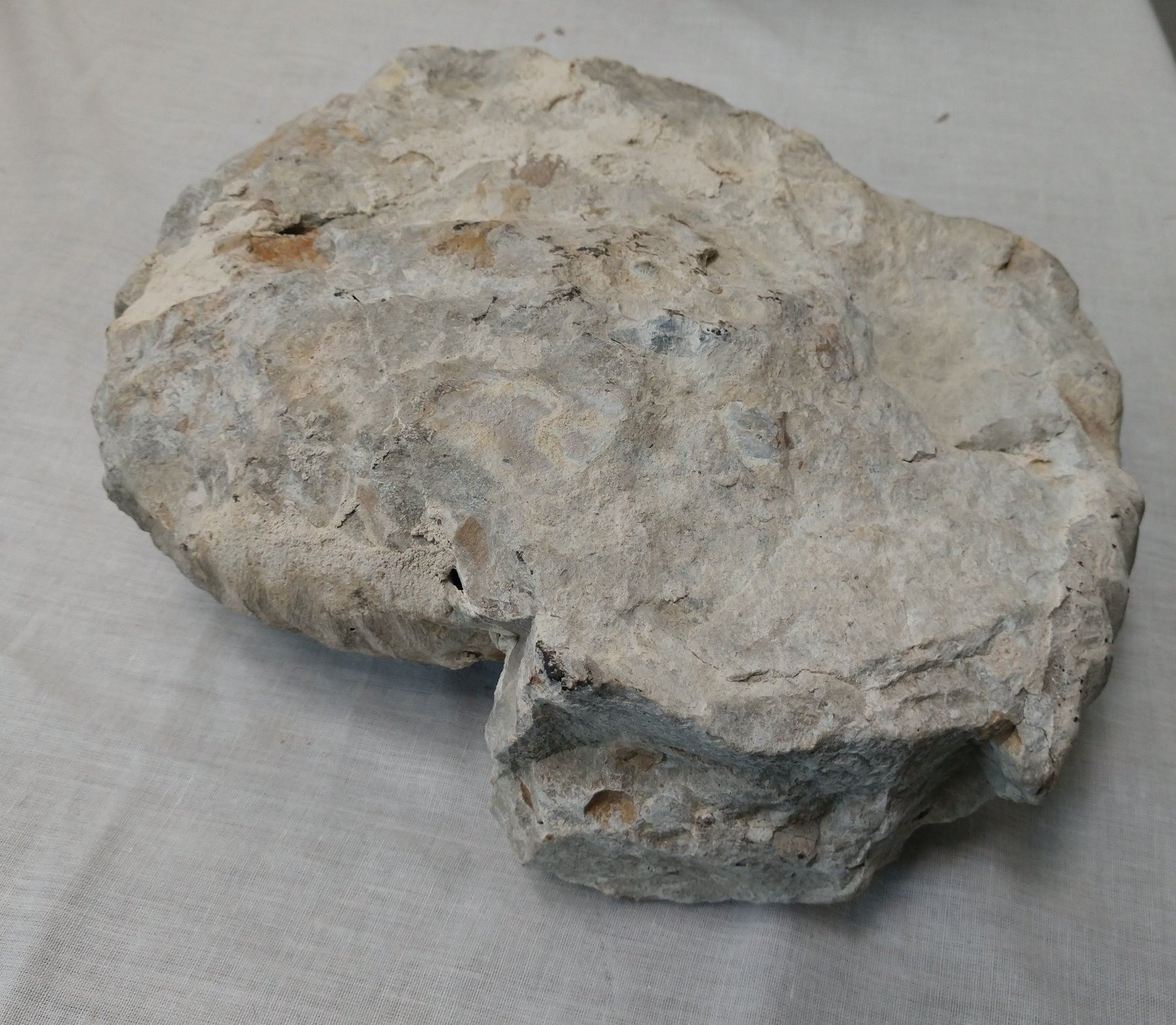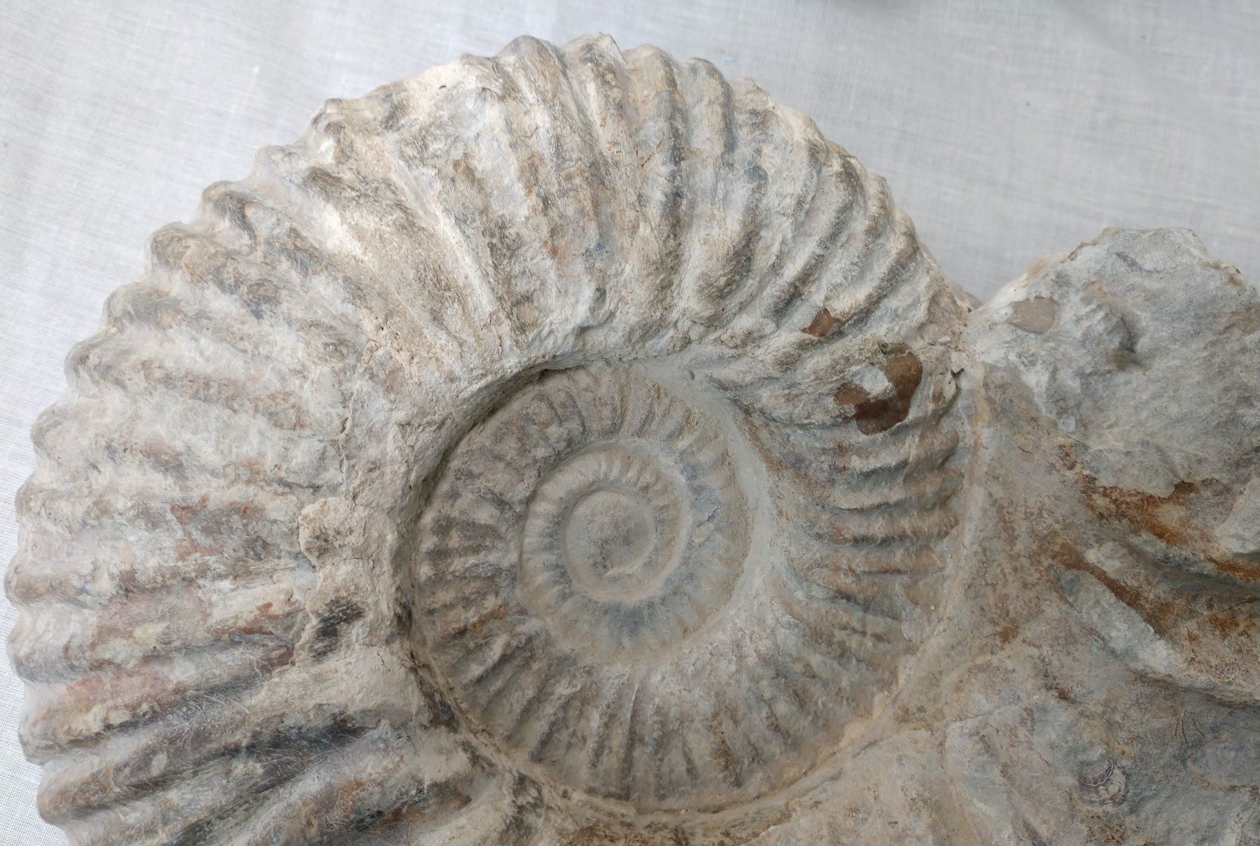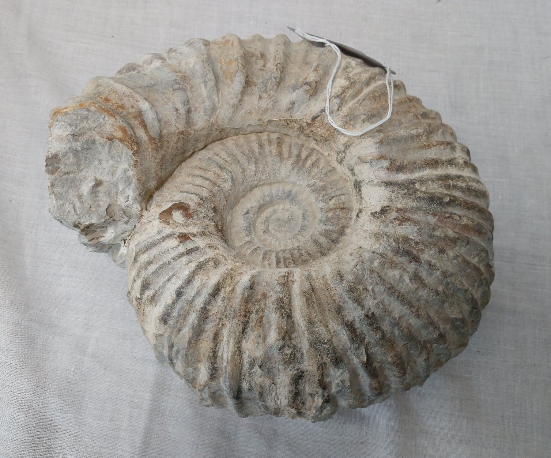 Large Fossil Ammonite, millions of years old. Made of sandstone, the item measures 10" in diameter. Weighs 10 pounds. Baja California, Mexico. Condition: As found, see images. Shipping: $26.00 w/insurance and signature, due to weight.