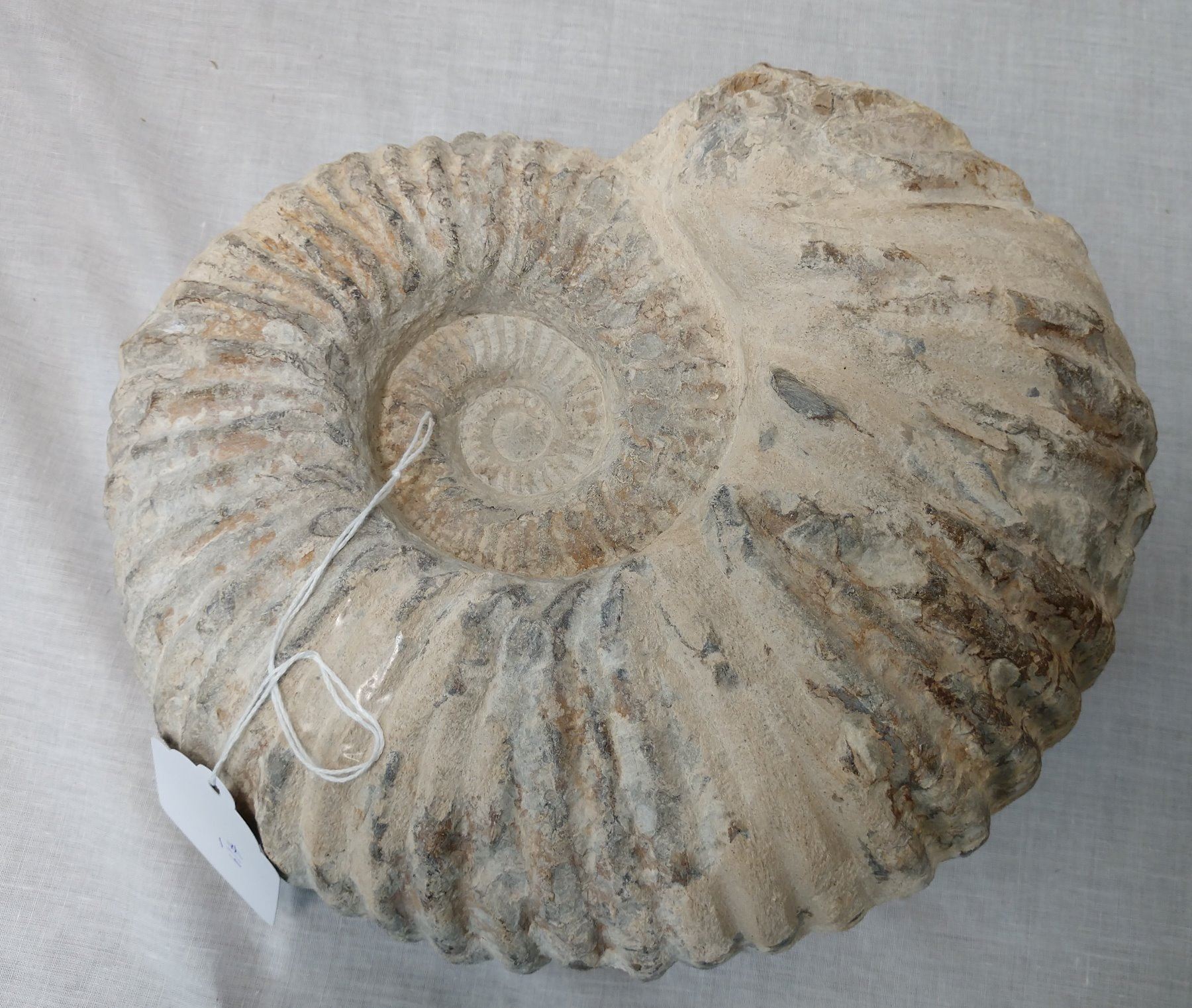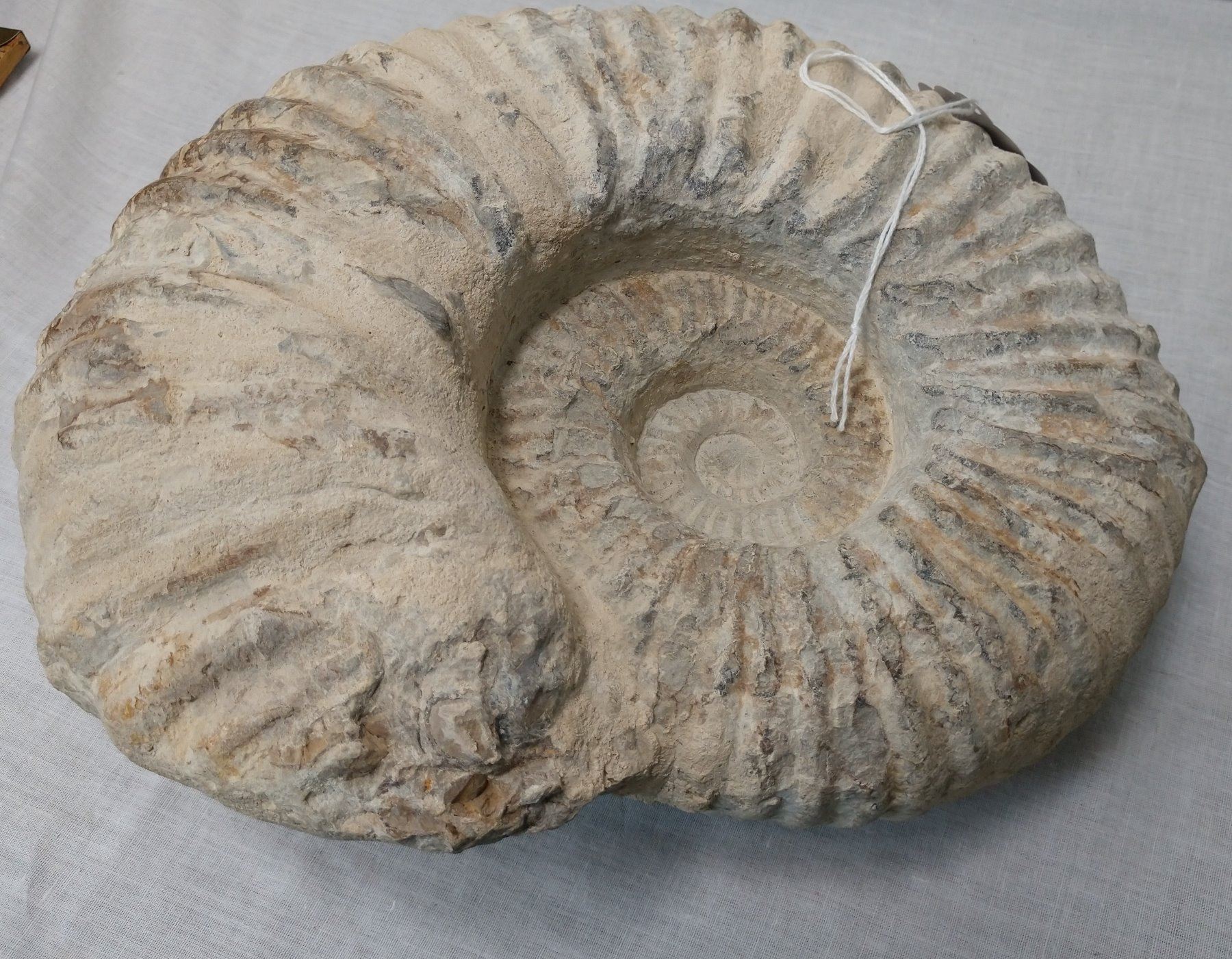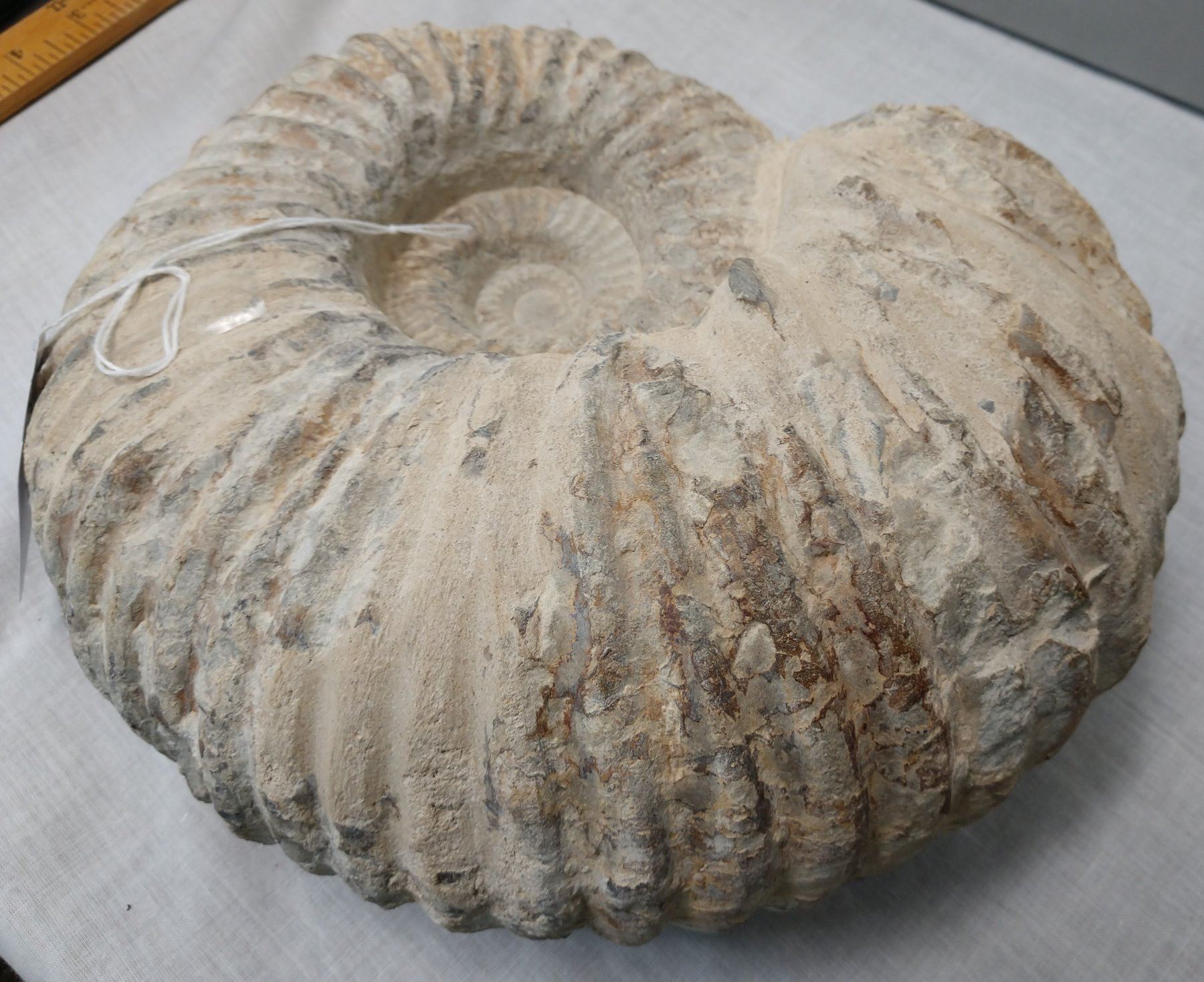 Large Fossil Ammonite, millions of years old. Made of sandstone, the item measures 10" in diameter. Weighs 16.5 pounds. Baja California, Mexico. Condition: As found, see images. Shipping: $26.00 w/insurance and signature, due to weight.
