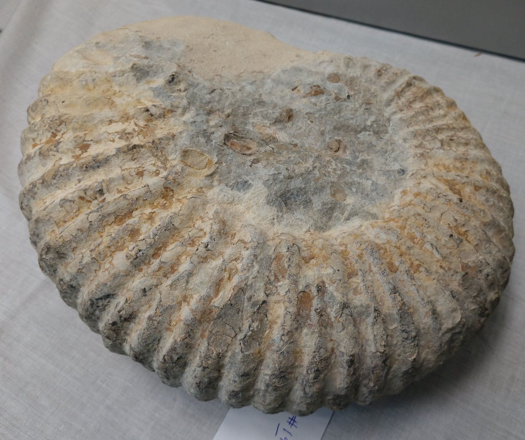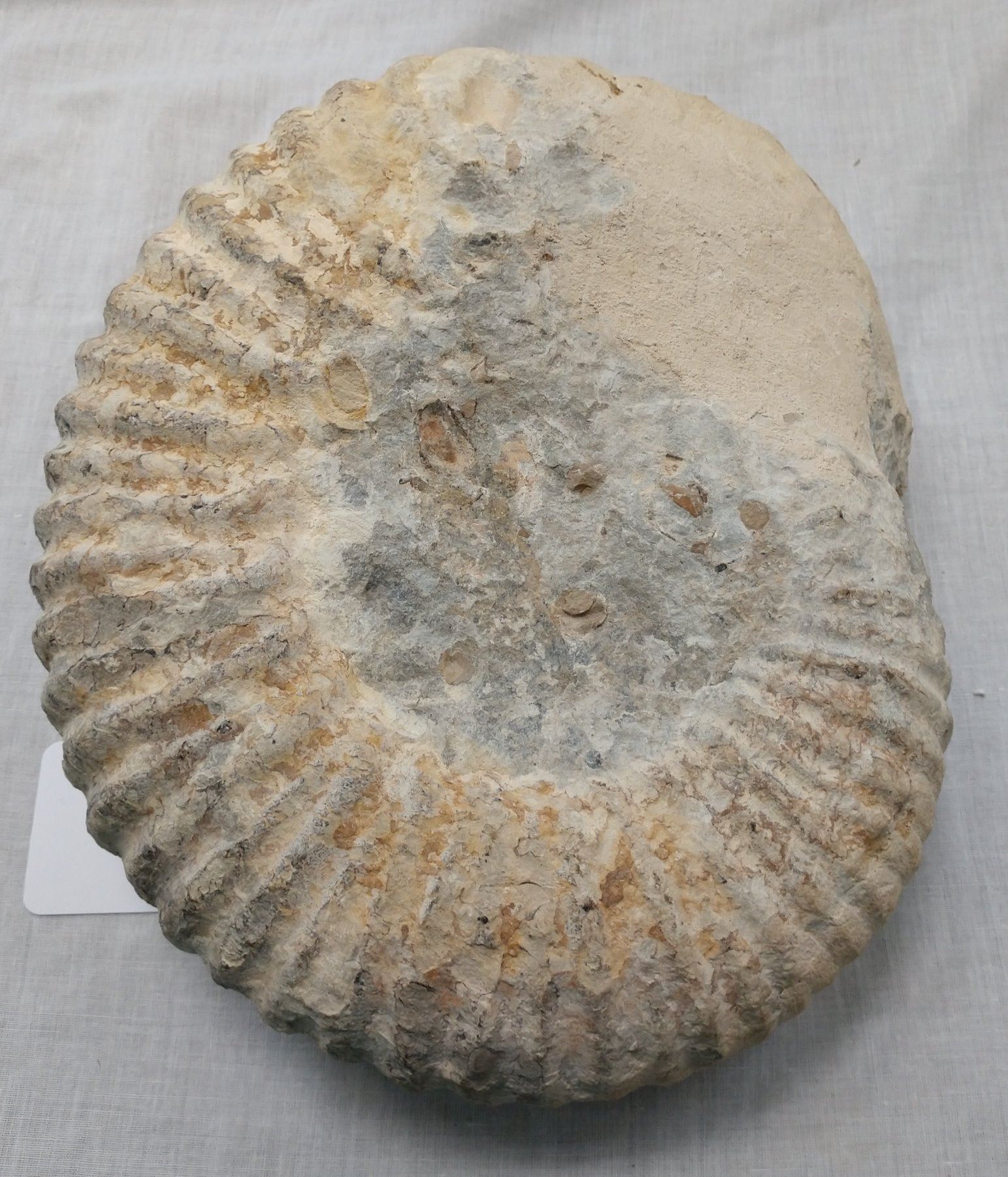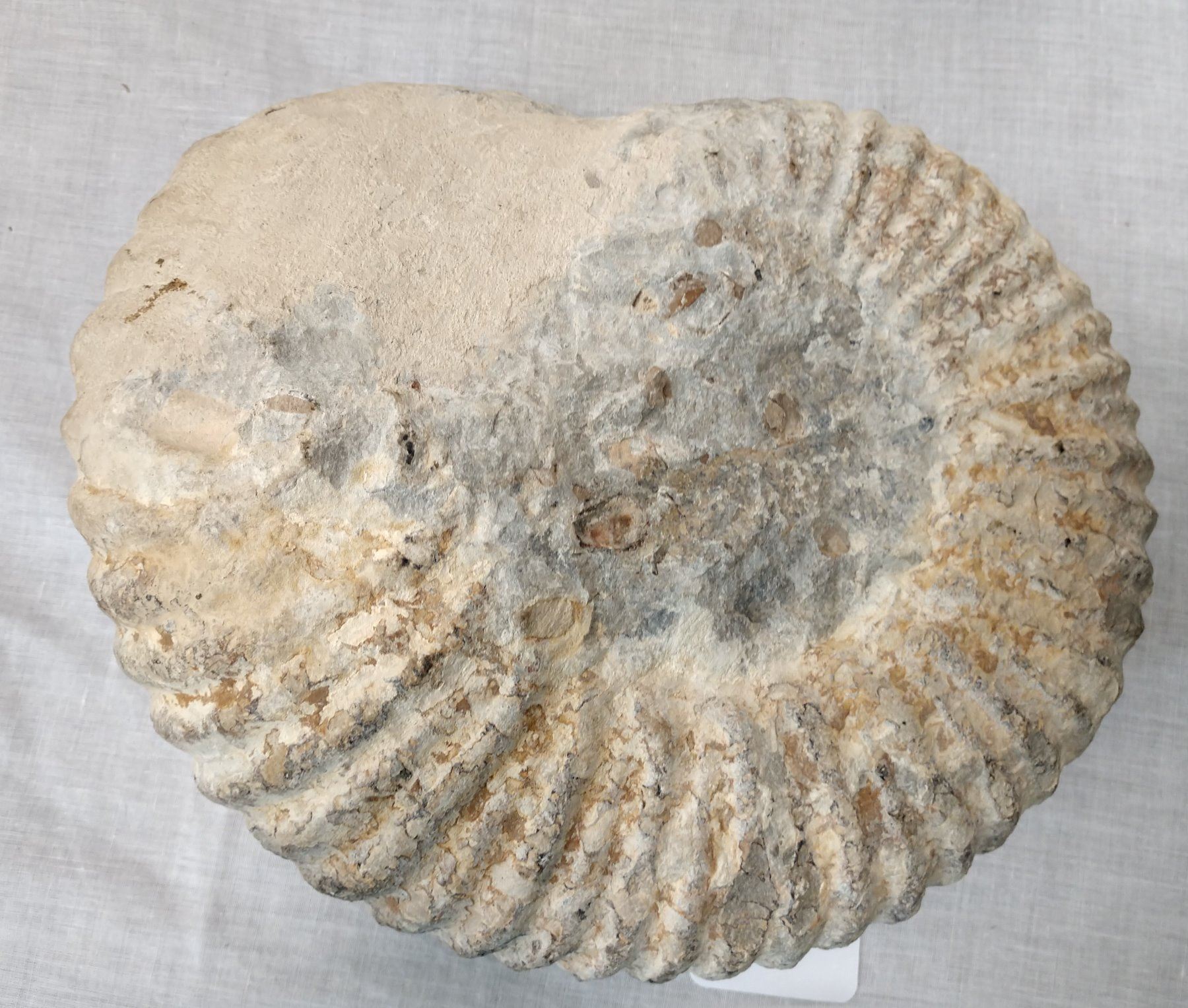 Large Fossil Ammonite, millions of years old. Made of sandstone, the item measures 10" in diameter. Weighs 16.5 pounds. Baja California, Mexico. Condition: As found, see images. Shipping: $26.00 w/insurance and signature, due to weight.