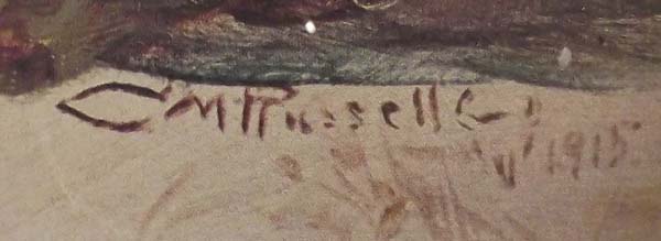 Large Framed C.M. Russell Print. Framed in a wood frame, double matted, under glass. Is loose in frame. Visual measures approx. 13 1/2''H x 19 1/2''W. All pictures will be sent without frame or glass when possible. Buyers Pay Actual Shipping and Handling Charges(see terms and conditions for more information).