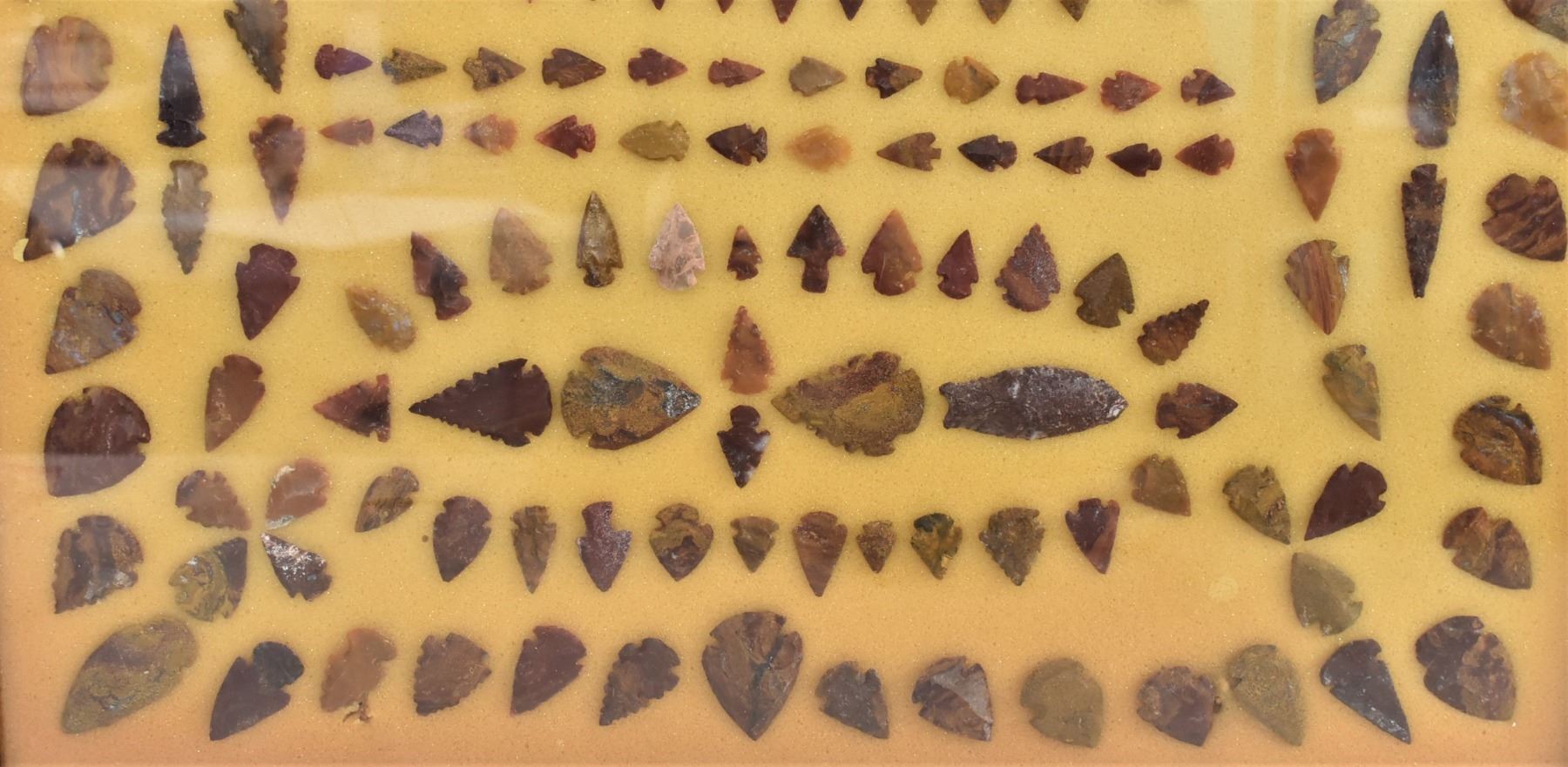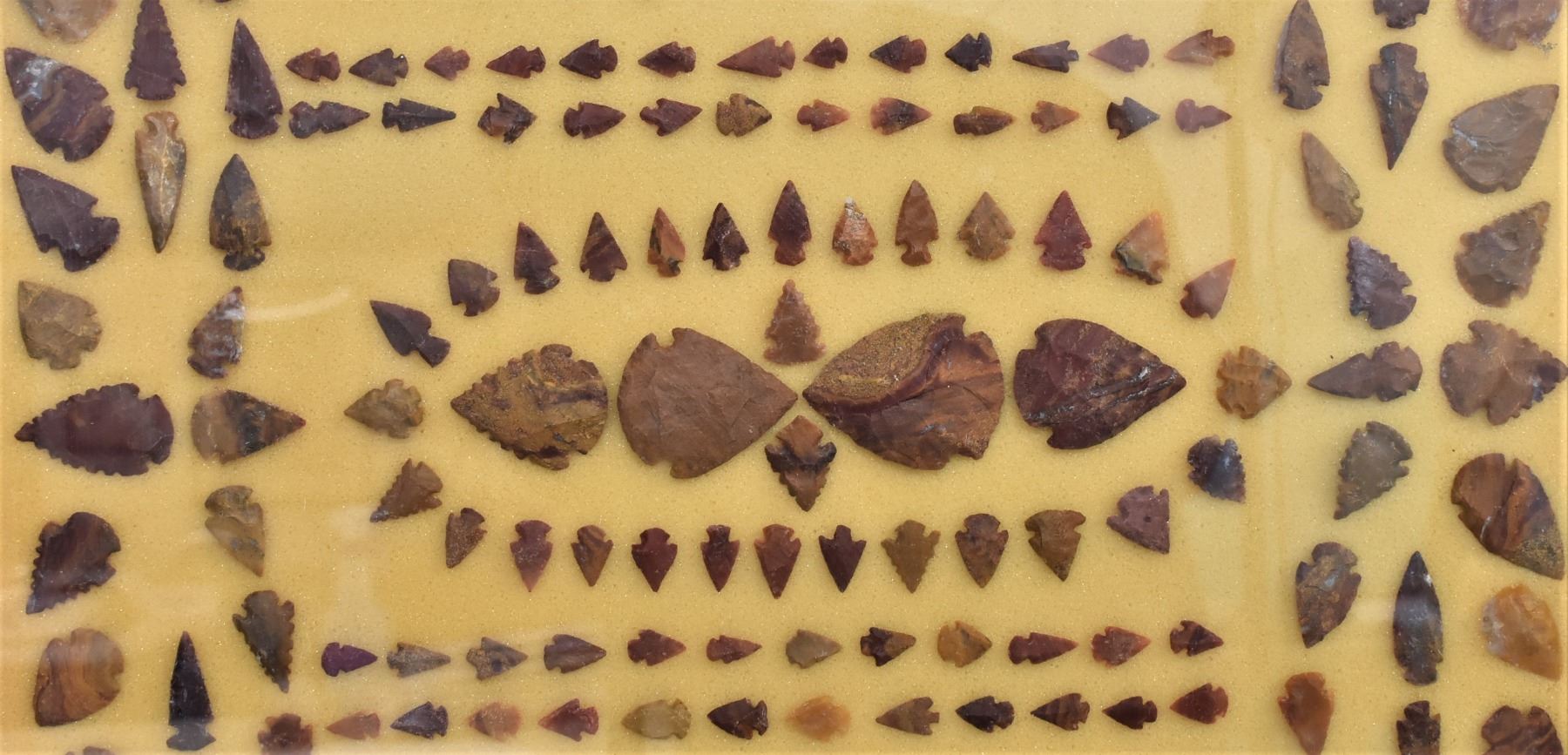 Large Framed Display of Arrowheads, age and origin unknown, largest arrowhead measures 2 3/8''L, framed display measures 21'' x 25''