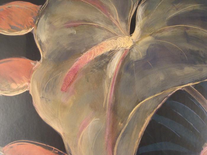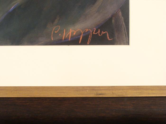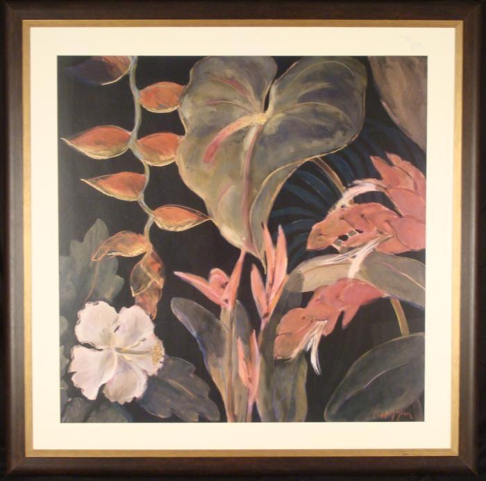 This large art print is an impressive close-up of flowers on a dark background. Medium: Print on paper Artist: P. HopperImage size: 34 1/2 inches square Framing: In off-white matting, in dark wood rounded frameFrame size: 45 inches squareCondition: Excellent; sticker residue on glass, could be cleaned off This is a fine, and nicely framed floral image.