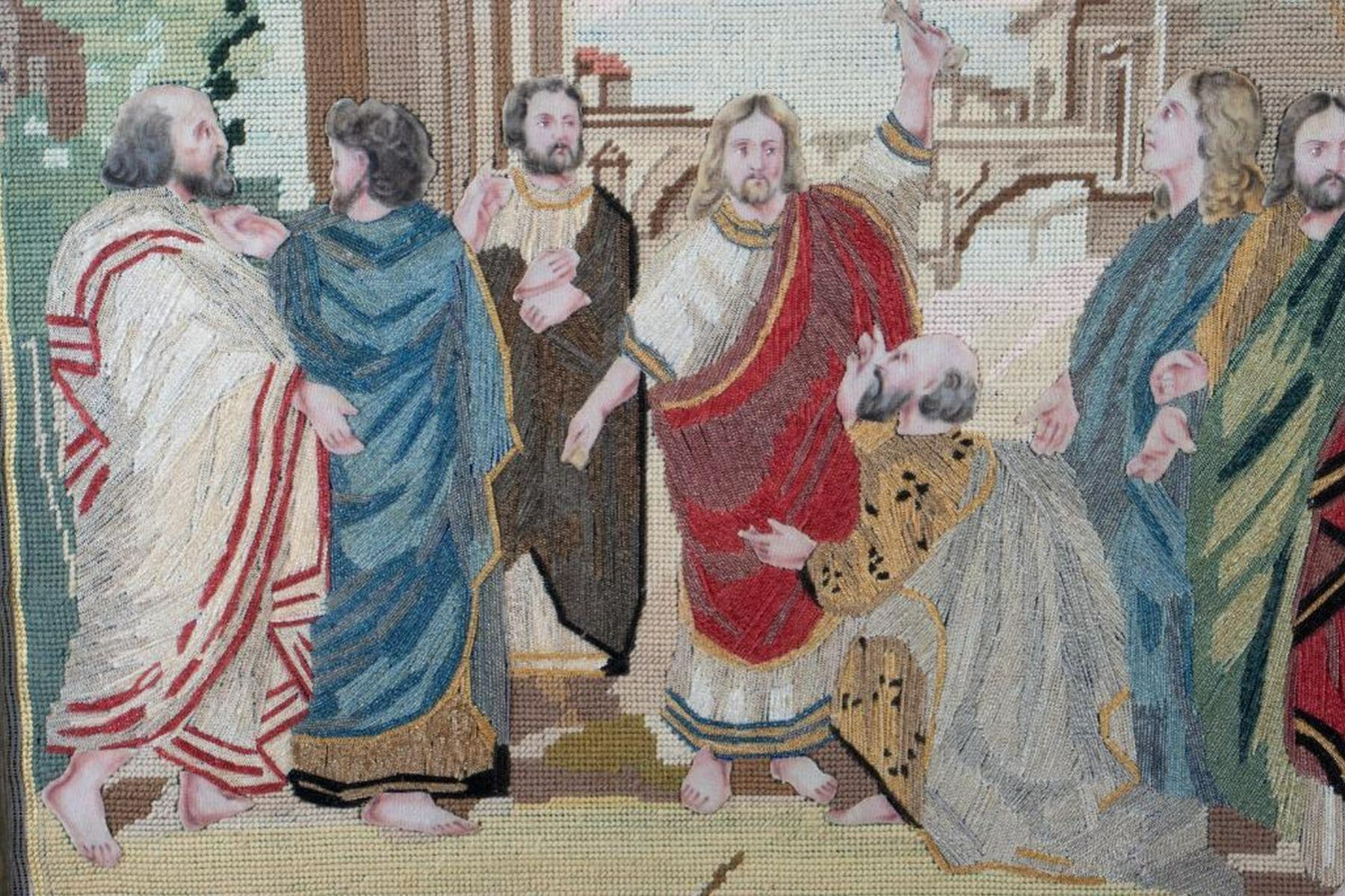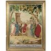 The figures are fils de soie embroidery in a needlepoint landscape with buildings; the faces, hands, and feet are painted cloth. In needlework at the bottom: "Jesus Remettant Les Clefs a St. Pierre." 29 1/8in. x 21 7/8in. (sight); 33 1/2in. x 26in. (frame). Good condition.