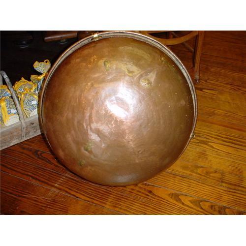 It is a hand hammered piece, made in the Mid. 1800's. This large copper bowl was used to make chocolate or jams. H-8.25"/ Diameter-22".