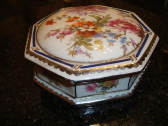 Authentic large porcelain Limoges box with its lid signed by artist from a famous studio! This box was created by an artist, graduate of one of the most prestigious French Fine Porcelain schools. Very good condition. This Limoges box is marked "M. & Cie, Limoges", as shown in picture. It is in very good condition (No chips, cracks or repairs). Would be a great value to any Limoges box collection. h-2.25"/ w-5.5"/ d-5.5" We ship from Texas (not from France)!